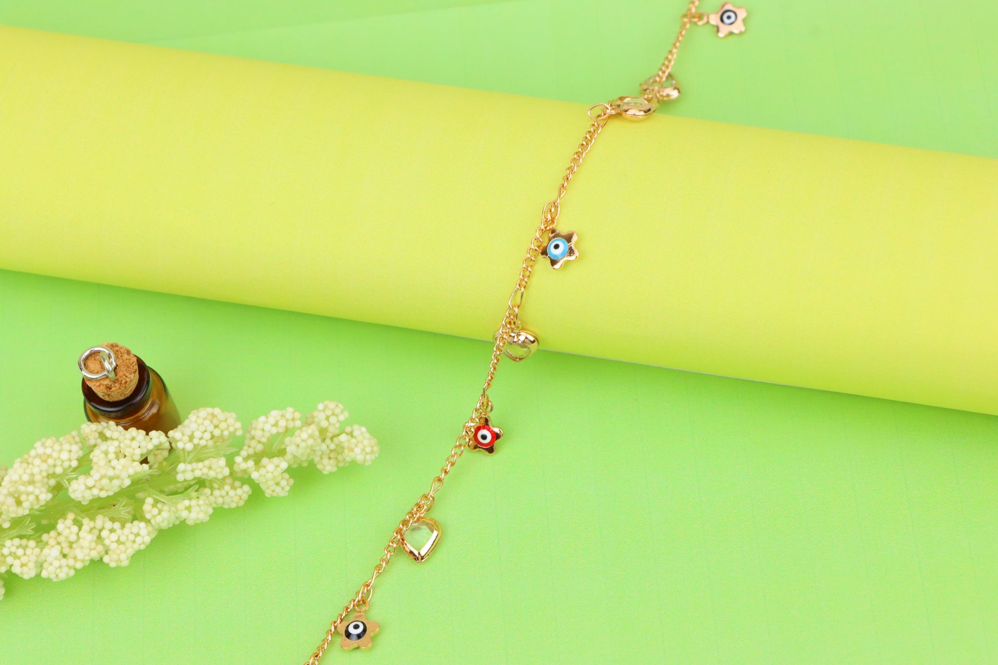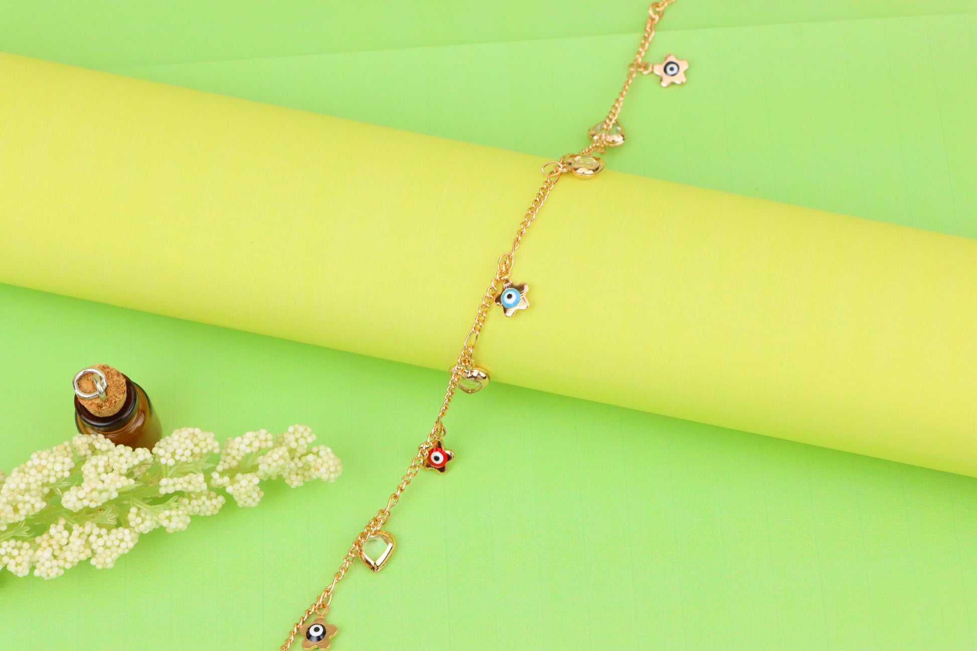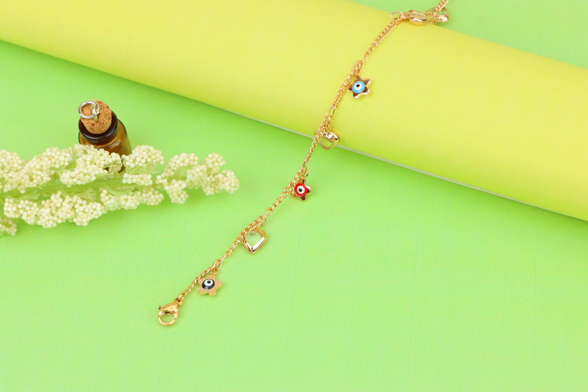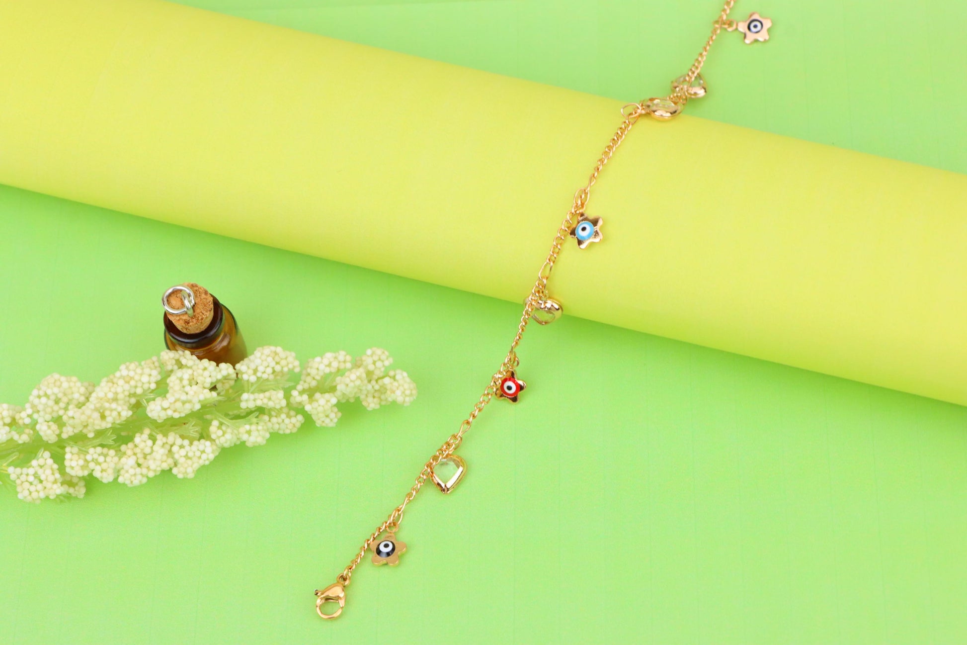 ✔ Features vibrant evil eye flower charms with heart pendants