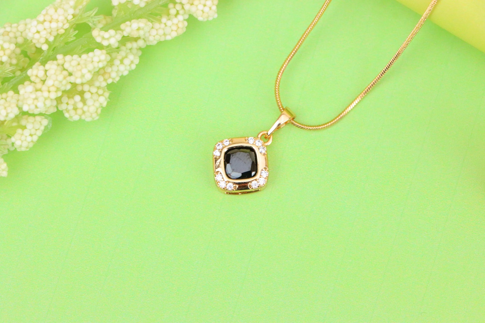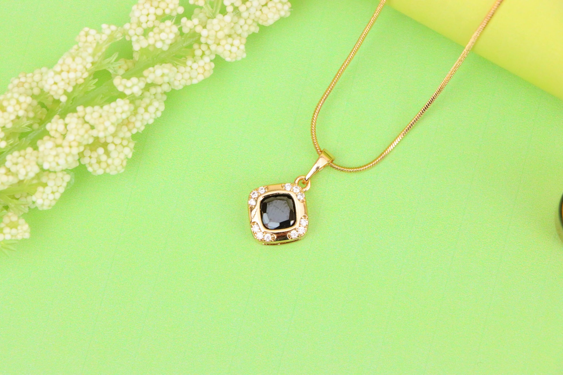 Sophisticated black pendant with a cushion-cut stone framed by clear crystals. Crafted from gold-plated high quality brass for striking contrast and elegance.