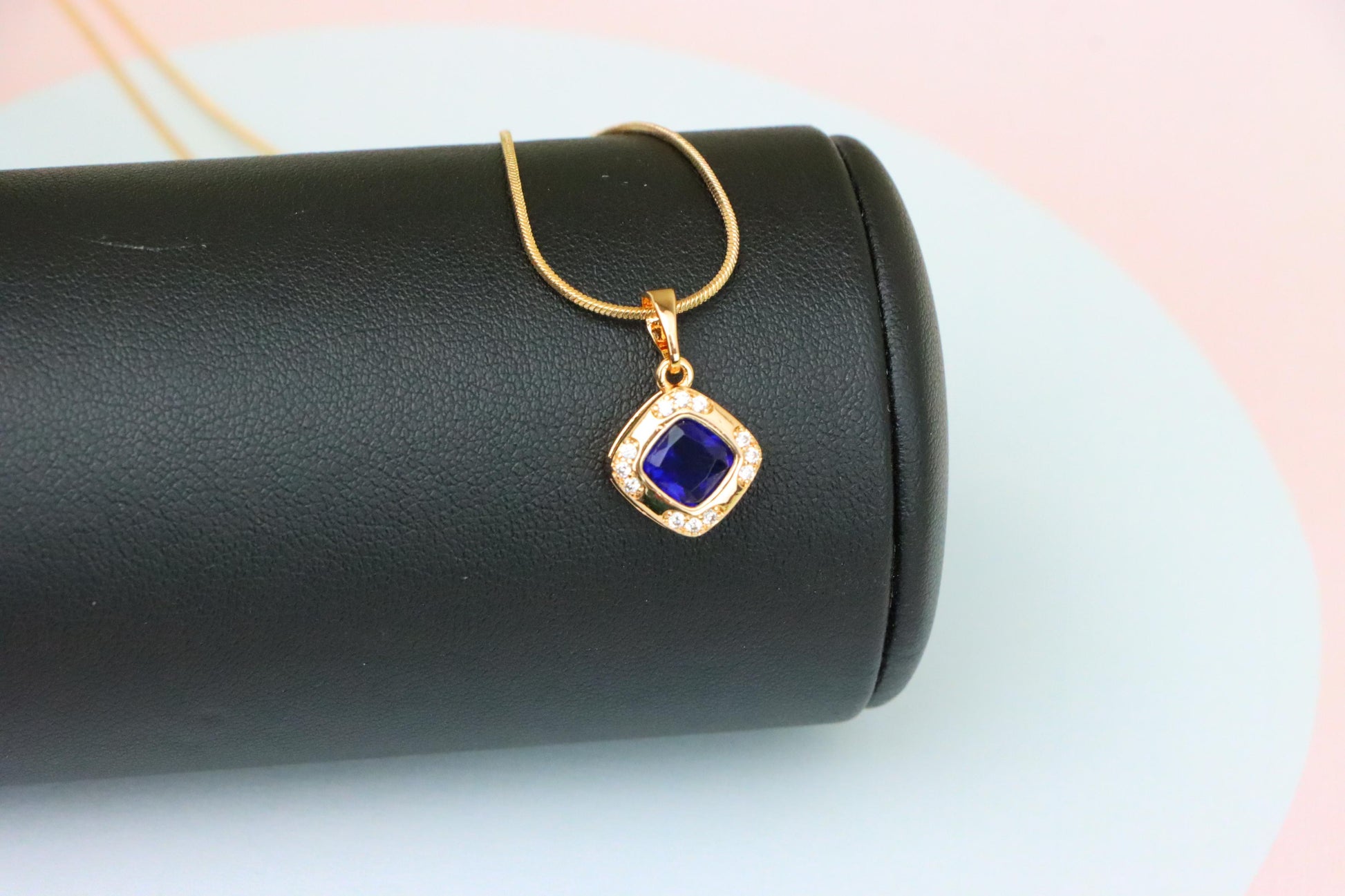 Luxurious blue pendant with a cushion-cut stone and halo of crystals. Crafted from gold-plated high quality brass, ideal for refined everyday or event wear.
