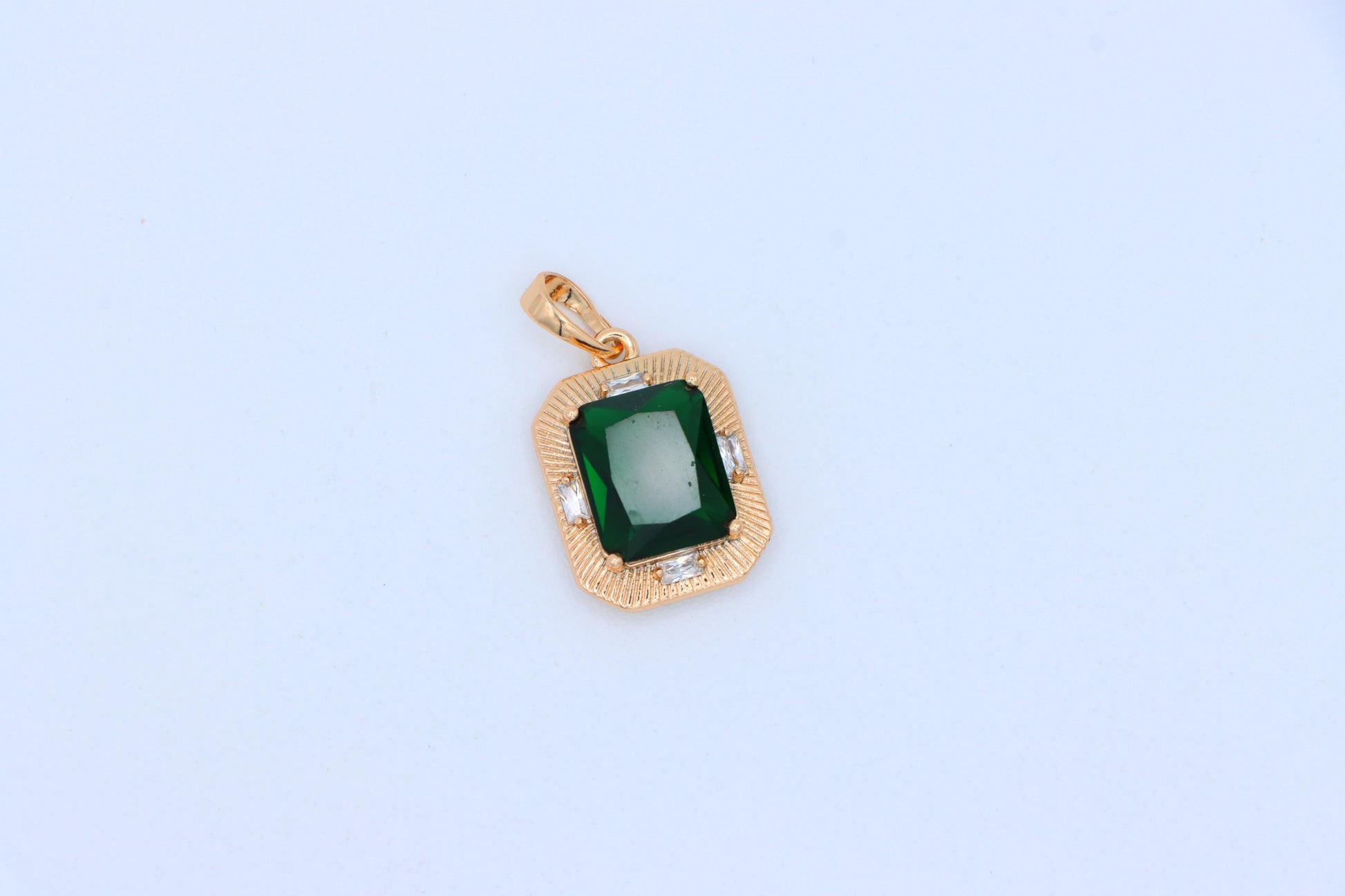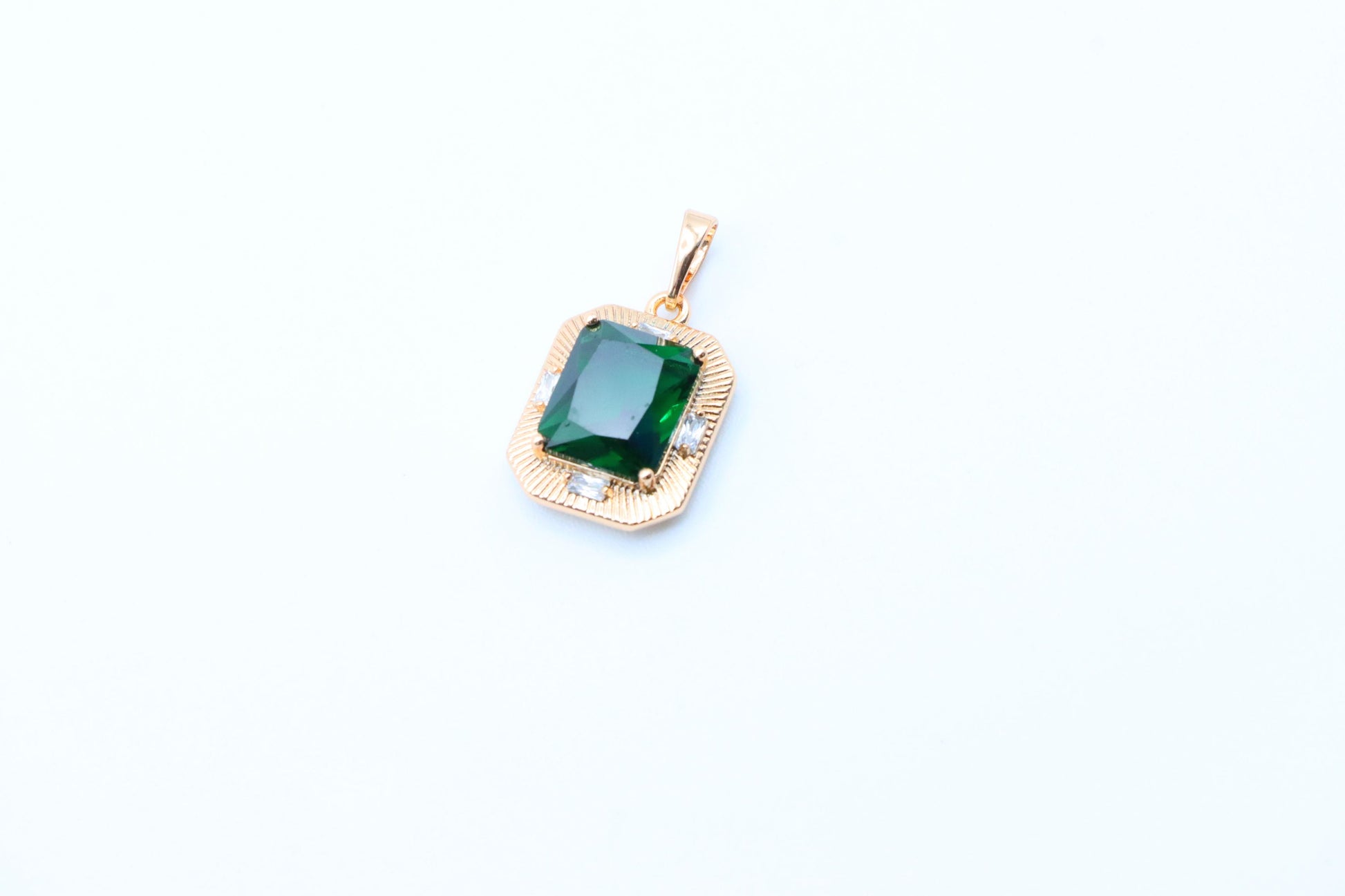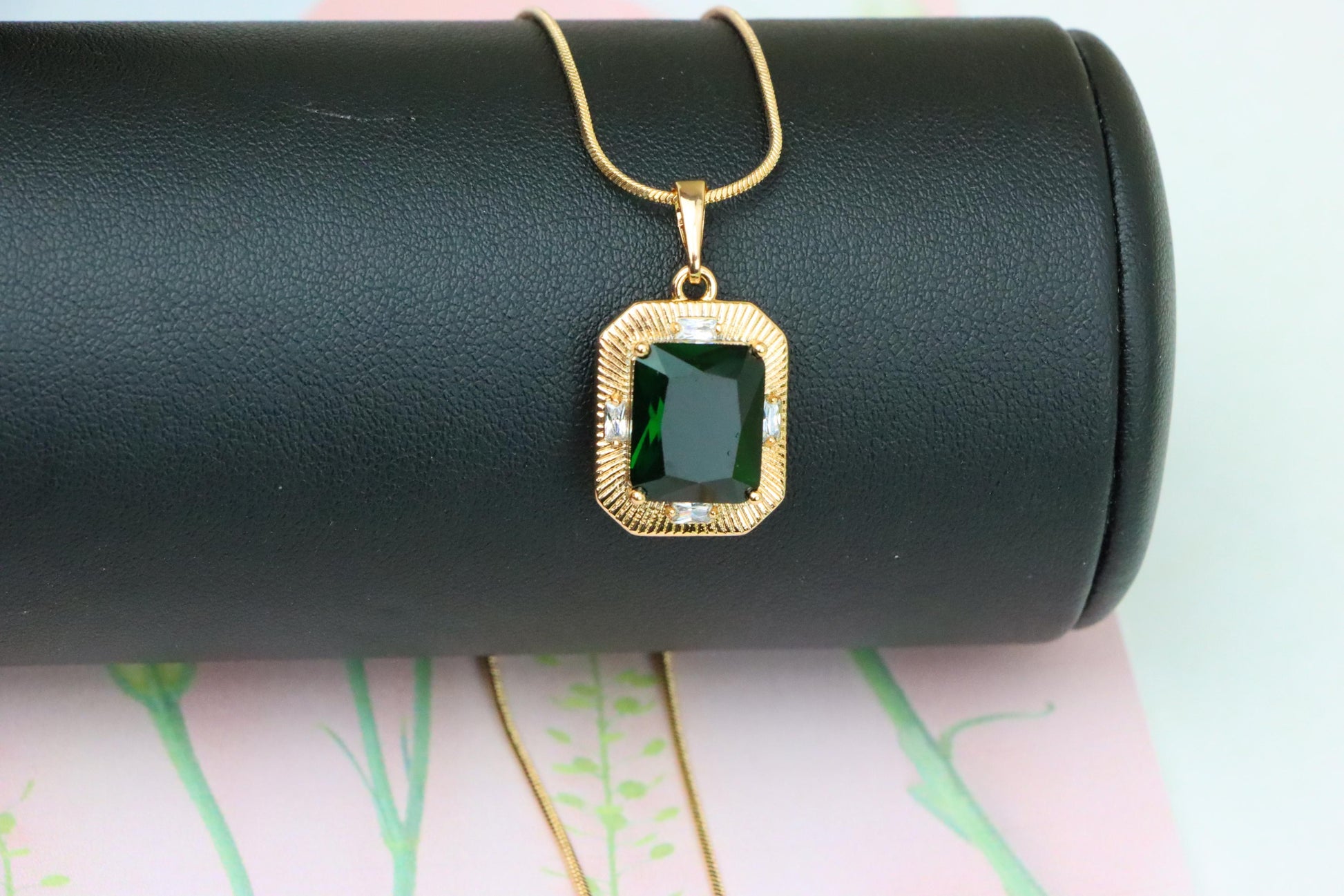 A striking green pendant featuring a bold emerald-cut stone set in a detailed textured frame, offering timeless charm with a modern edge.