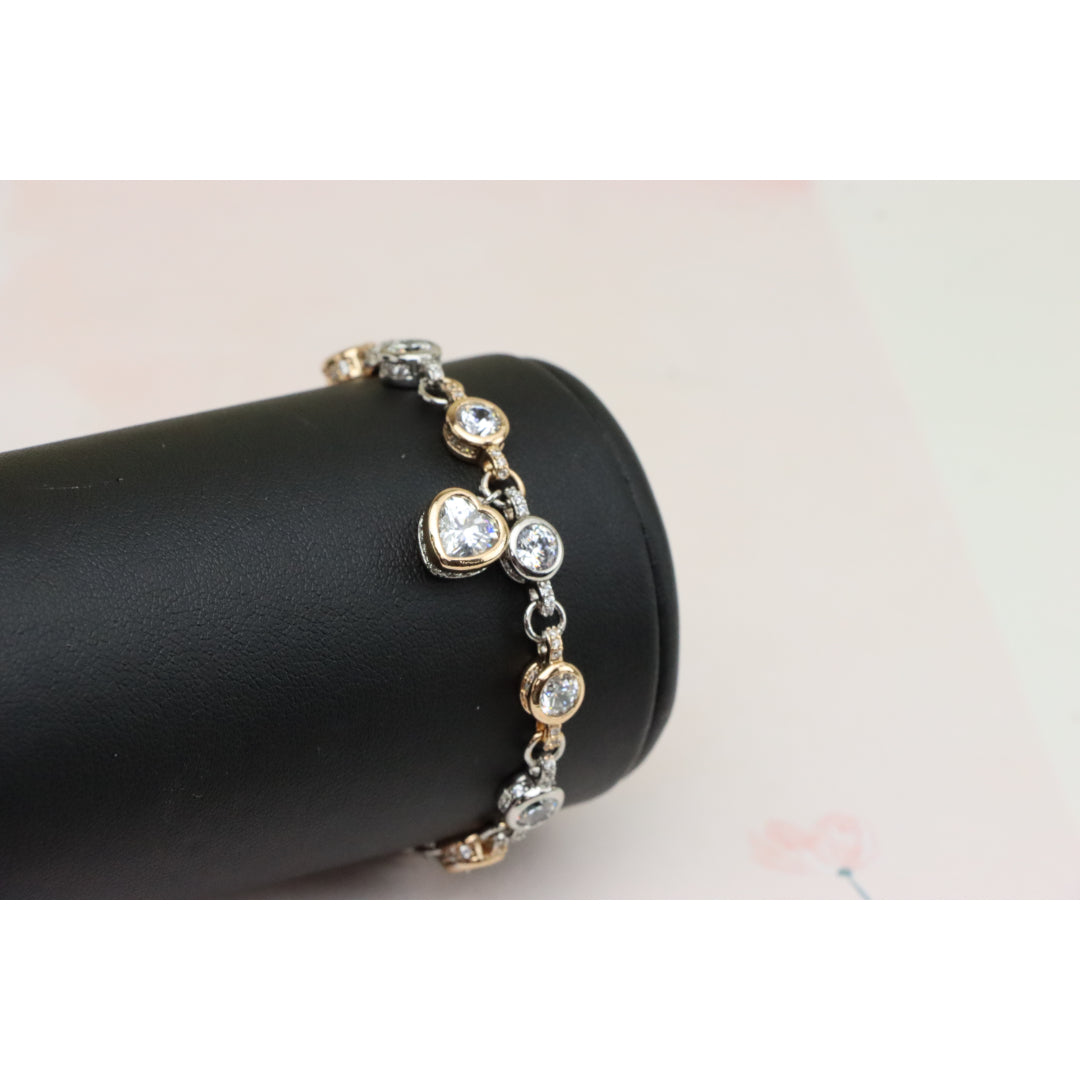 Elegant rose gold and silver tone bracelet featuring round and heart-cut crystals.
