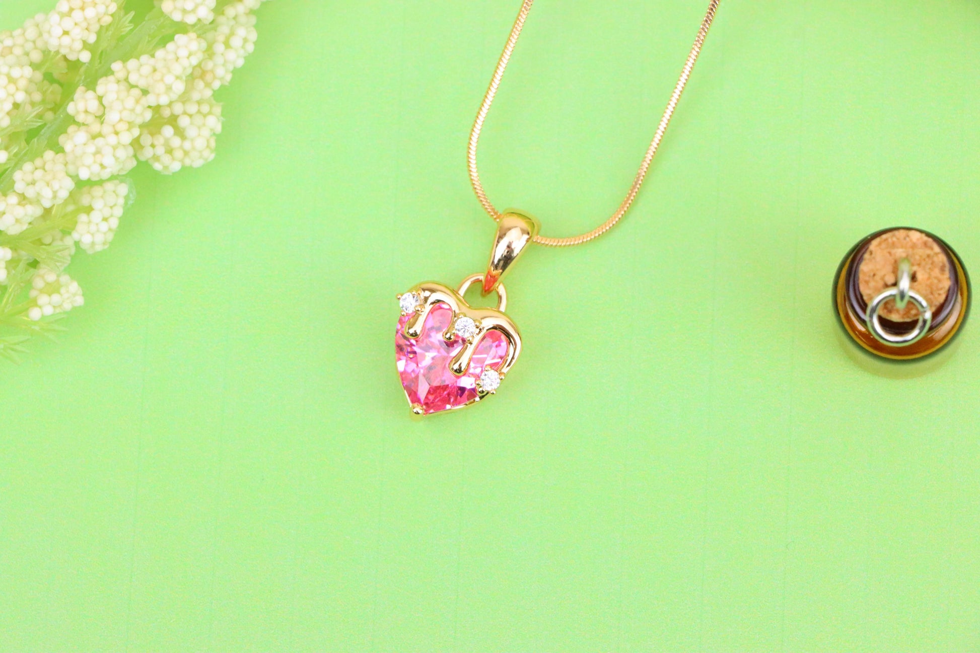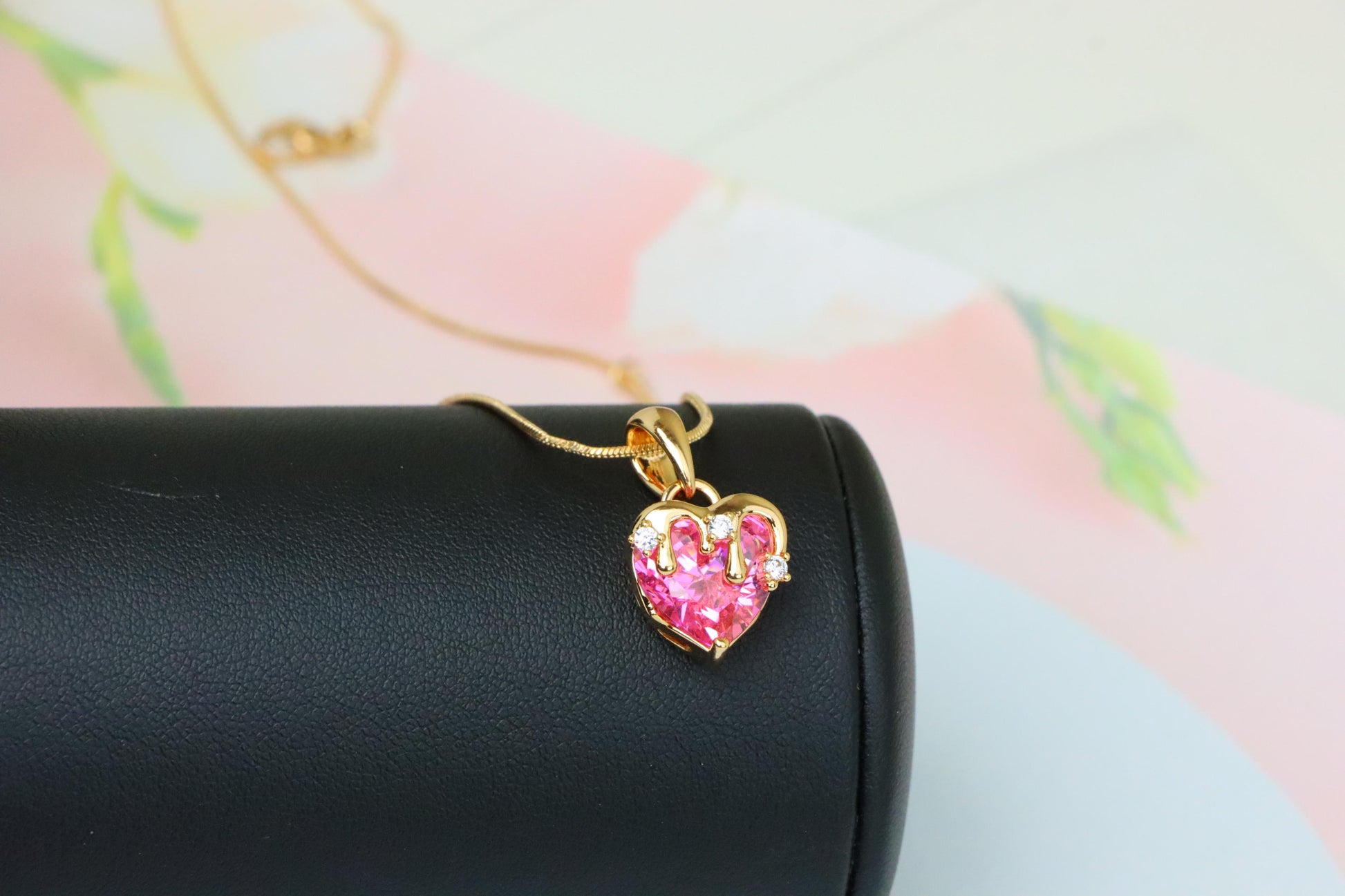 Elegant pink heart pendant with glossy gold drip design and CZ sparkle.