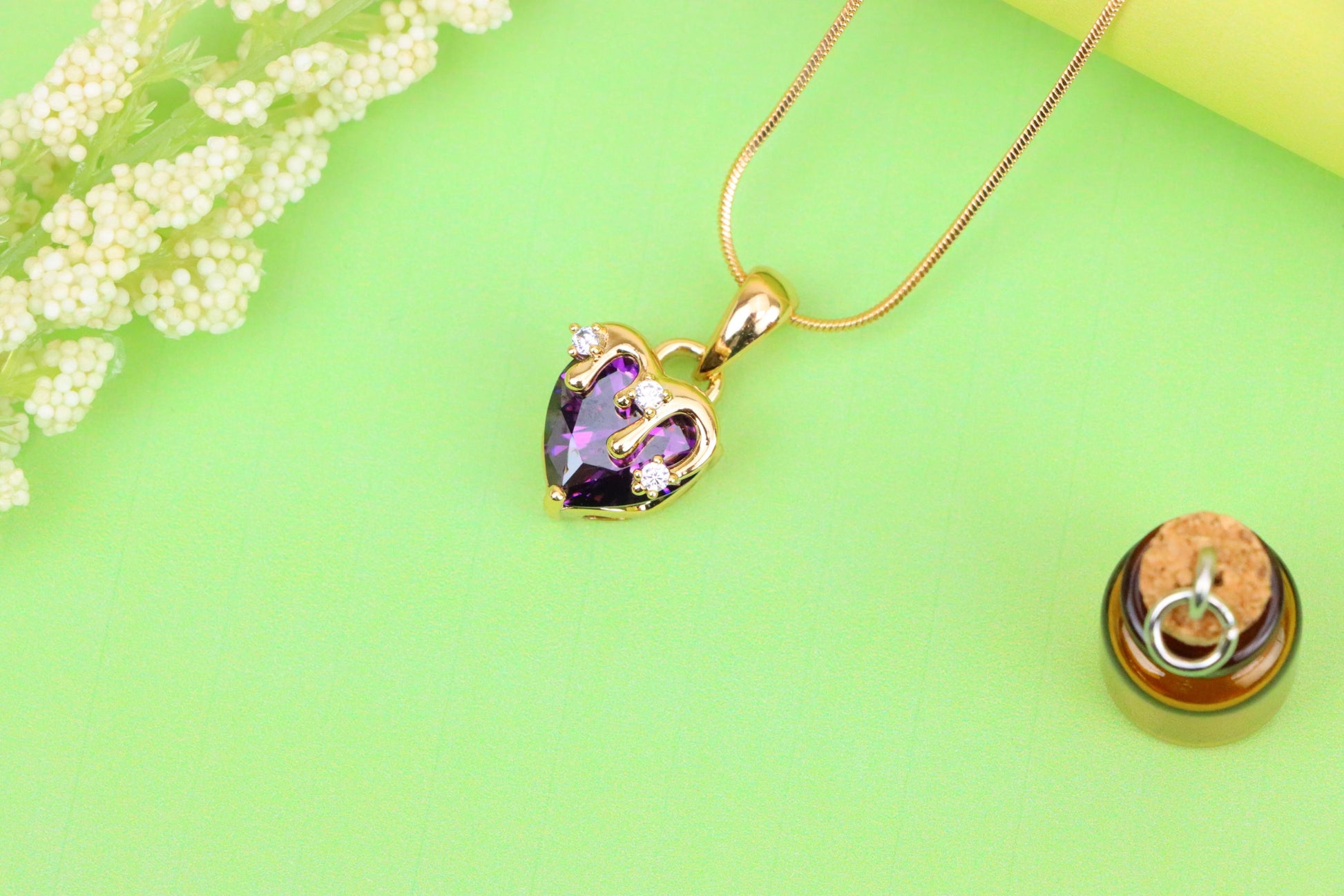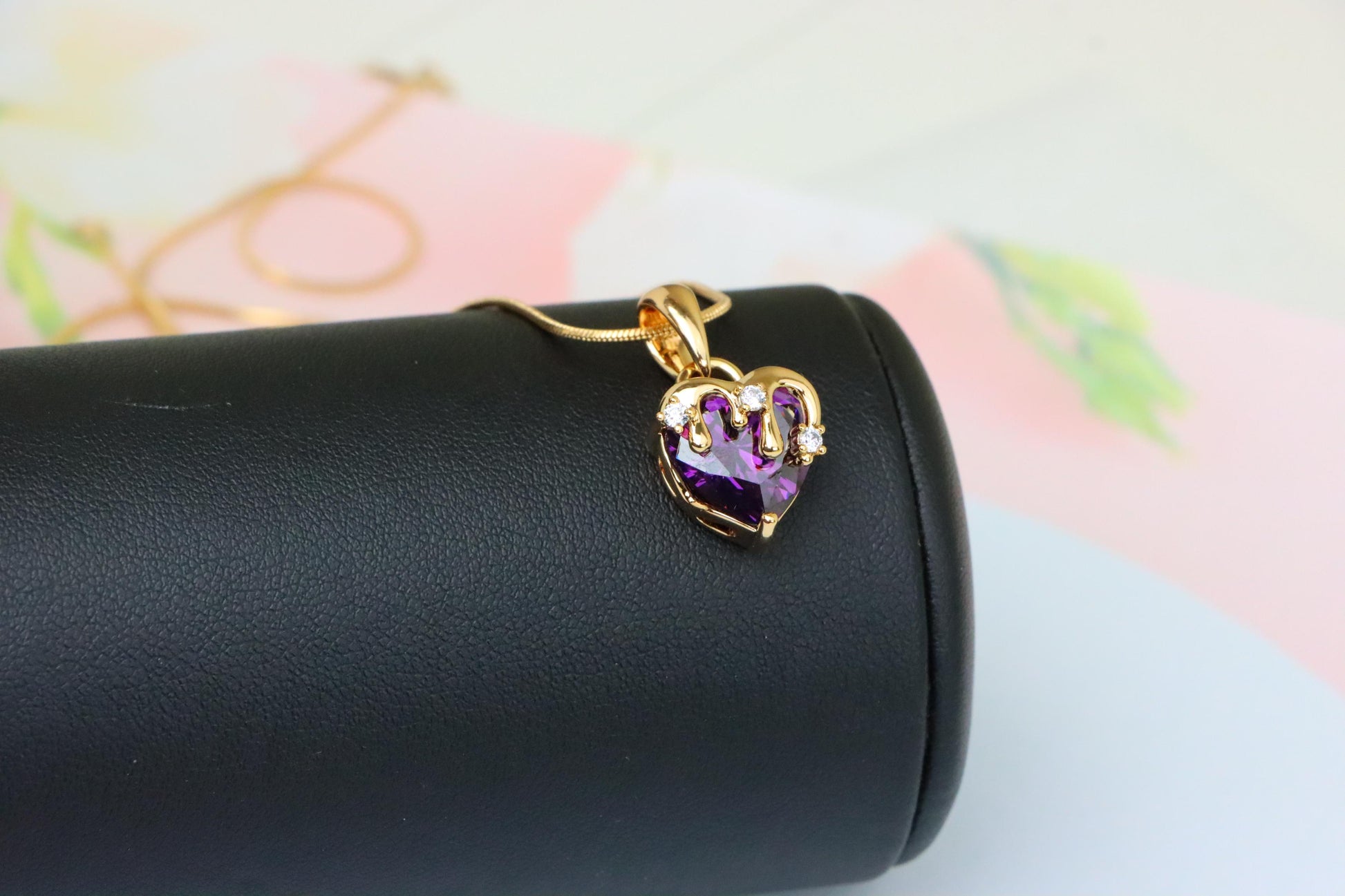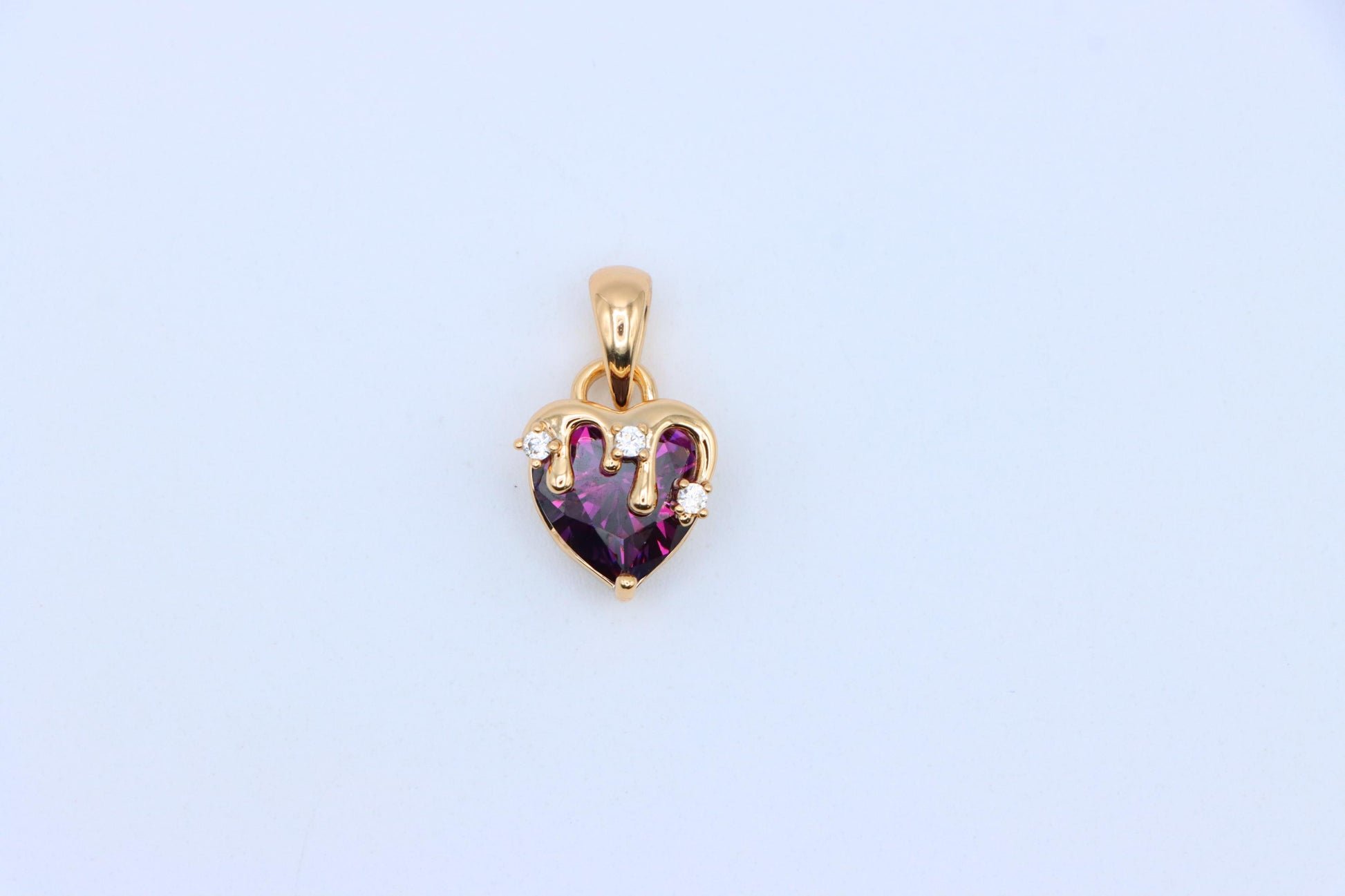 Vibrant purple heart pendant with a glossy gold drip and crystal accents.