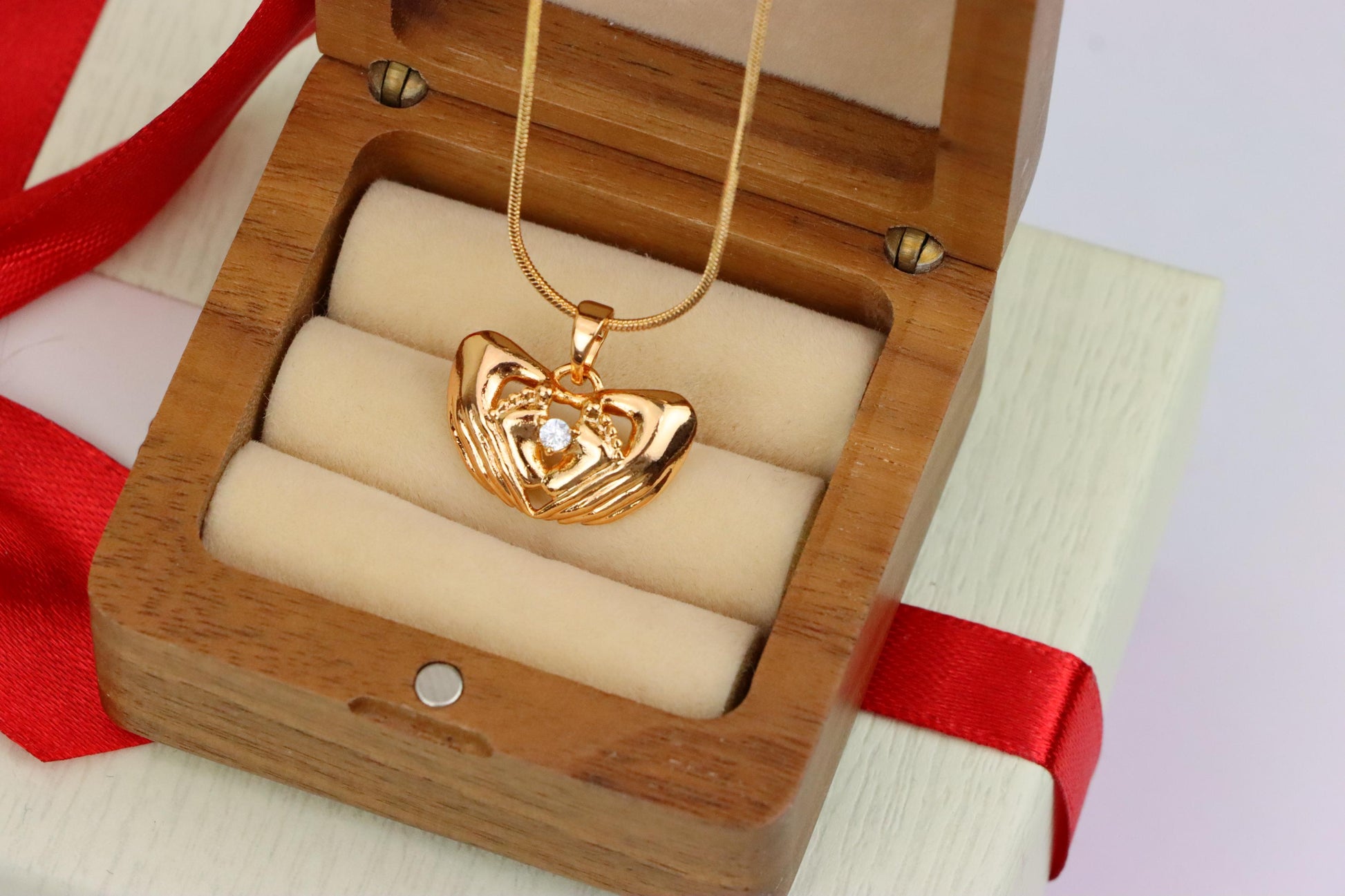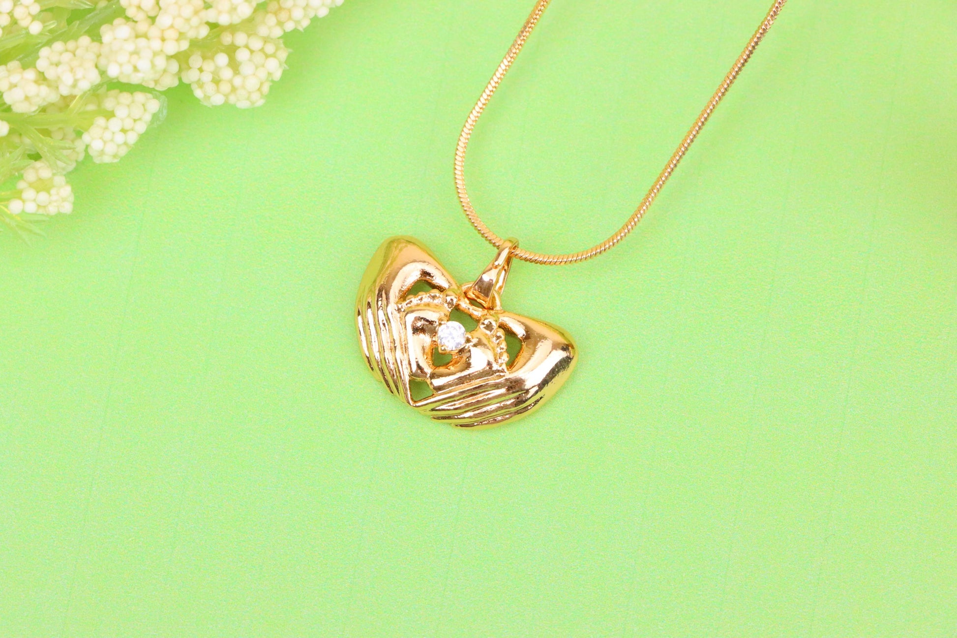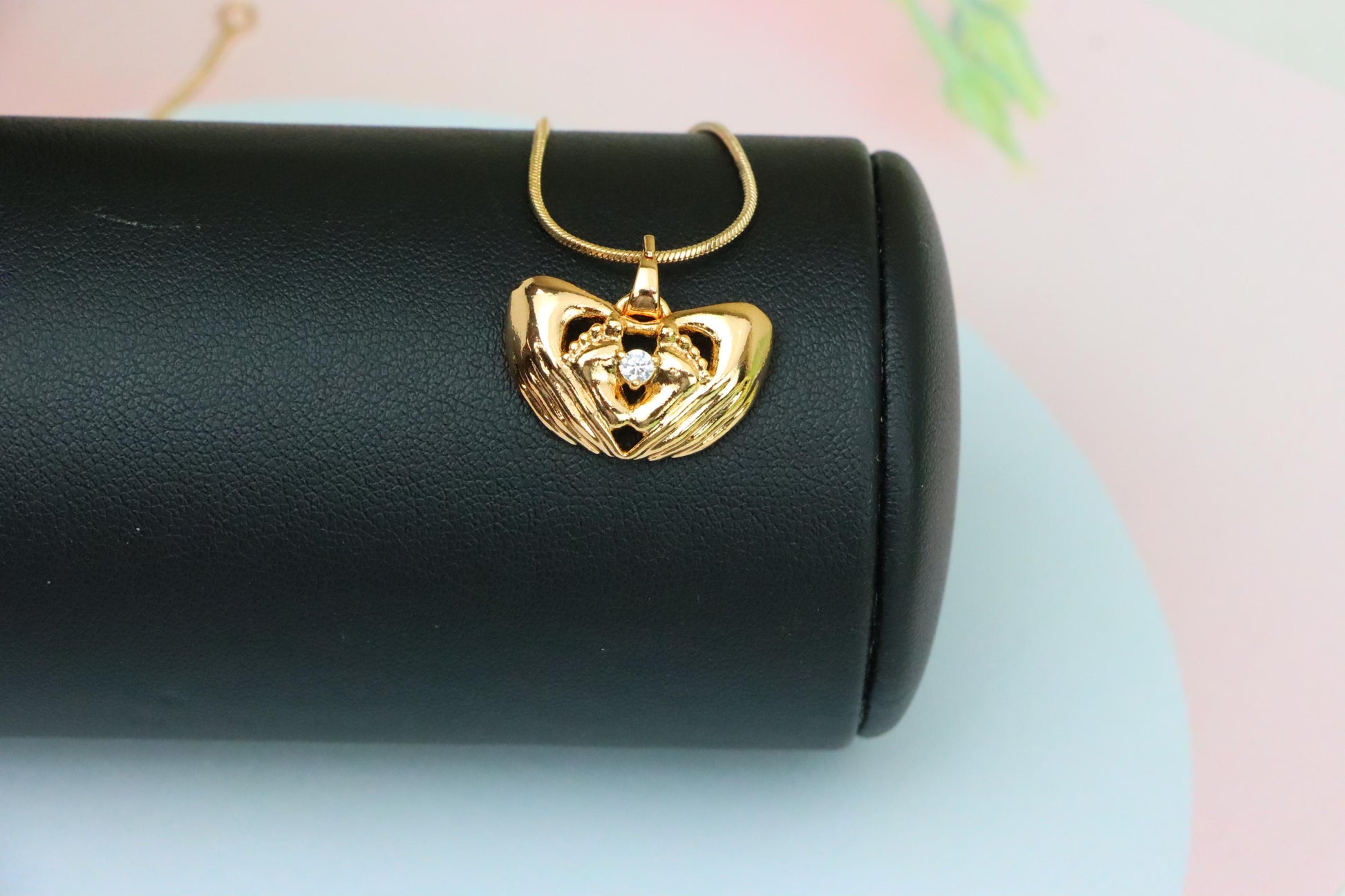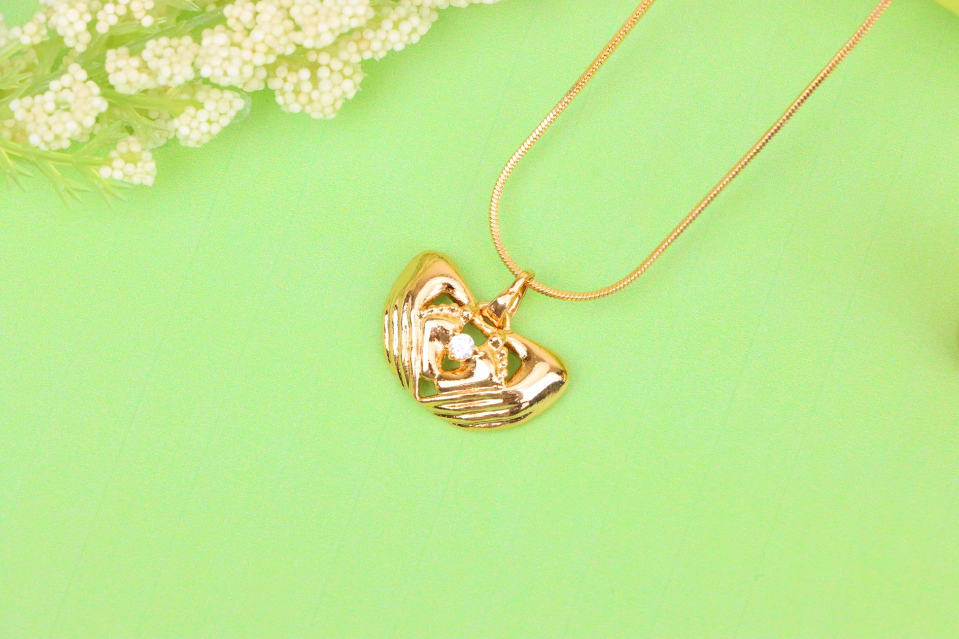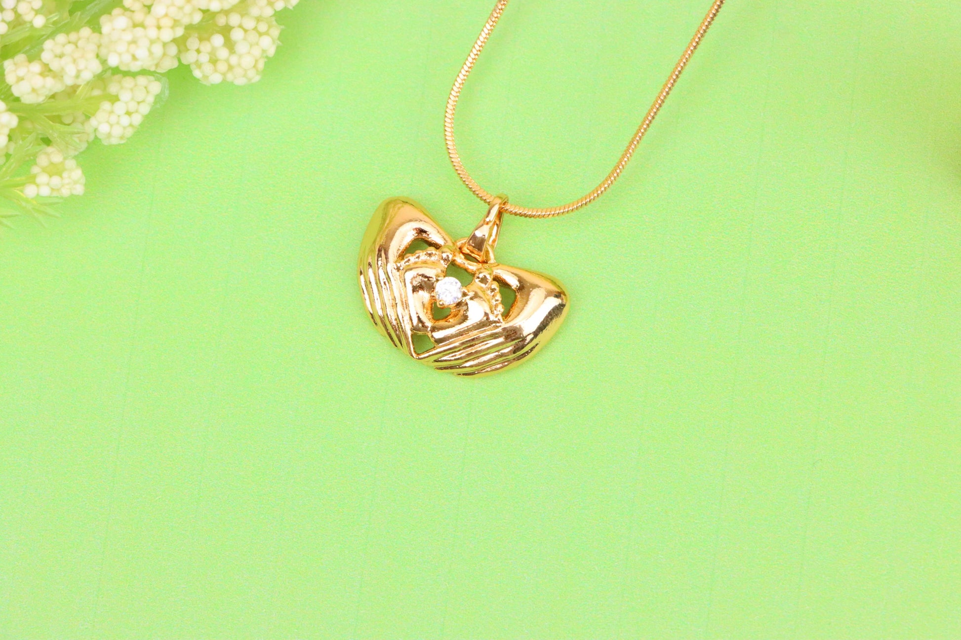 Stylish rose gold pendant with a symbolic hand embrace and central crystal.