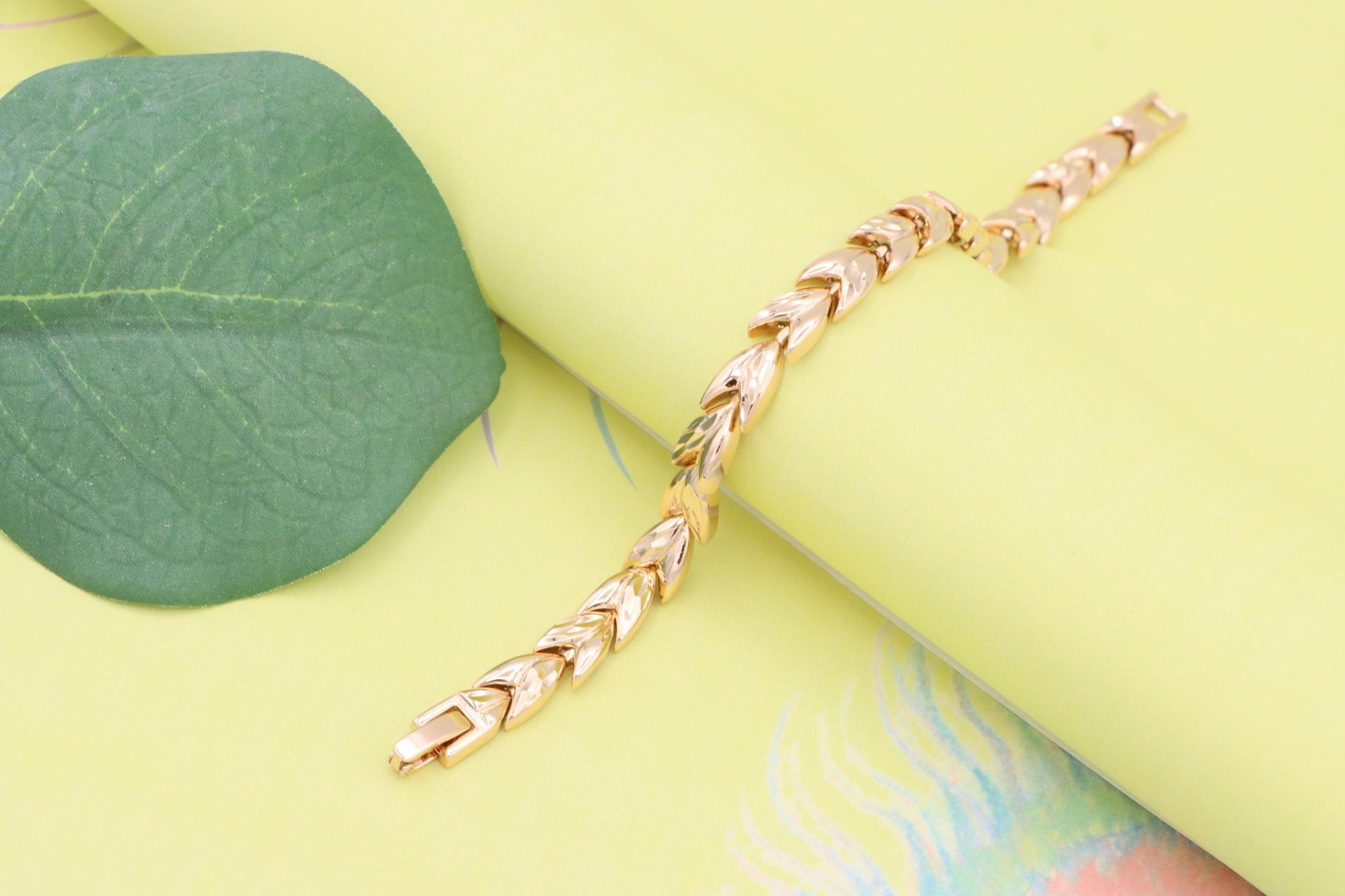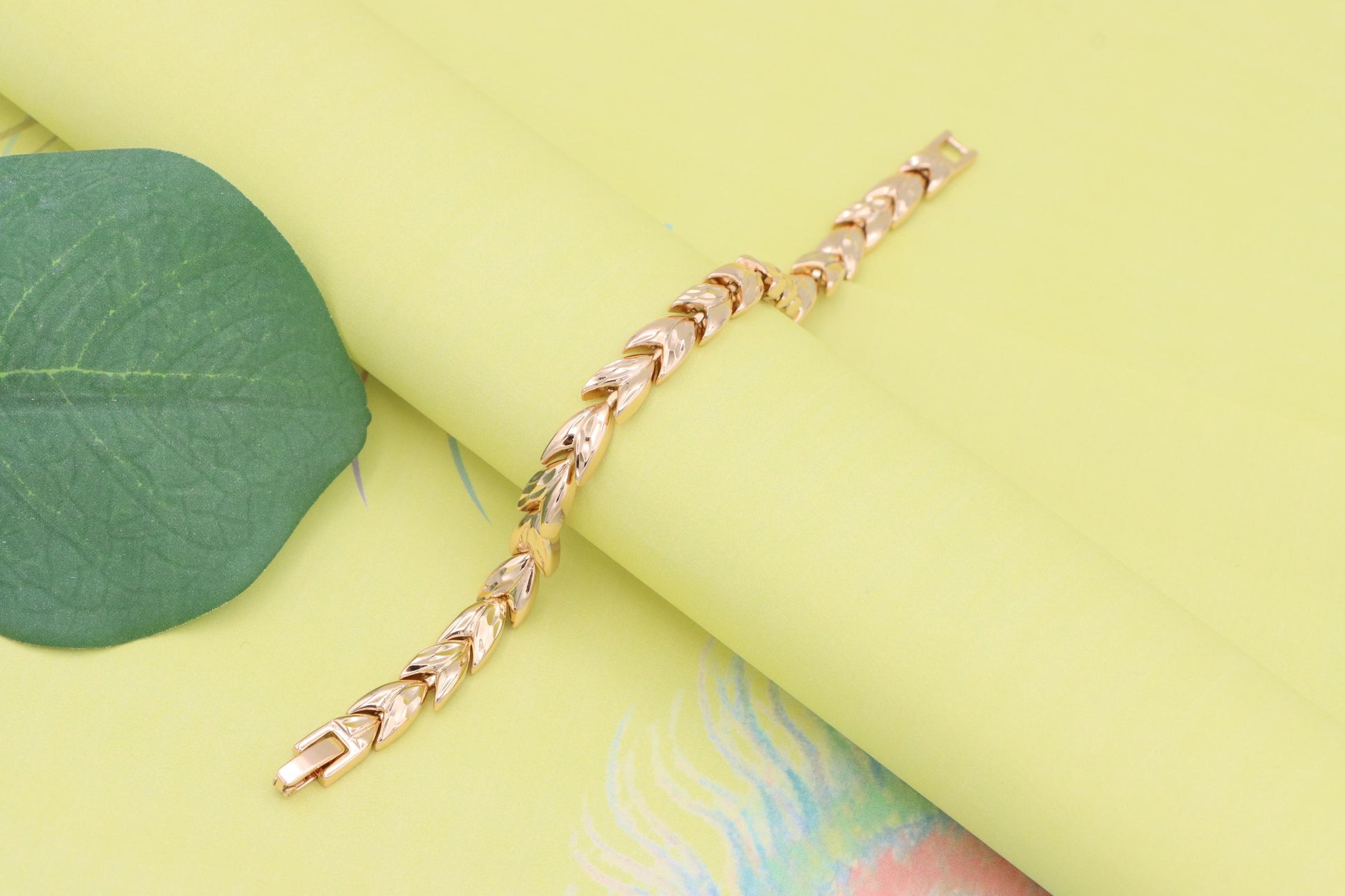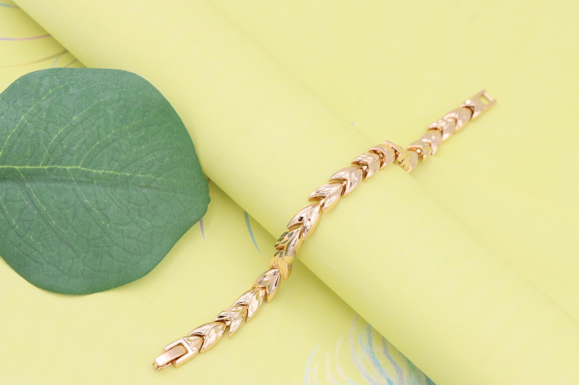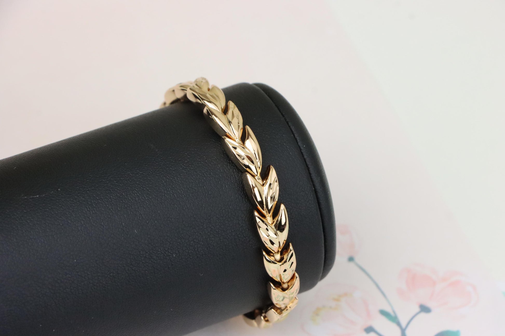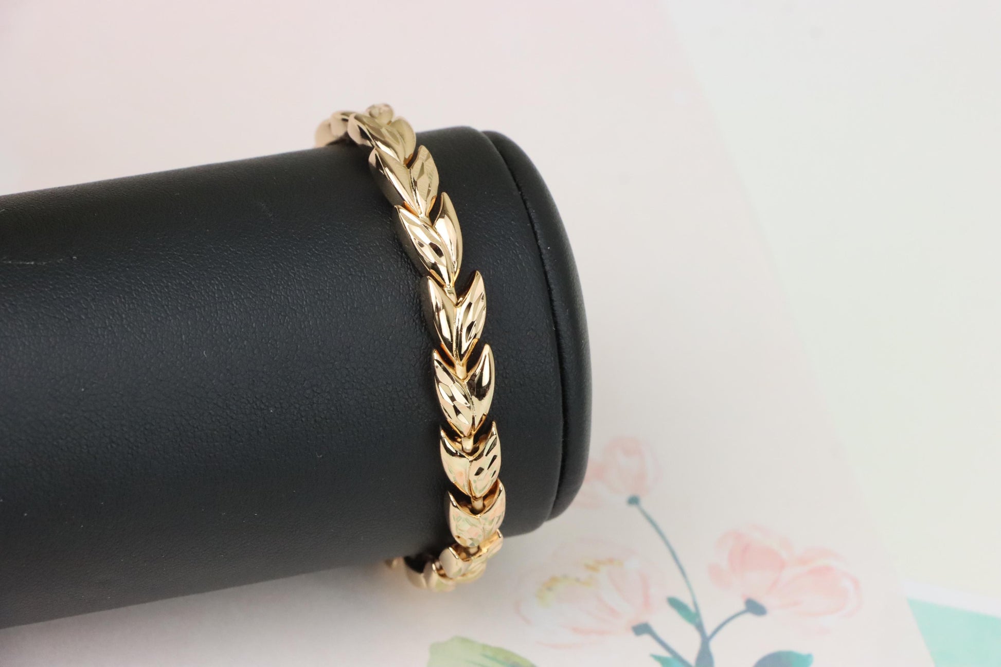Elegant rose gold bracelet crafted with a unique leaf link pattern.