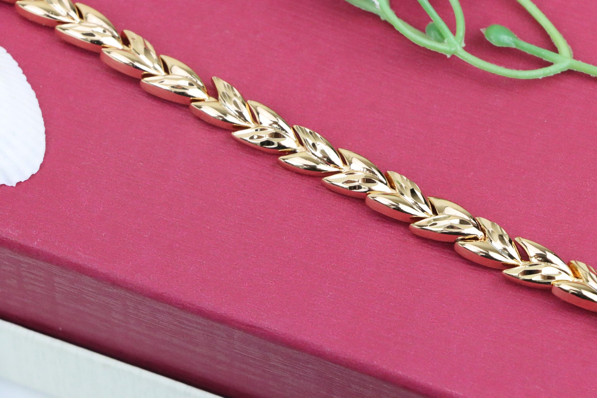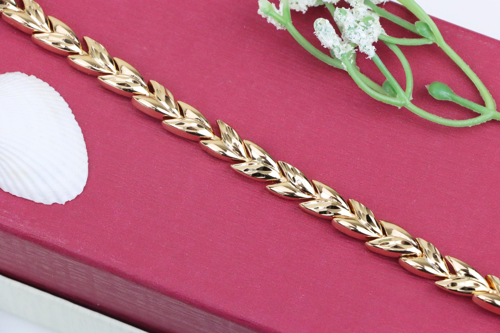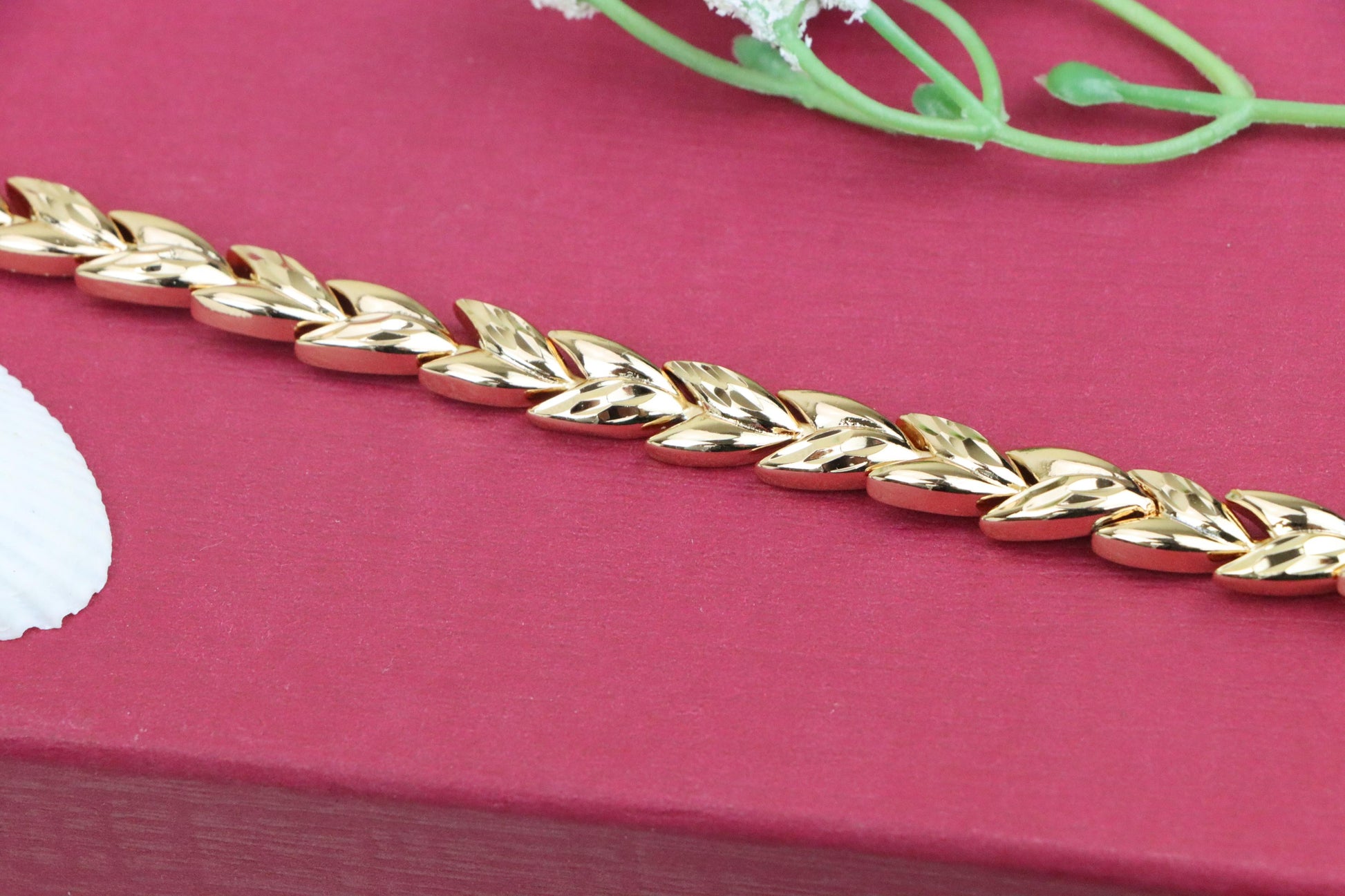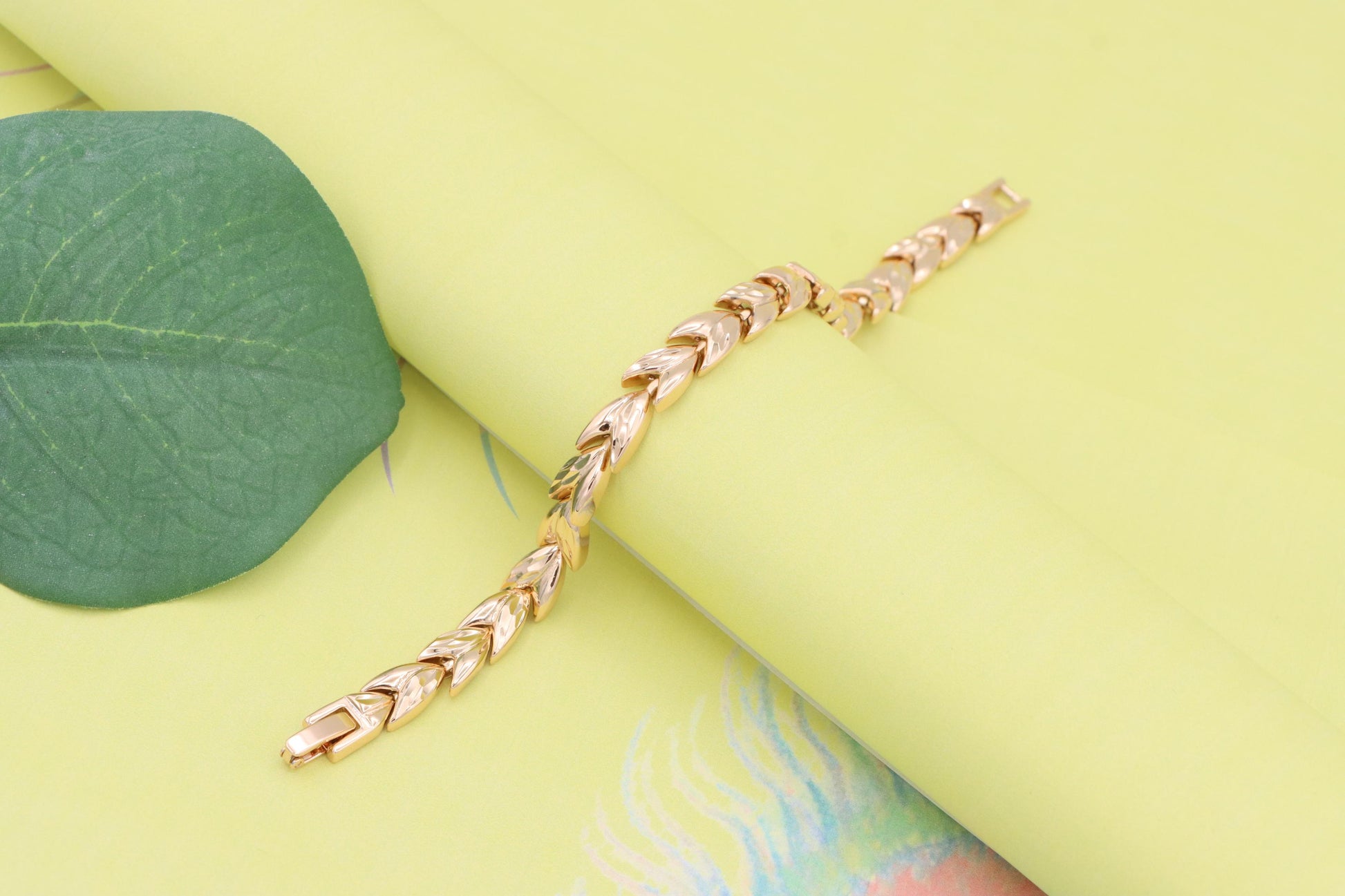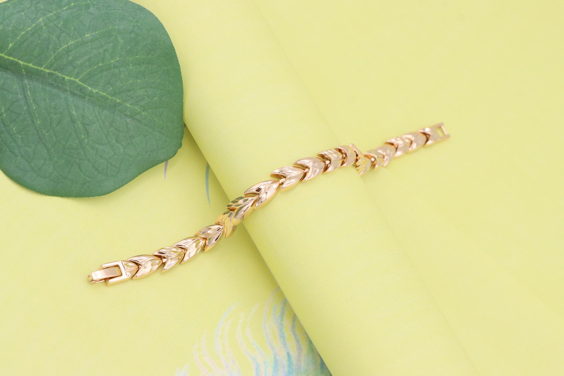 Elegant rose gold bracelet crafted with a unique leaf link pattern.