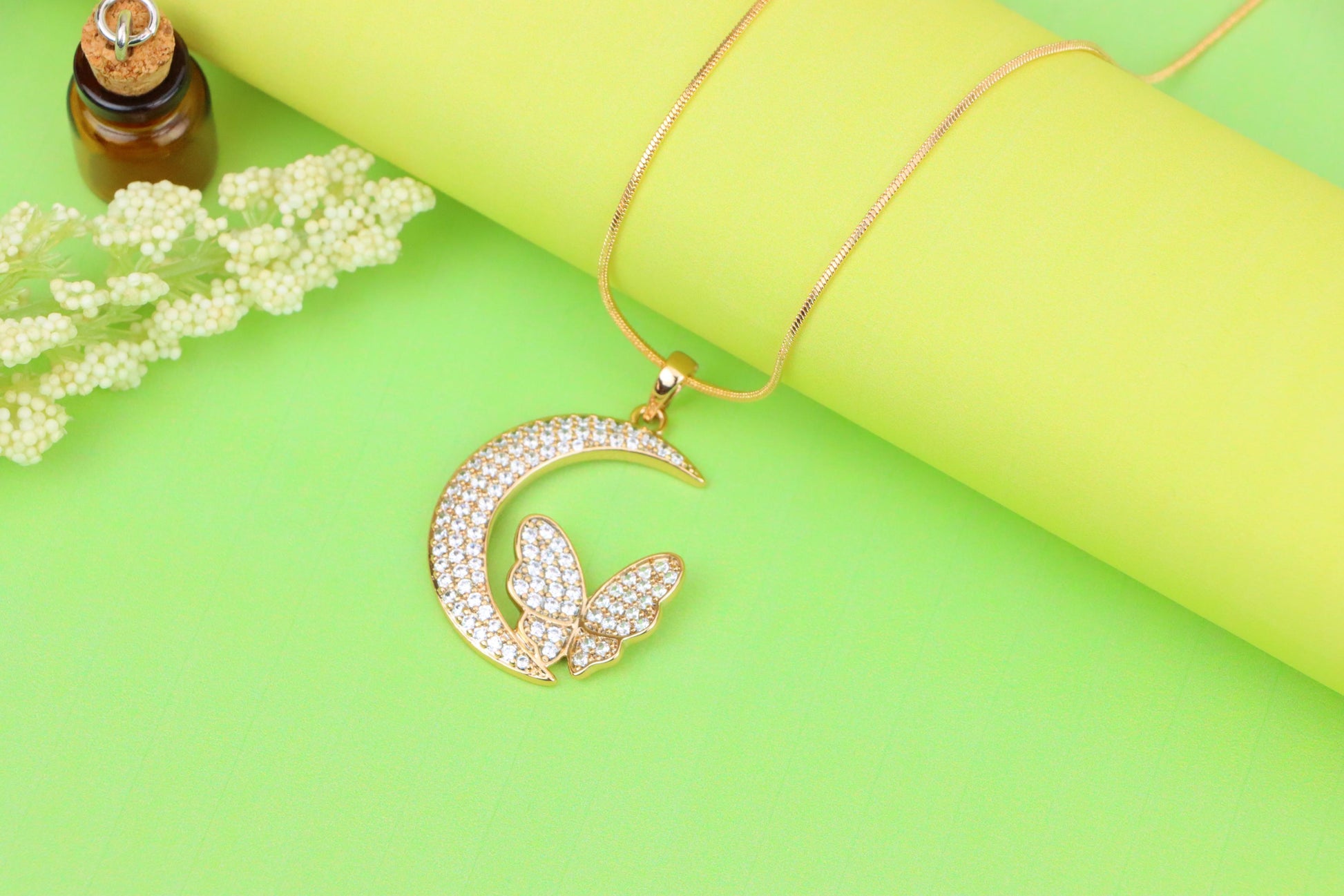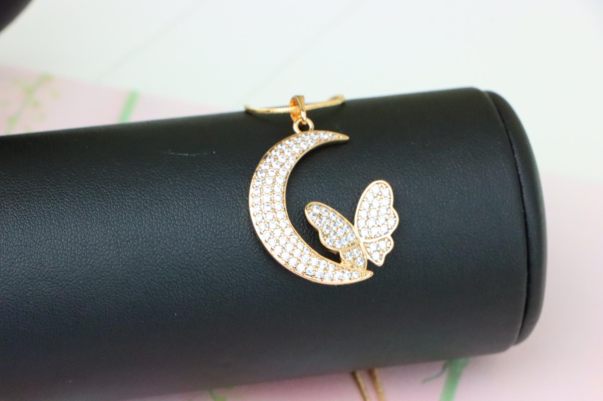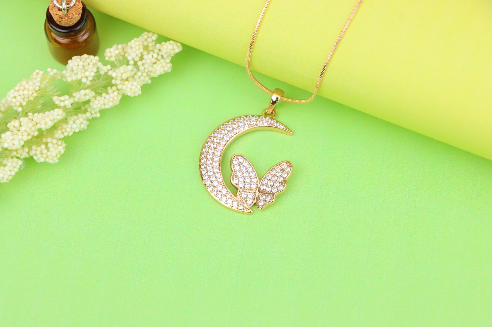 Elegant moon and butterfly motif pendant designed with sparkling crystals for a dreamy, graceful look.
