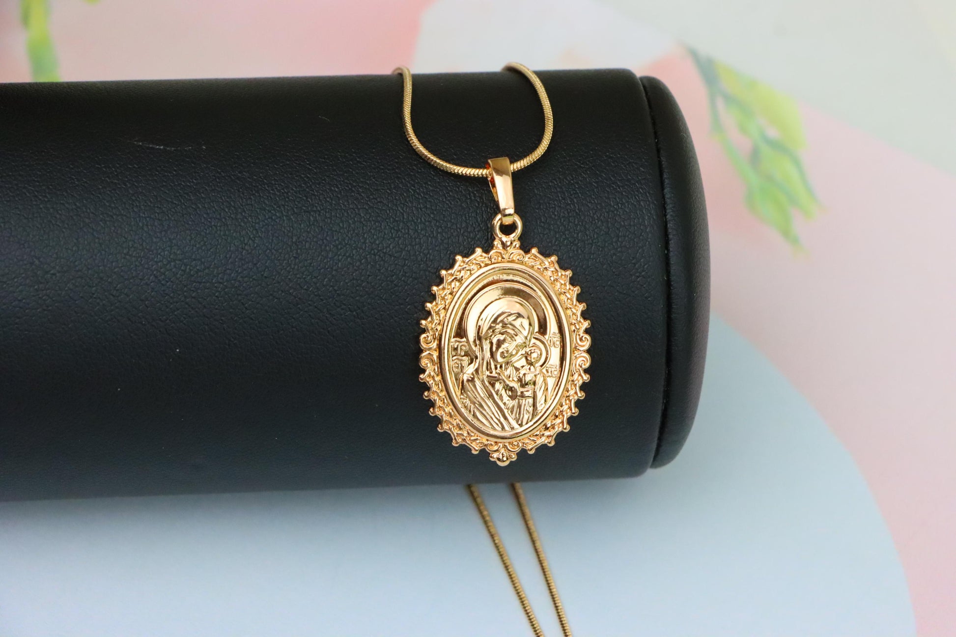 Beautifully detailed pendant featuring a religious motif in lustrous rose gold.