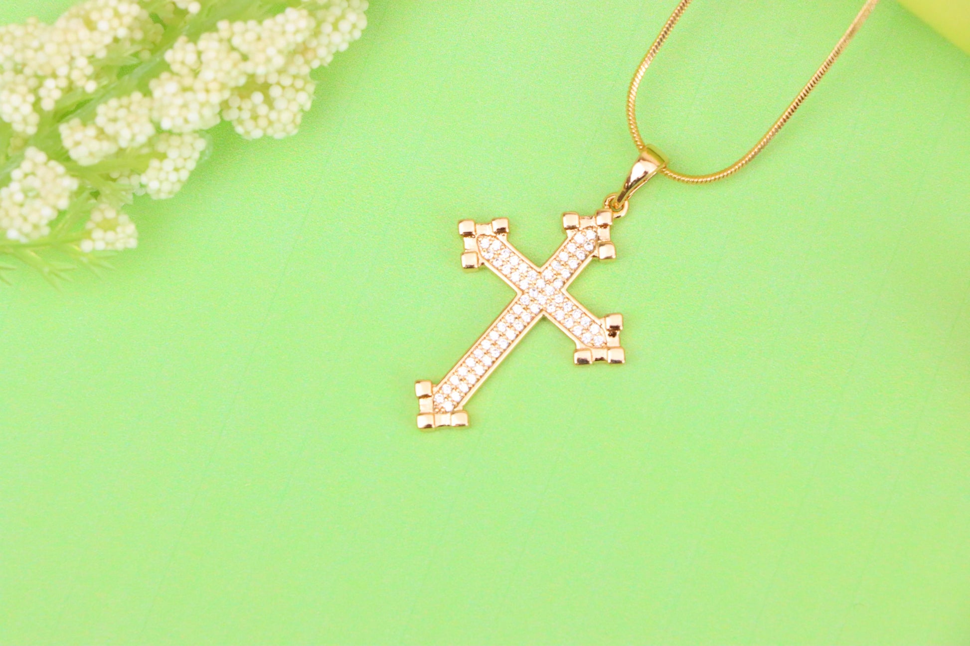 This rose gold pendant features a bold and elegant cross shape with intricate CZ inlay and decorative pointed edges, crafted from gold-plated high-quality brass.