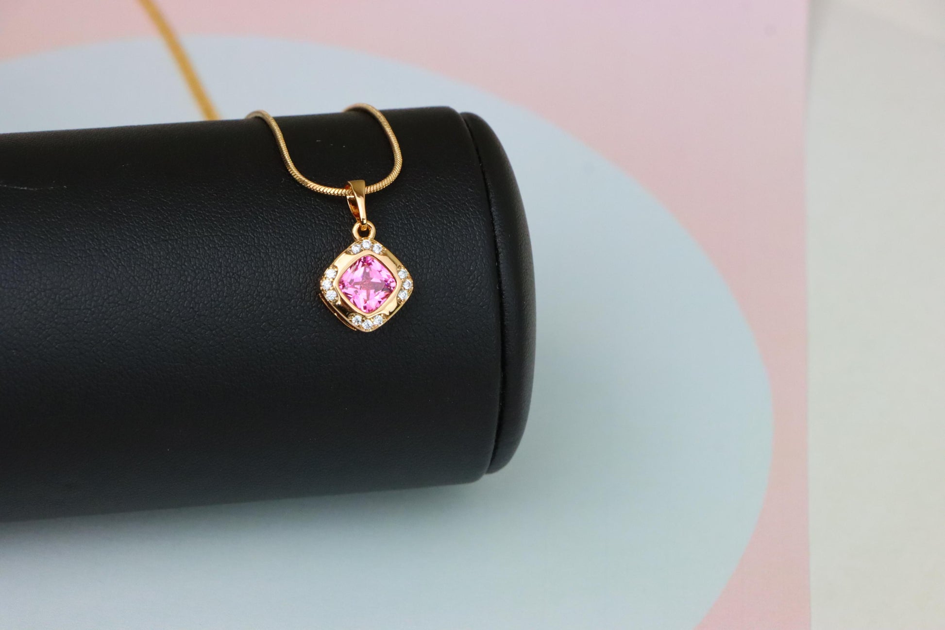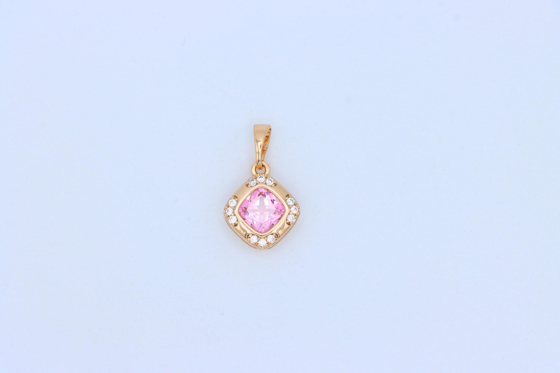Pink Cushion Stone Pendant in Gold Plated Brass with Crystal Halo, XPPT1767