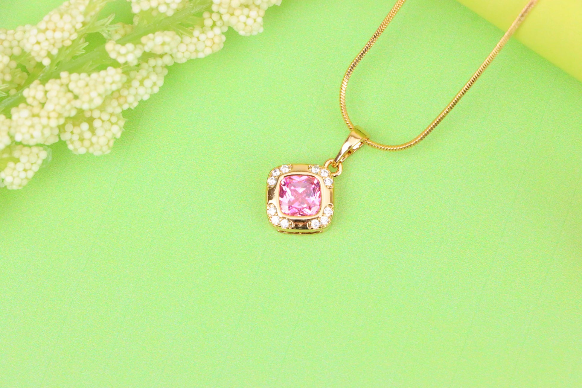 Feminine and radiant pink pendant with a cushion-cut center stone. Framed by shimmering crystals, it’s crafted in gold-plated high quality brass.