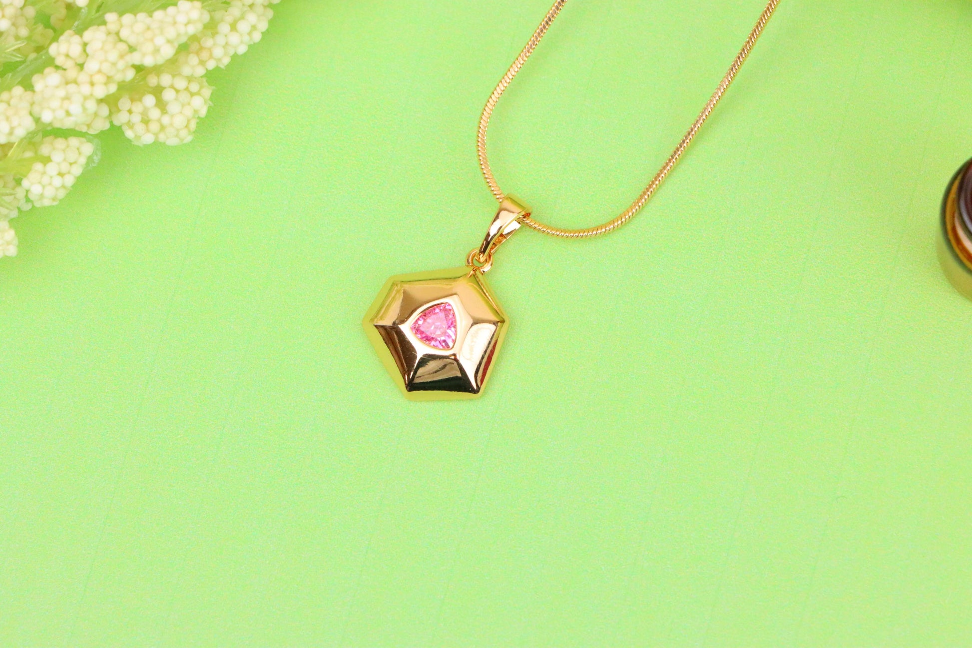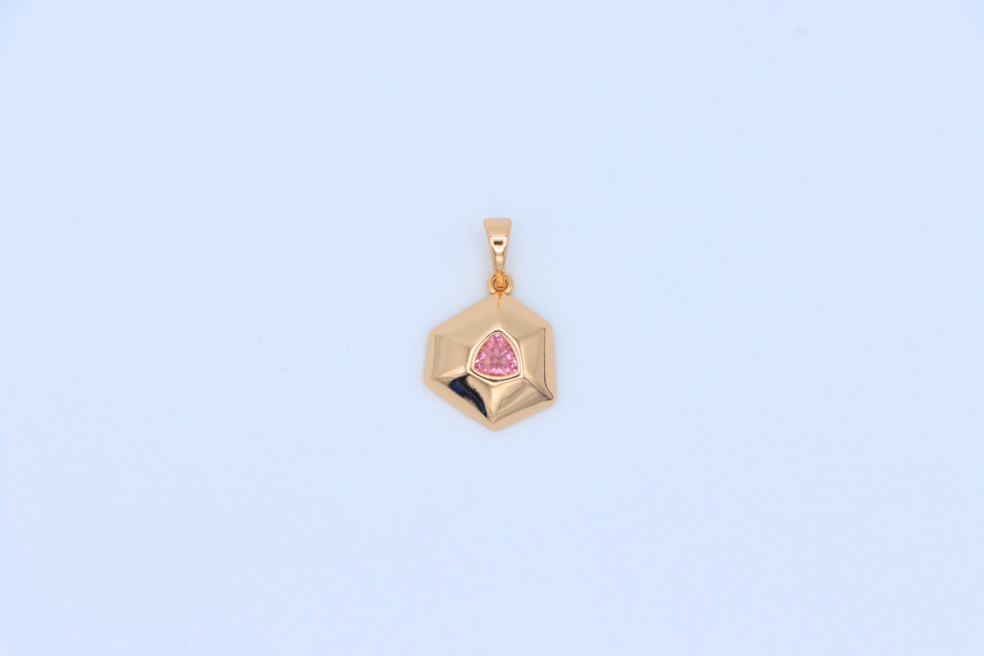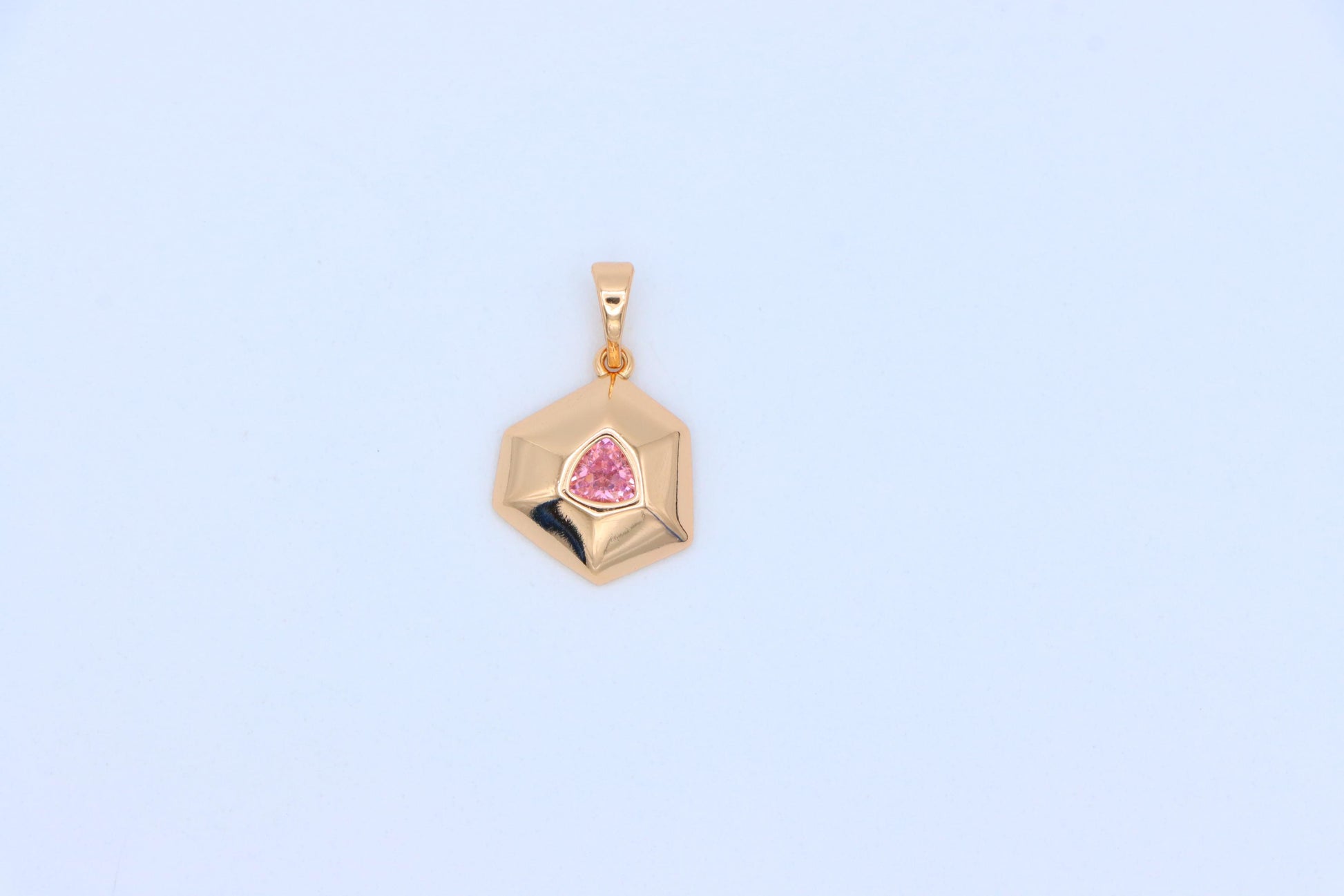 Chic and modern pink pendant crafted with a unique geometric design. This eye-catching piece features a beautiful trillion-cut pink stone set in gold-plated high-quality brass.