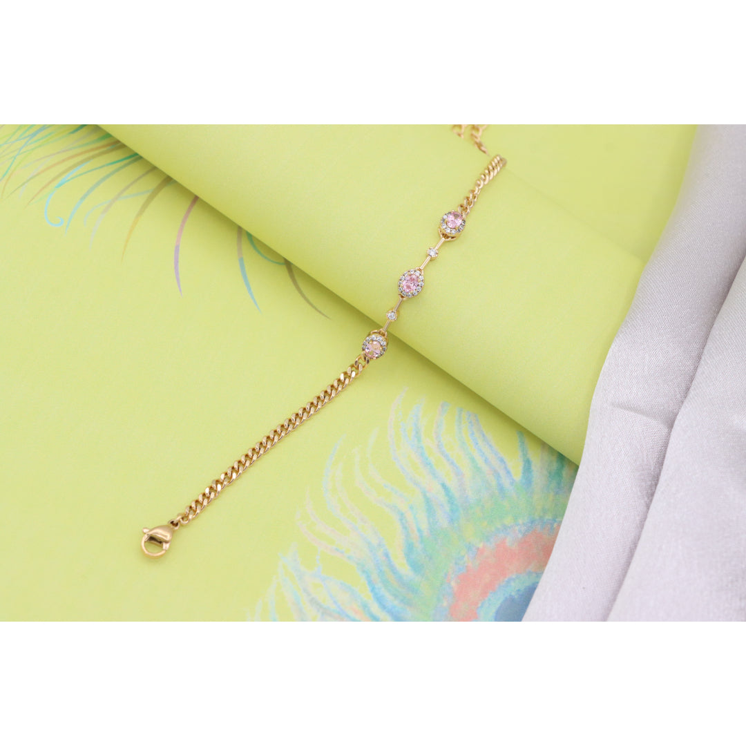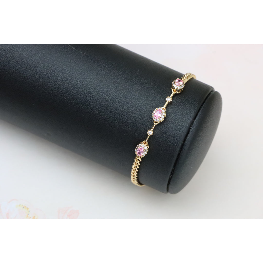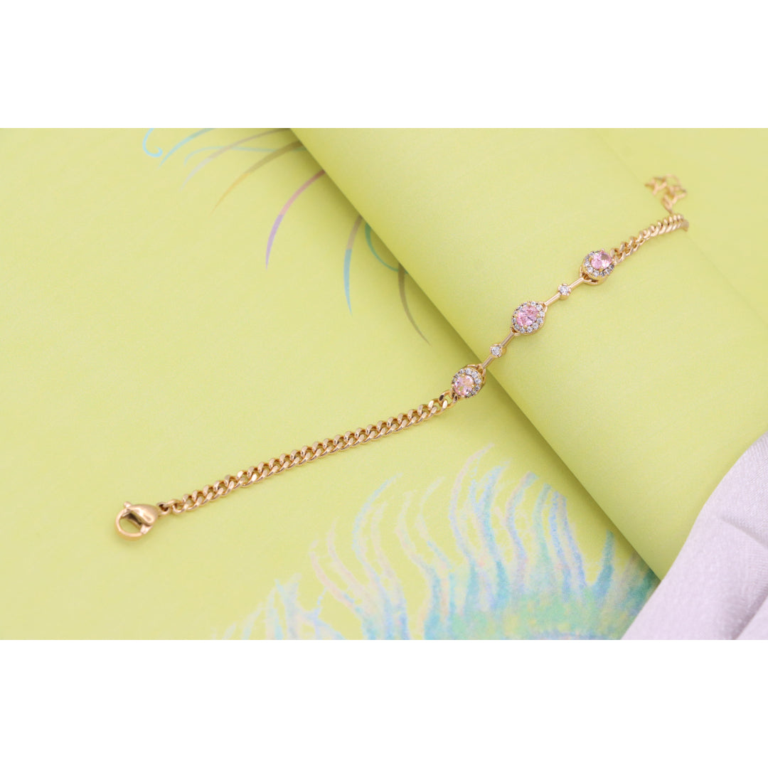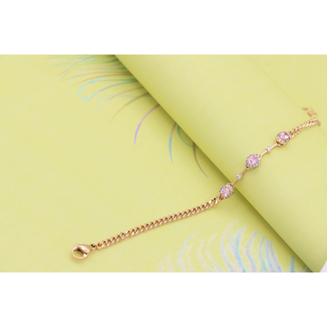Elegant bracelet featuring sparkling pink oval stones framed with crystals, set in a delicate rose gold finish.