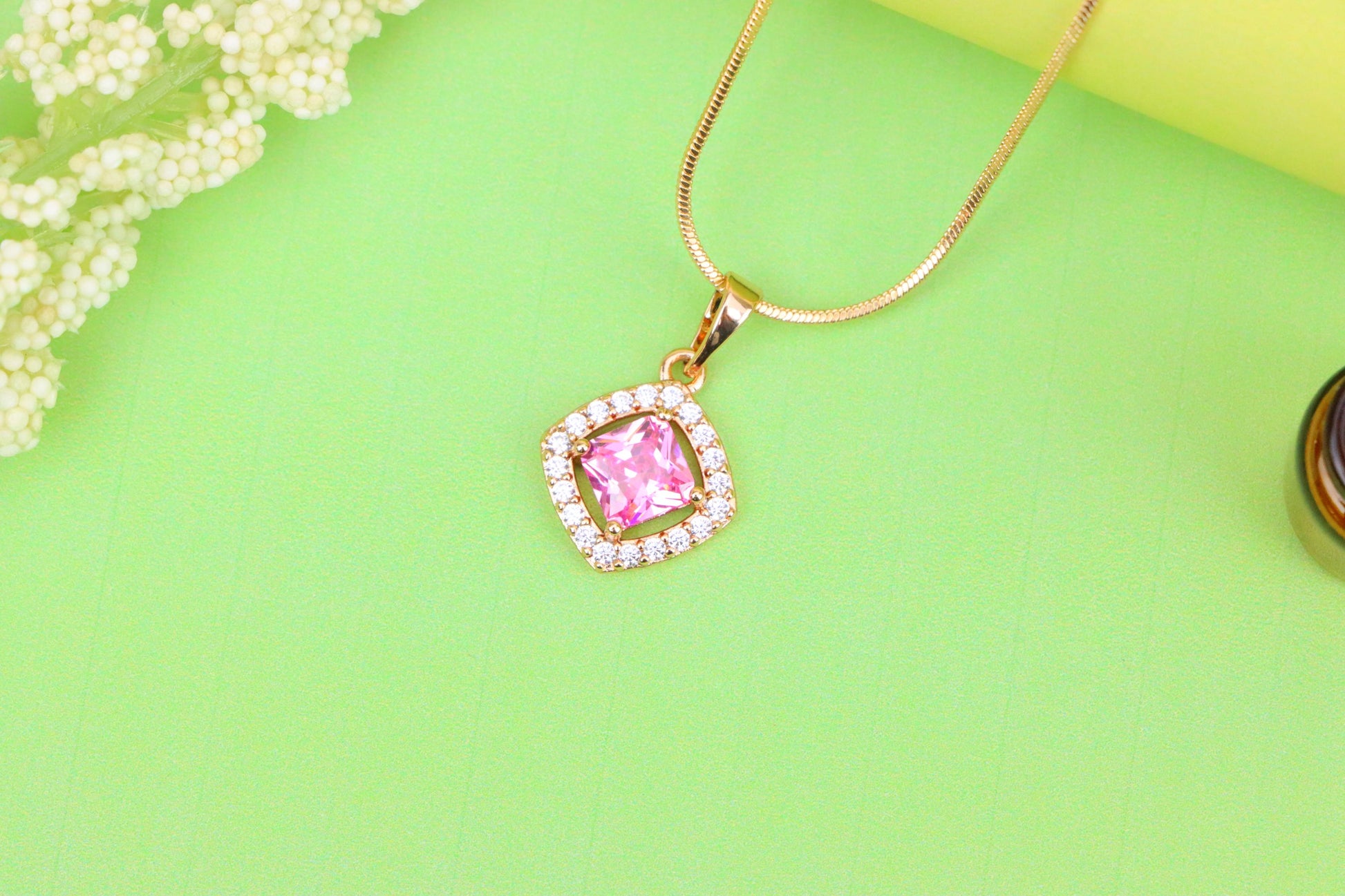 Charming pink pendant featuring a princess-cut center stone framed with clear crystals. Crafted from gold plated over high quality brass for a radiant, refined finish.
