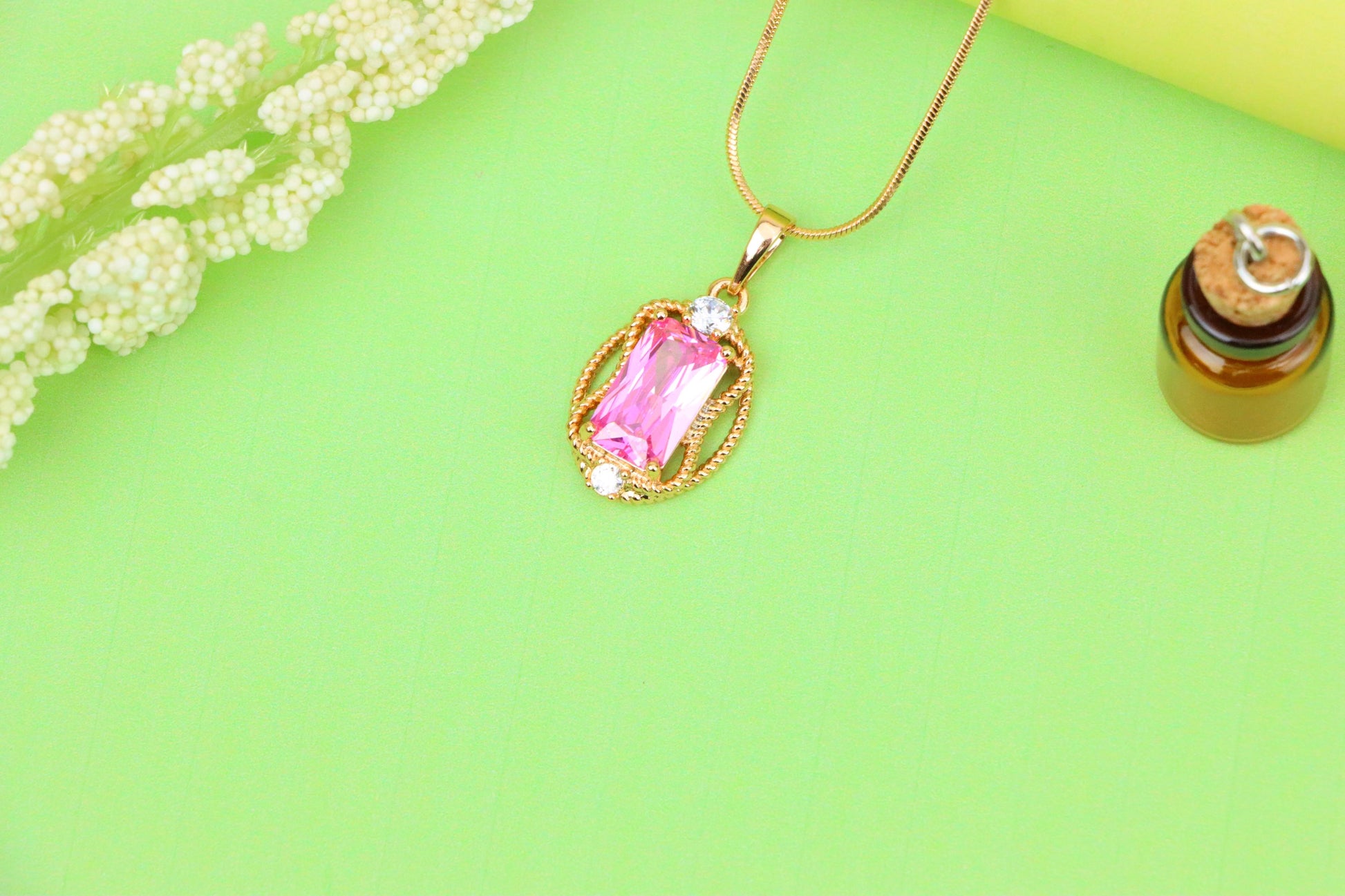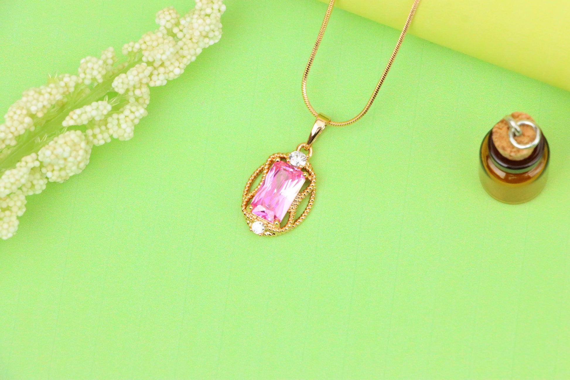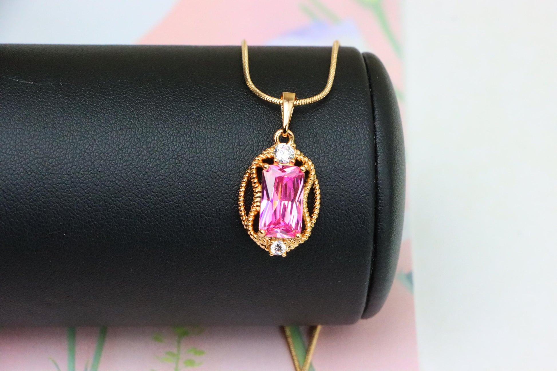 Elegantly designed pink pendant encased in a rich gold twisted frame.
