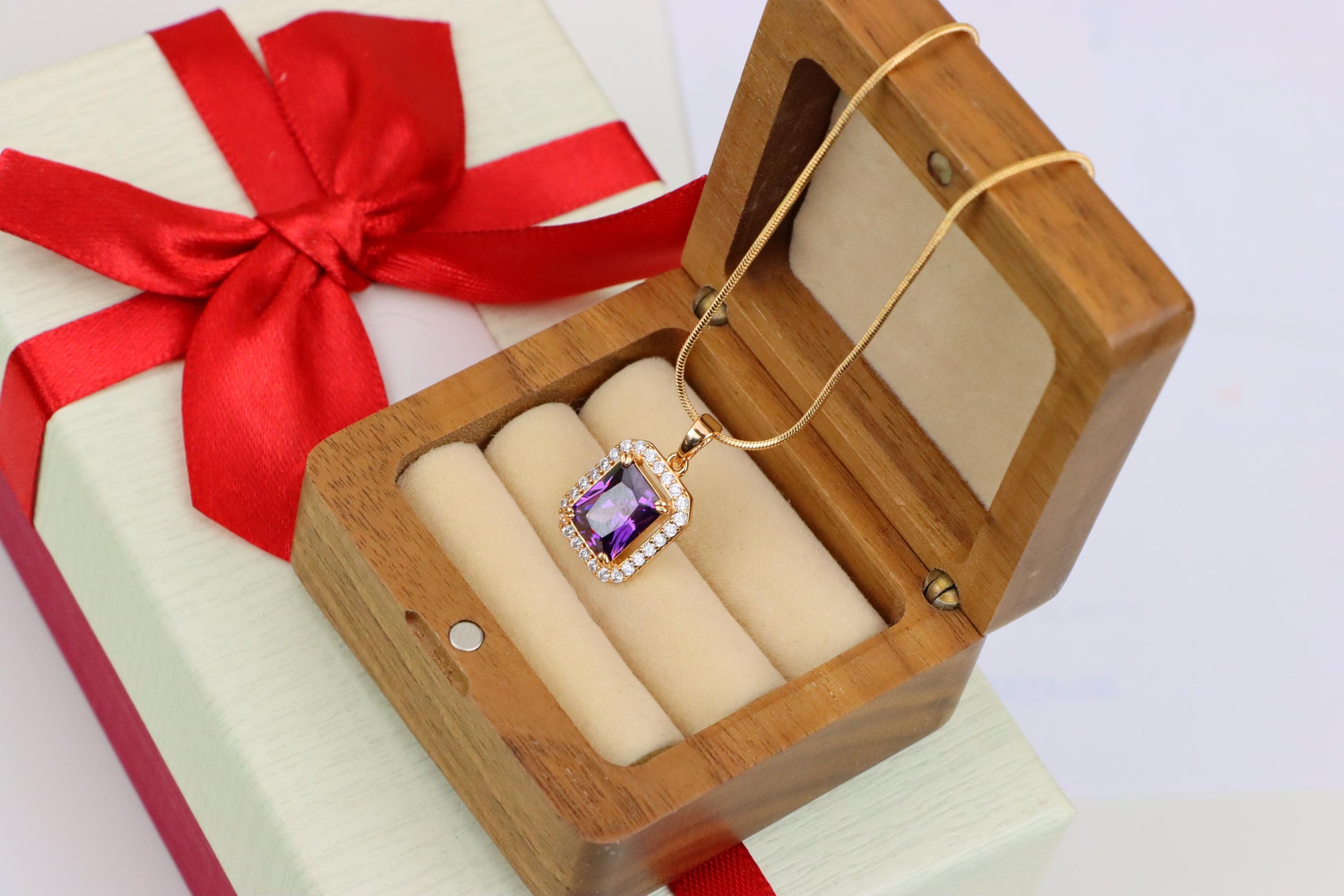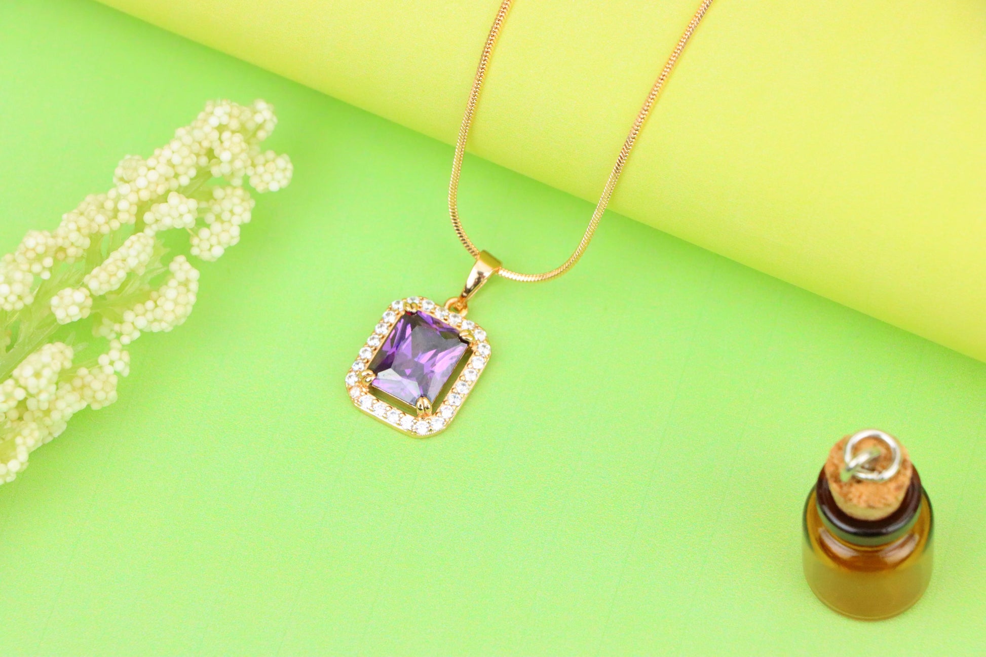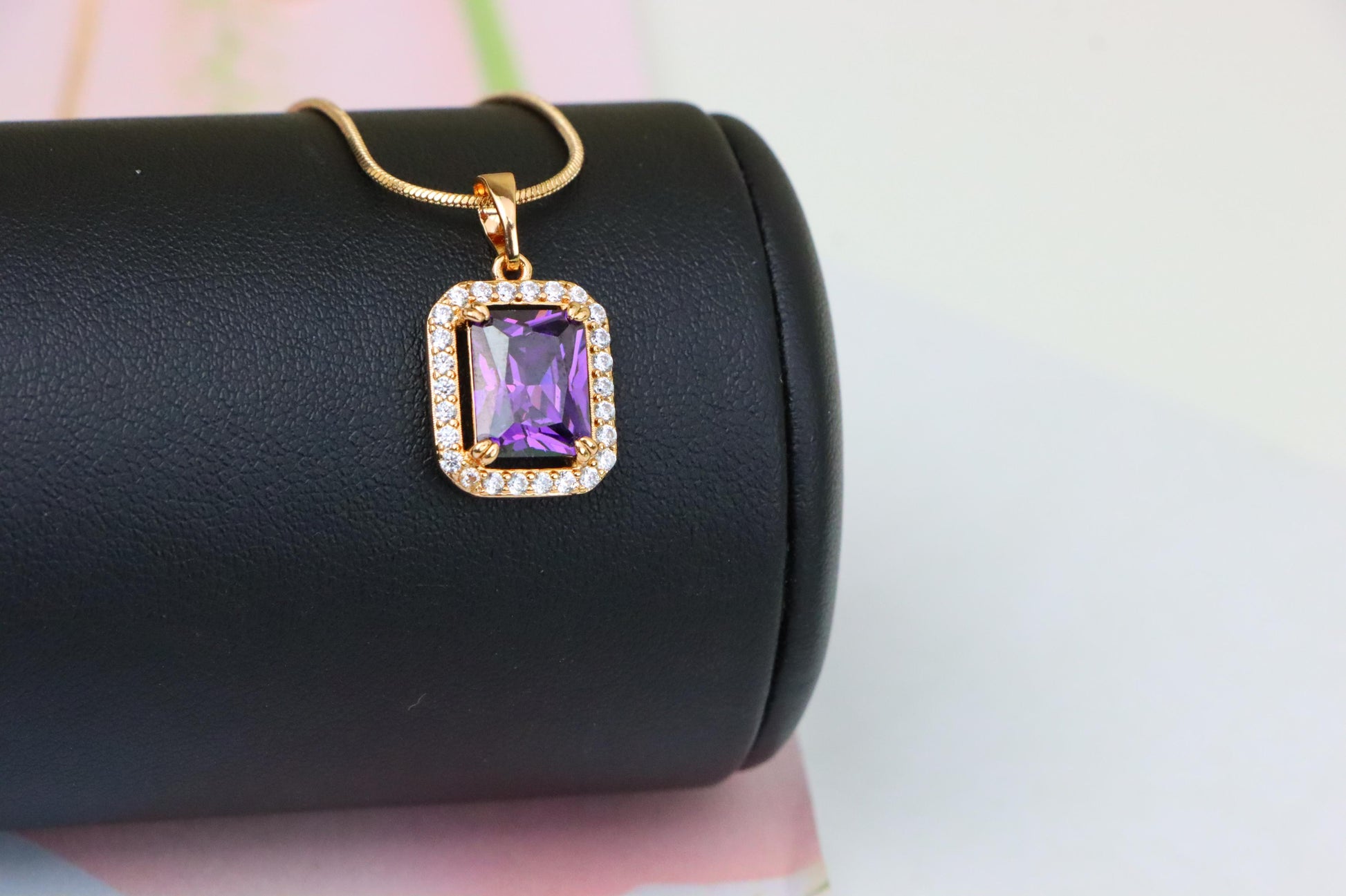 Elegant and radiant, this rose gold pendant showcases a deep purple gemstone surrounded by shimmering white crystals for timeless beauty.