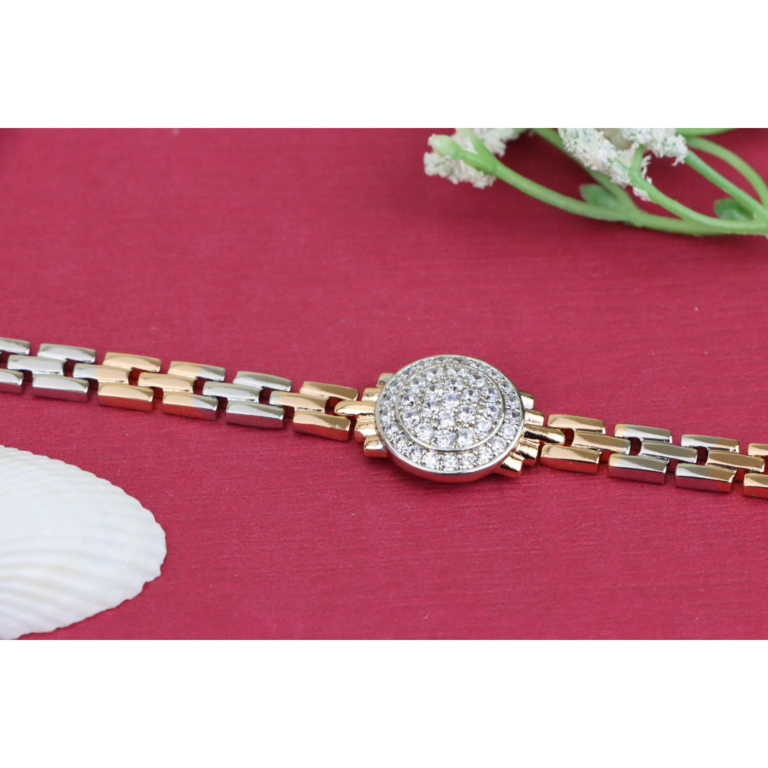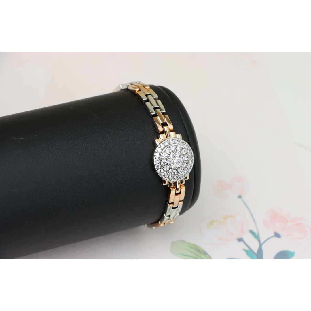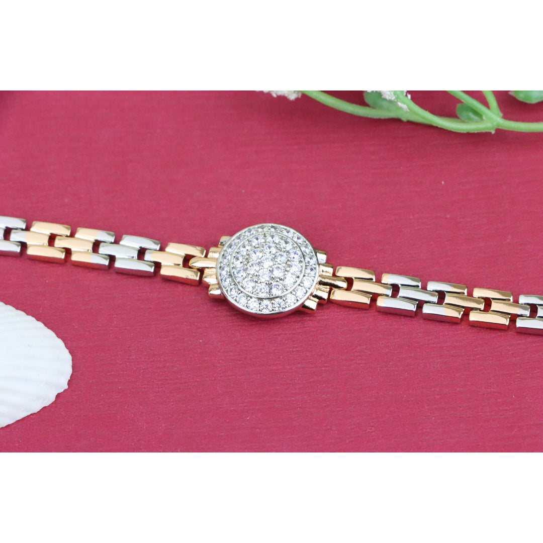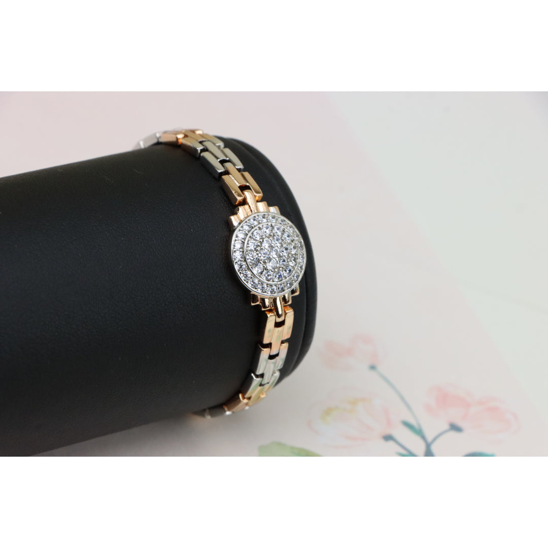 Add refined elegance to your look with this stunning rose gold and silver bracelet, featuring a radiant circular centerpiece encrusted with sparkling stones.