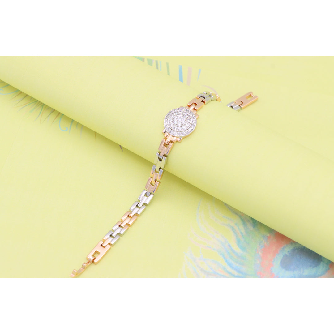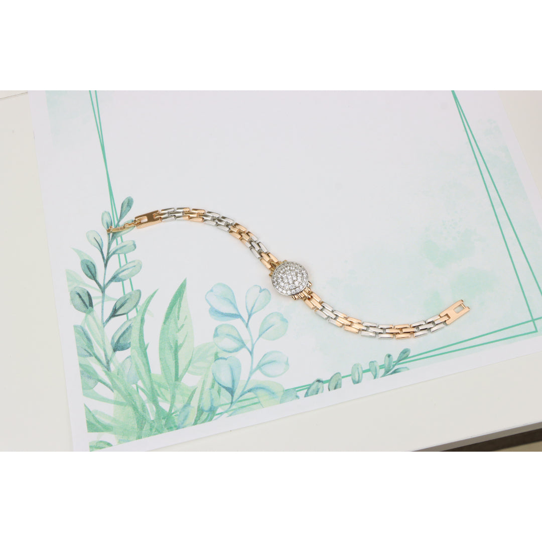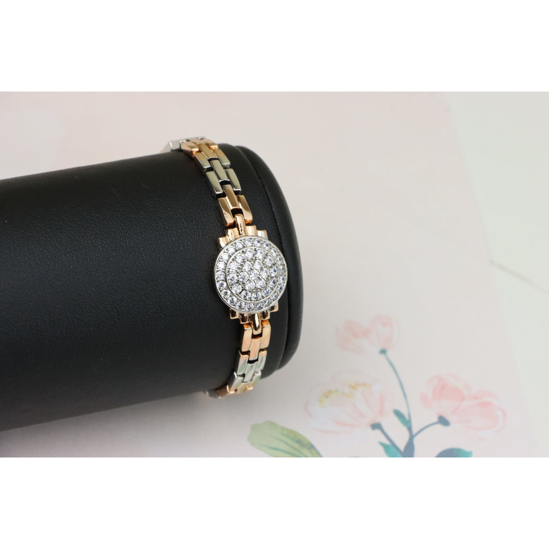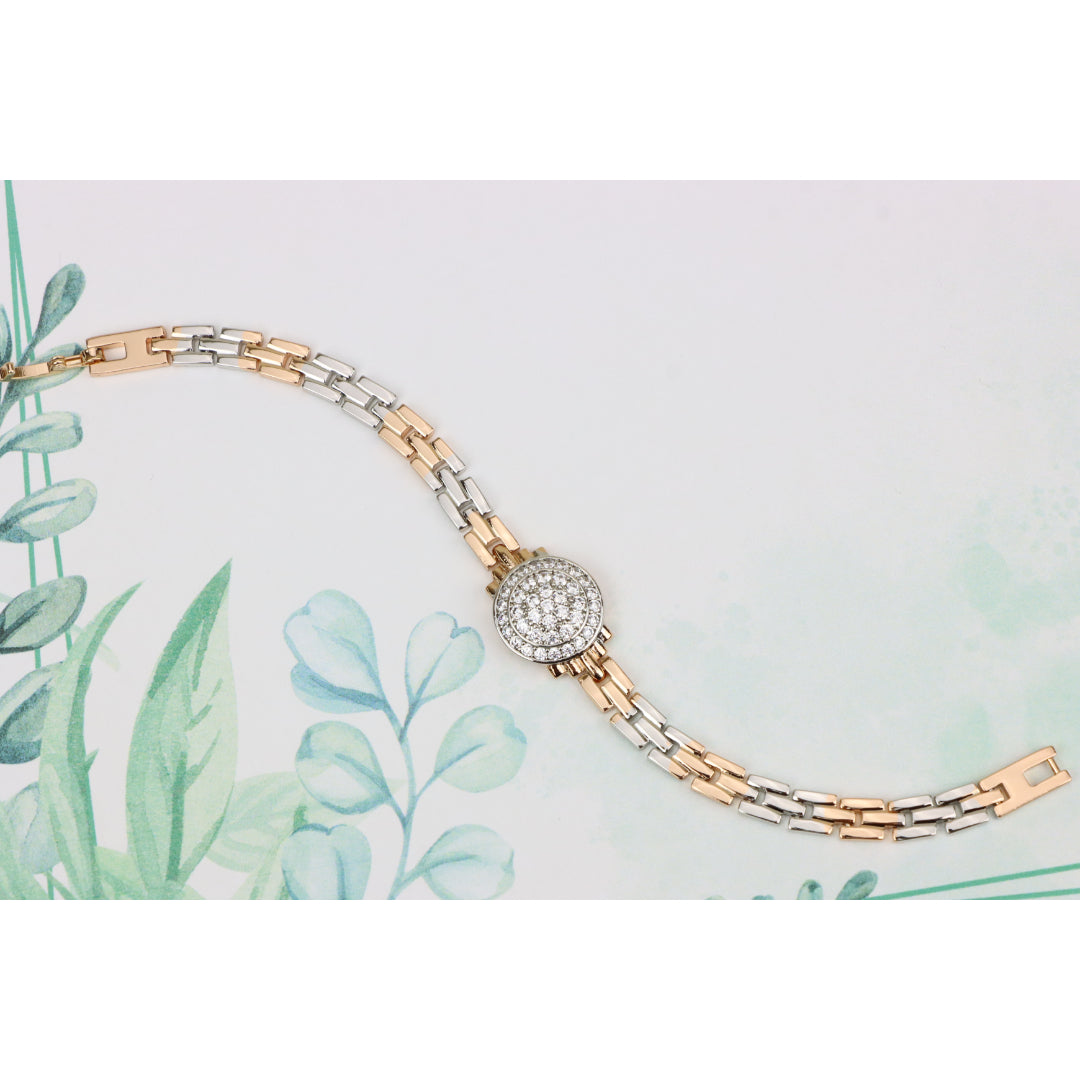 Add refined elegance to your look with this stunning rose gold and silver bracelet, featuring a radiant circular centerpiece encrusted with sparkling stones.