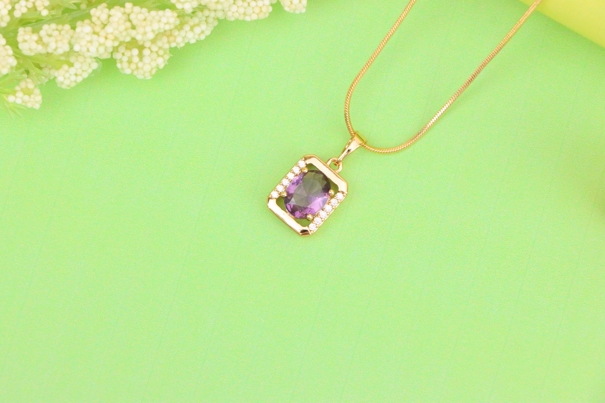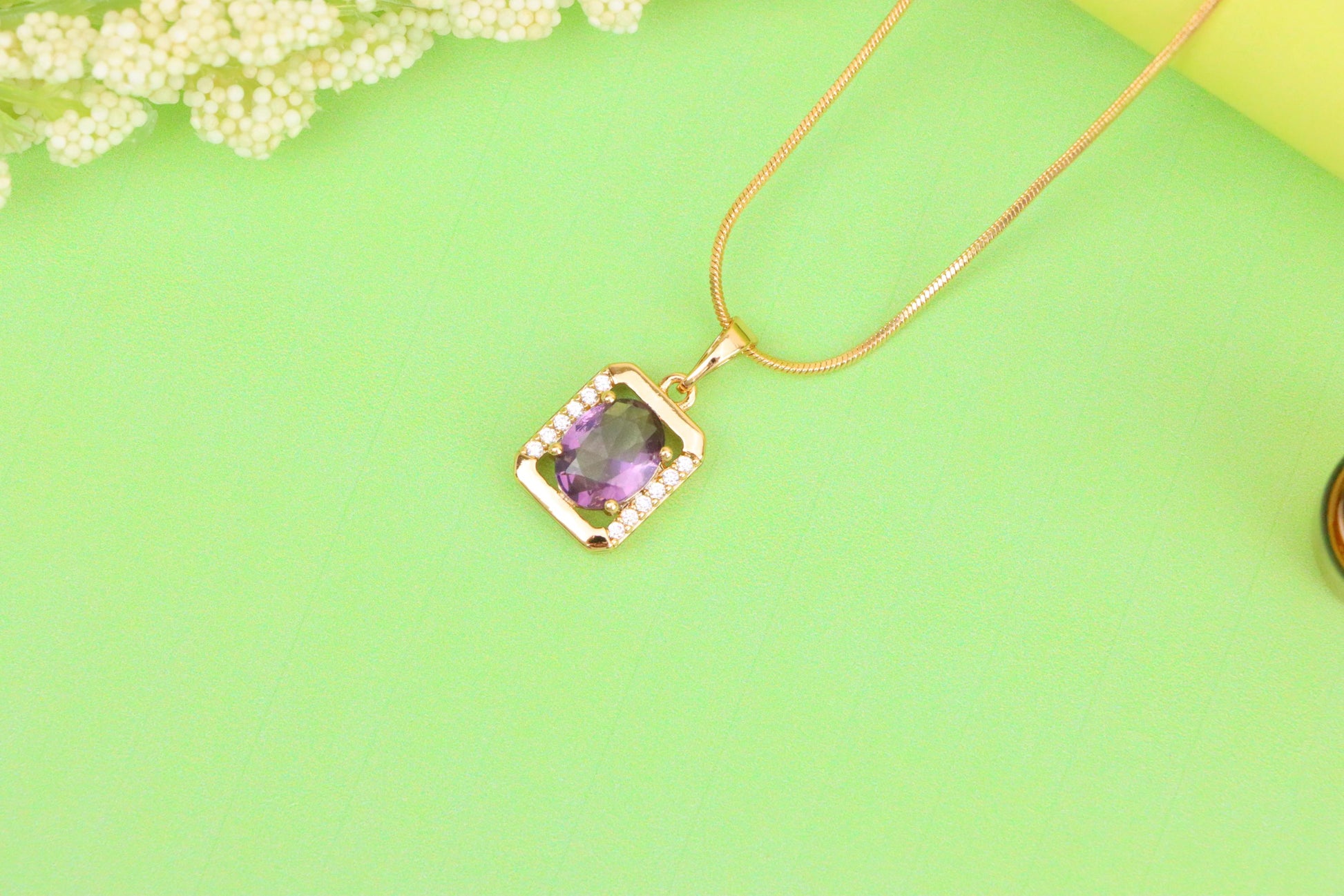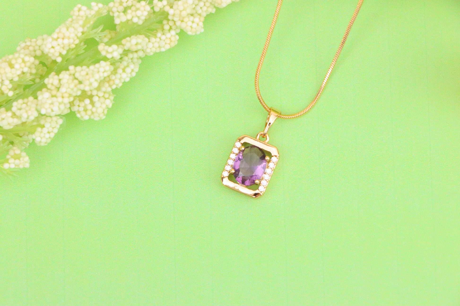 Elegant rectangular pendant featuring a purple center stone framed by sparkling crystals.
