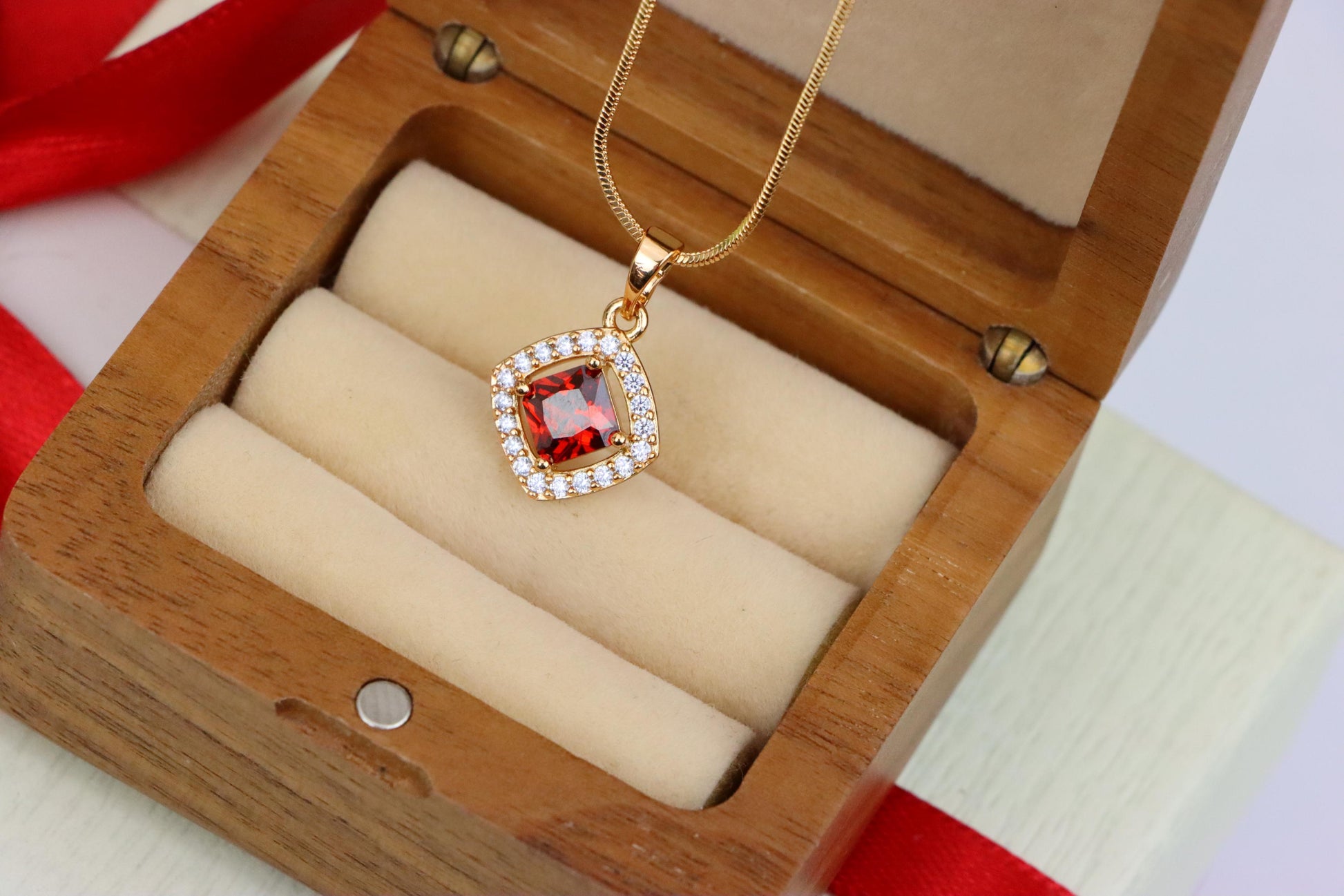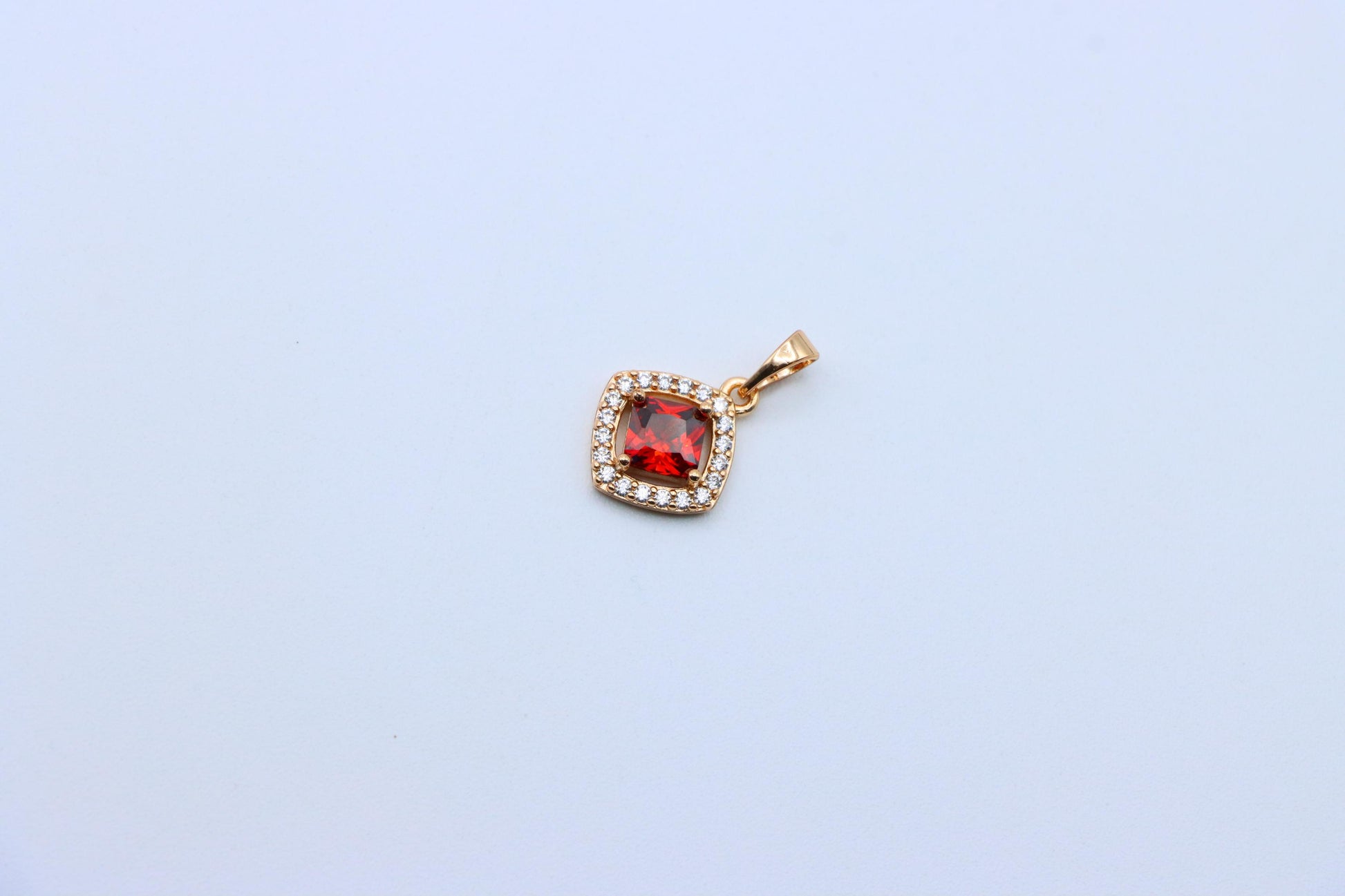 Dazzling red pendant with a princess-cut center stone surrounded by a halo of white crystals, crafted in premium gold plated brass.