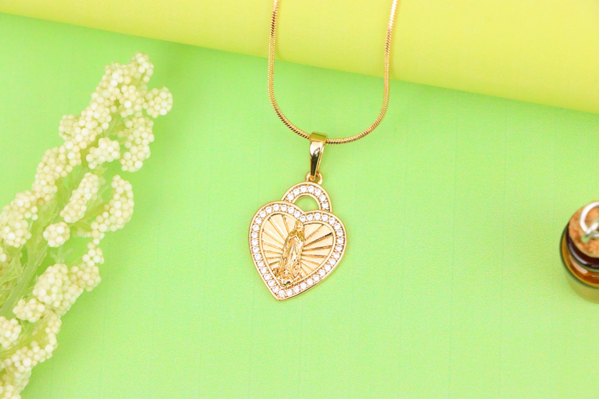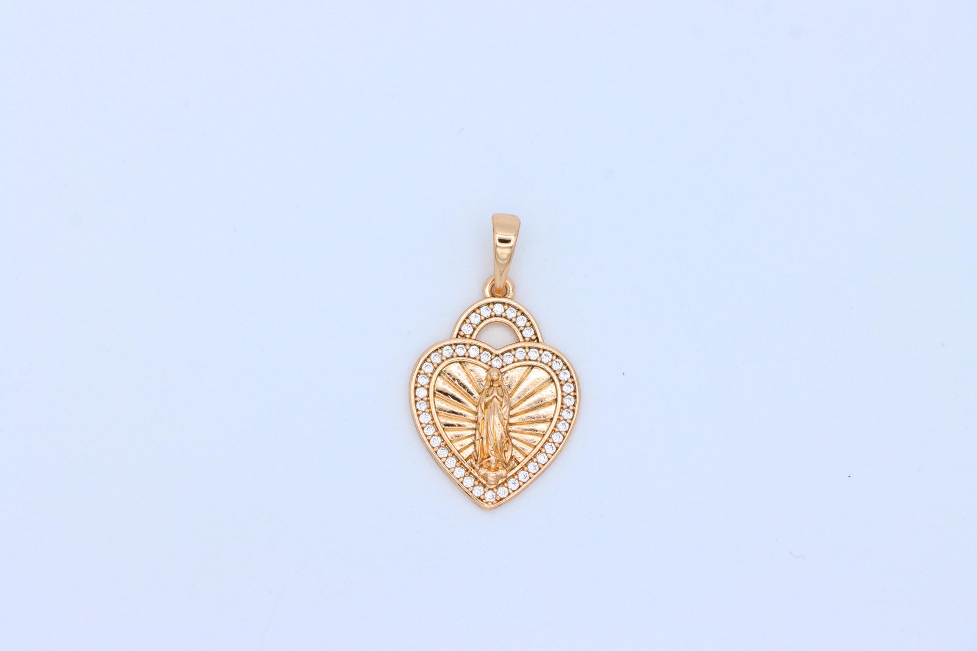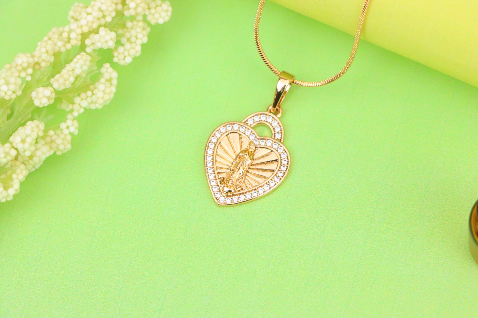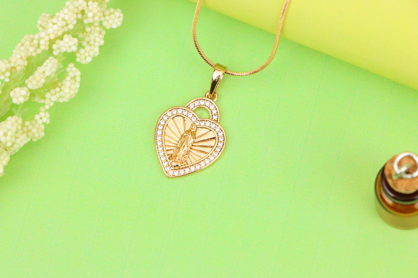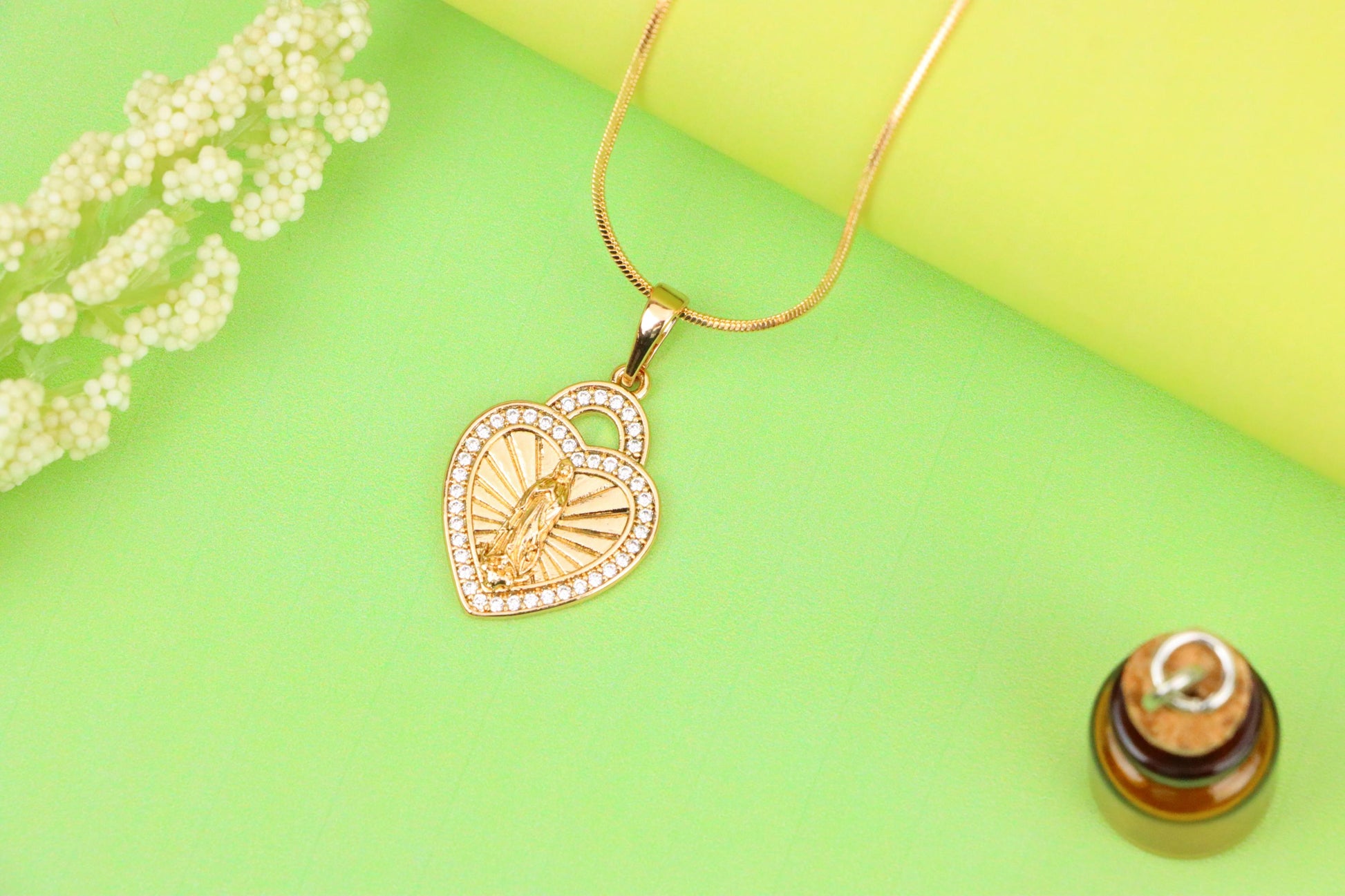 A meaningful pendant featuring a radiant Virgin Mary design in a heart shape, outlined with sparkling crystals for a divine touch.