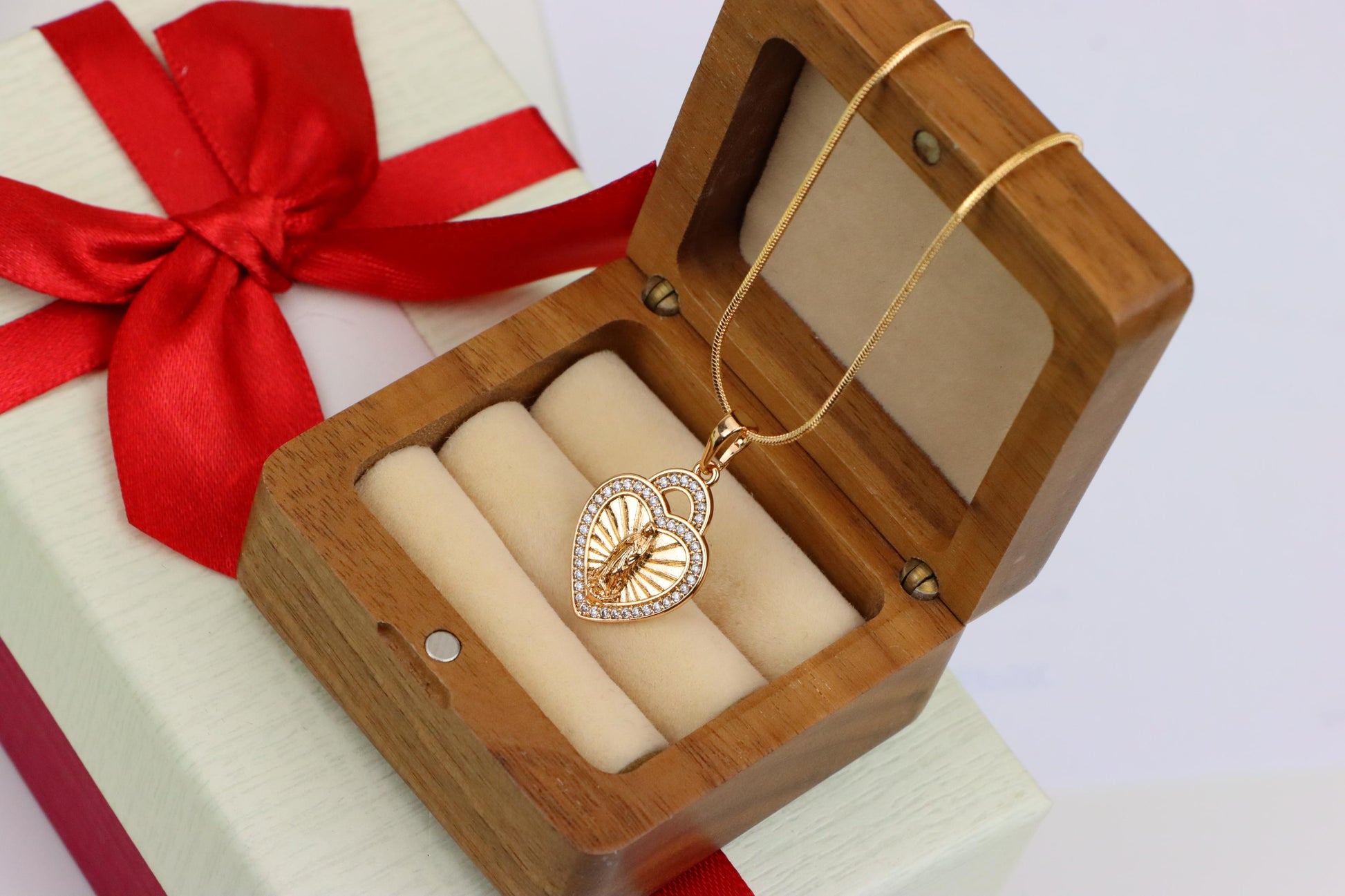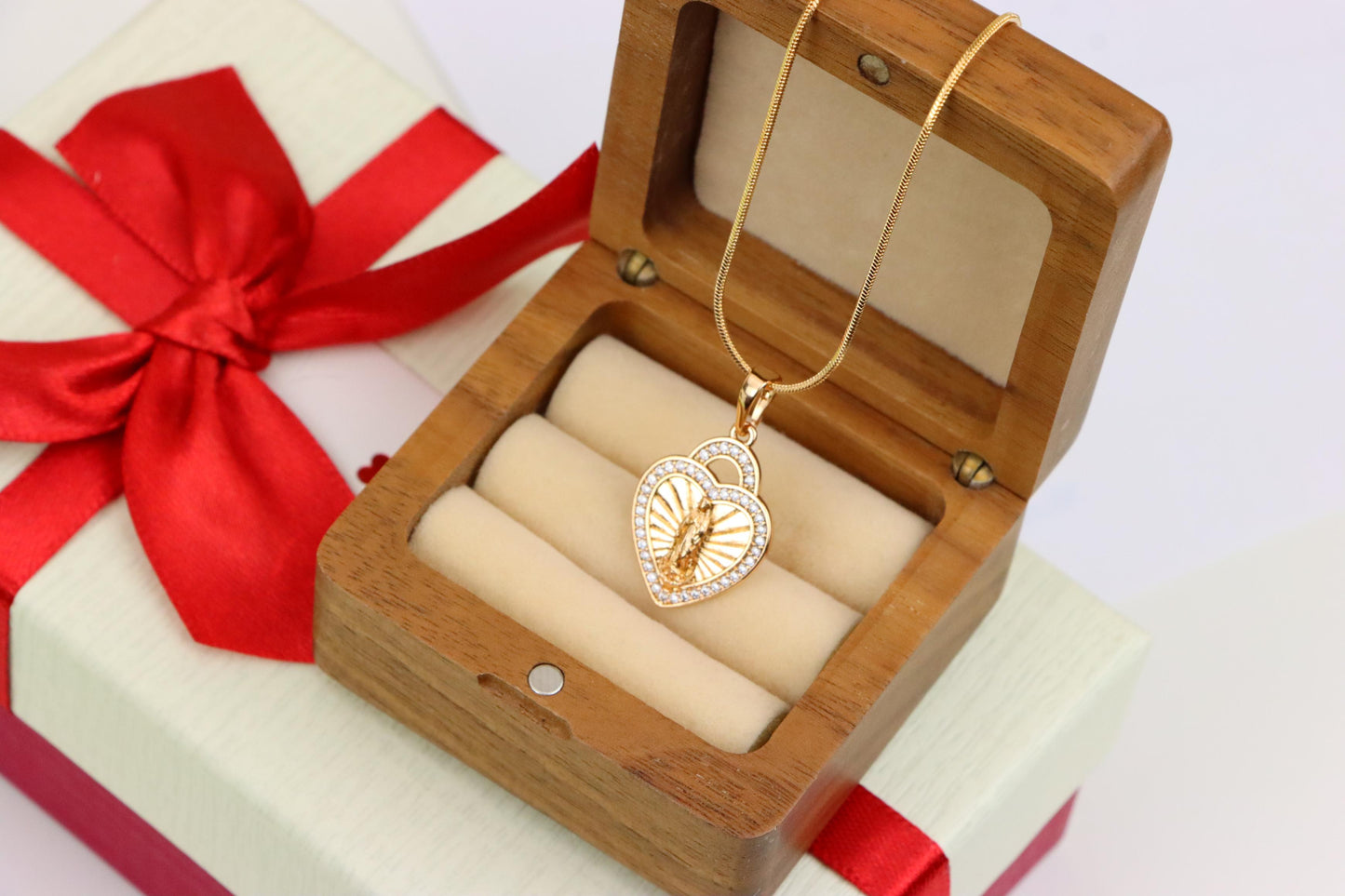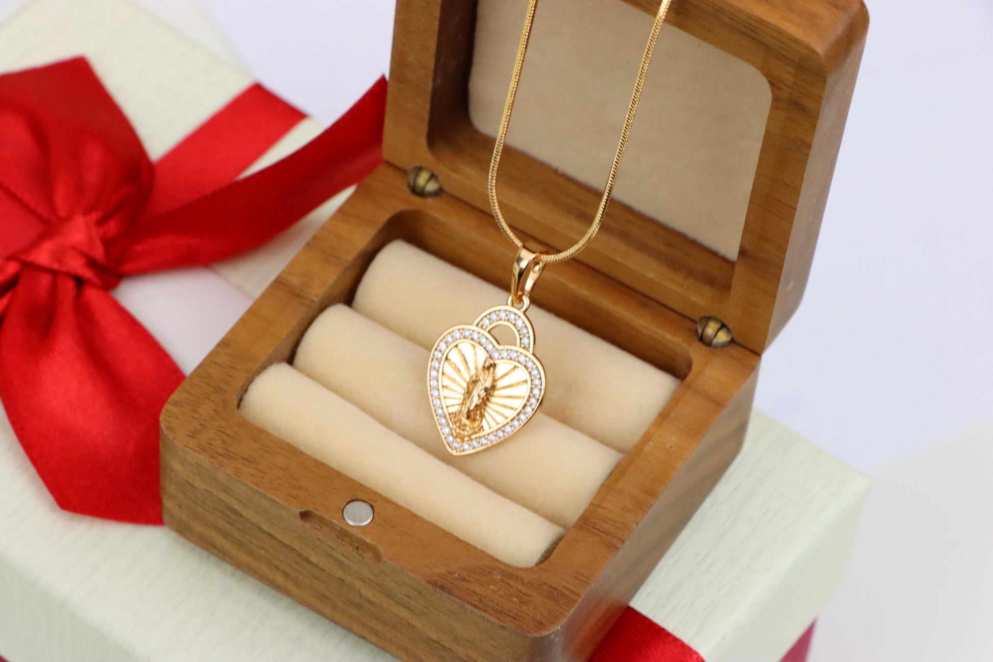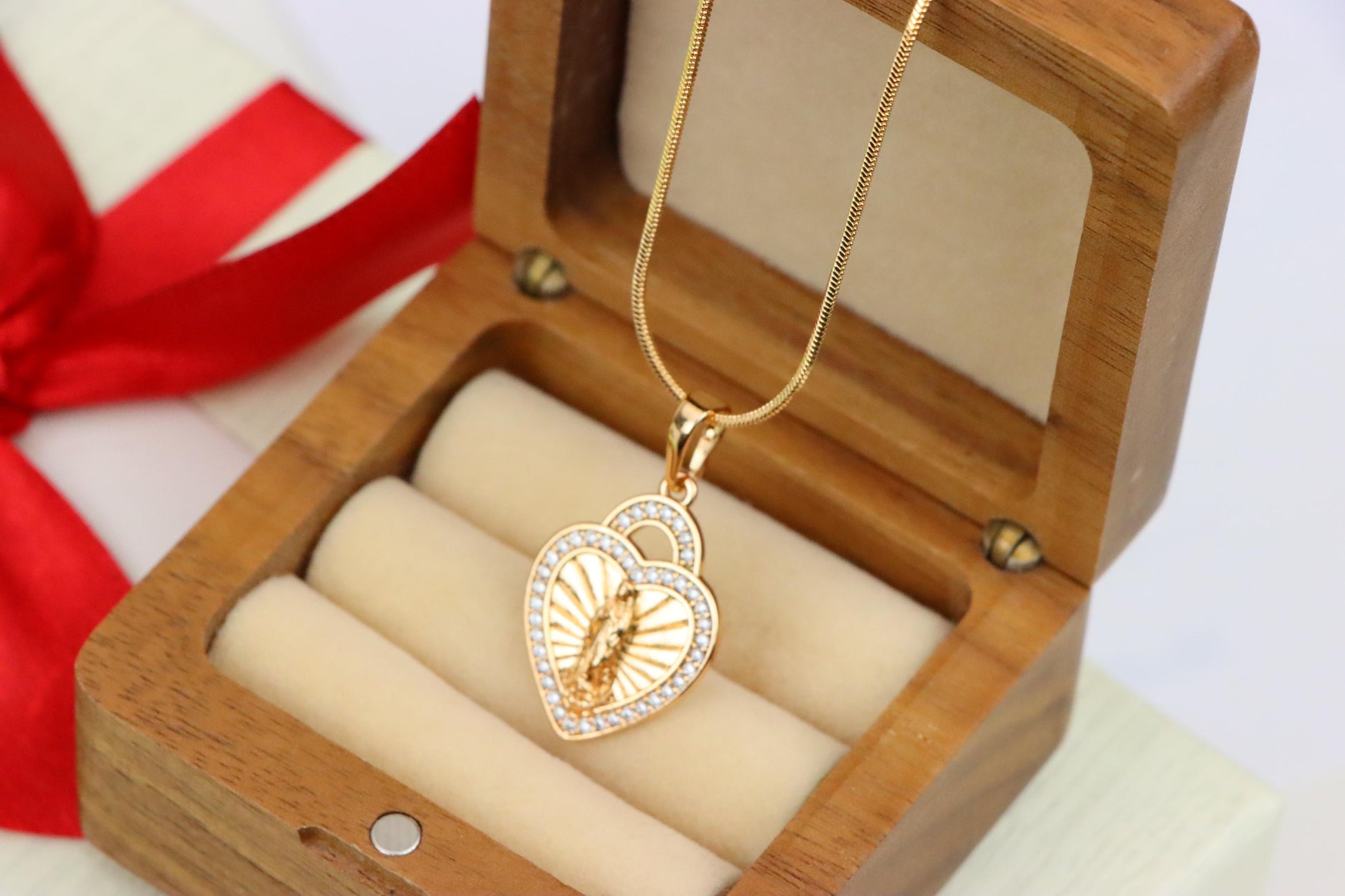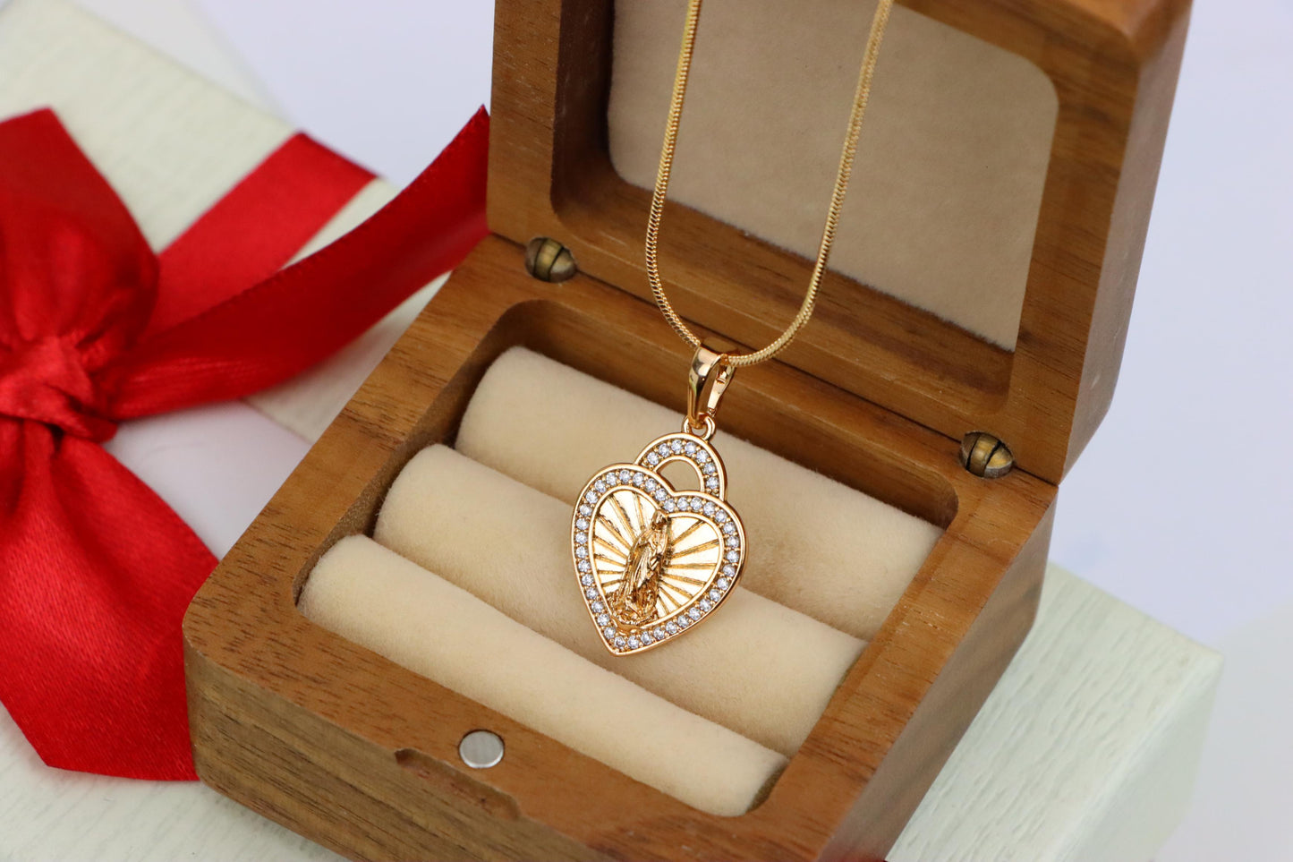 A meaningful pendant featuring a radiant Virgin Mary design in a heart shape, outlined with sparkling crystals for a divine touch.