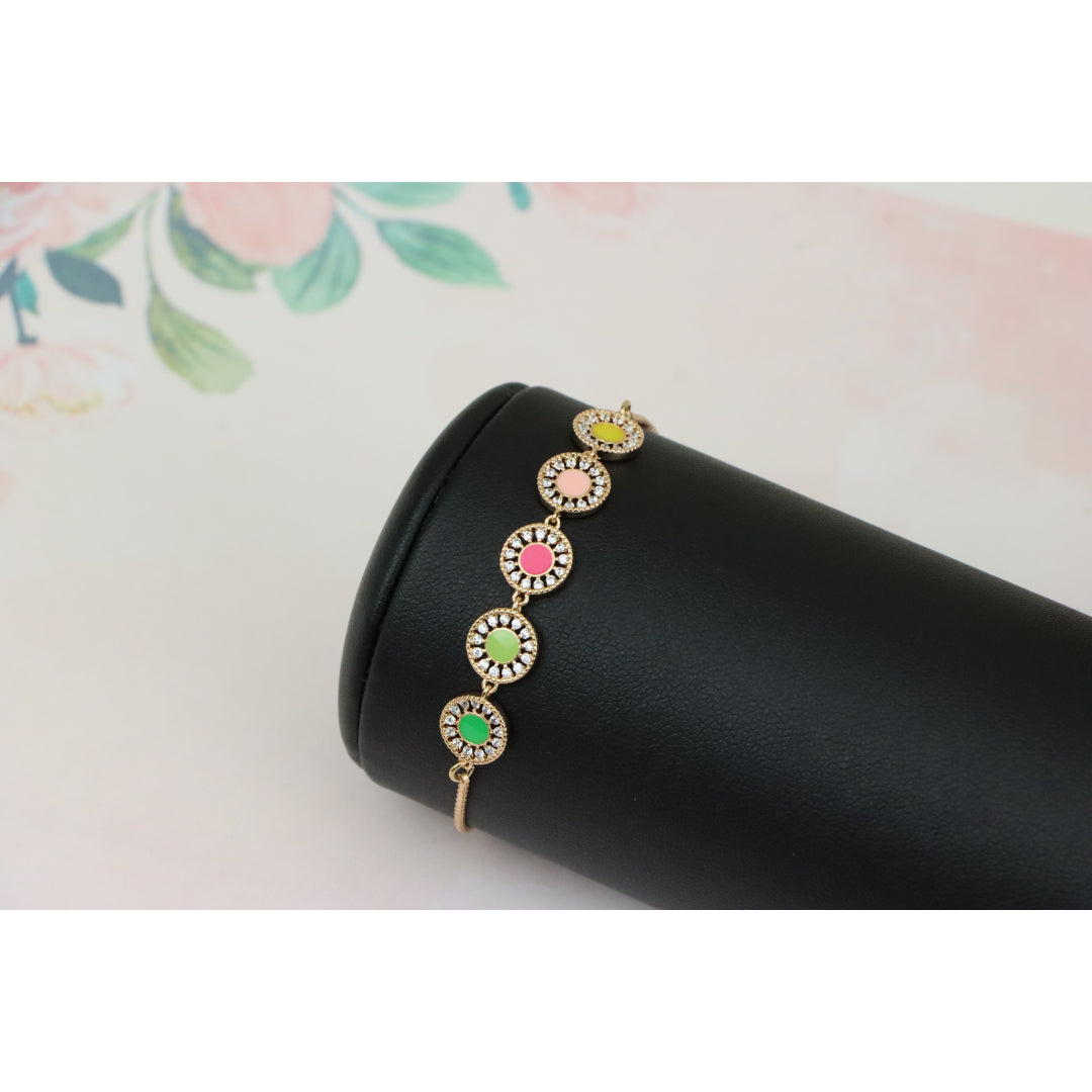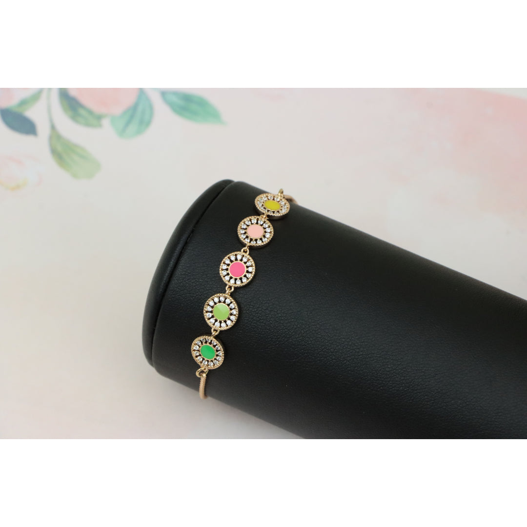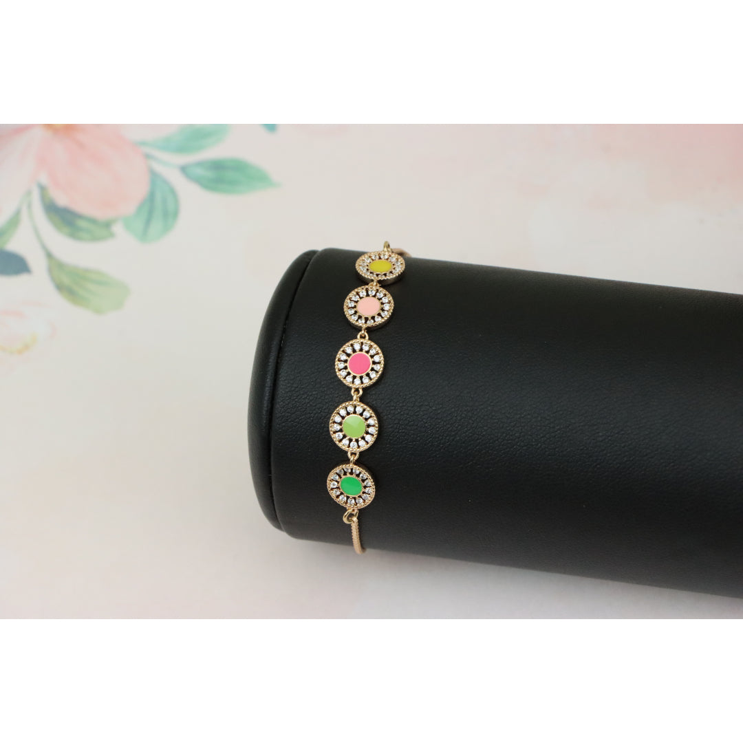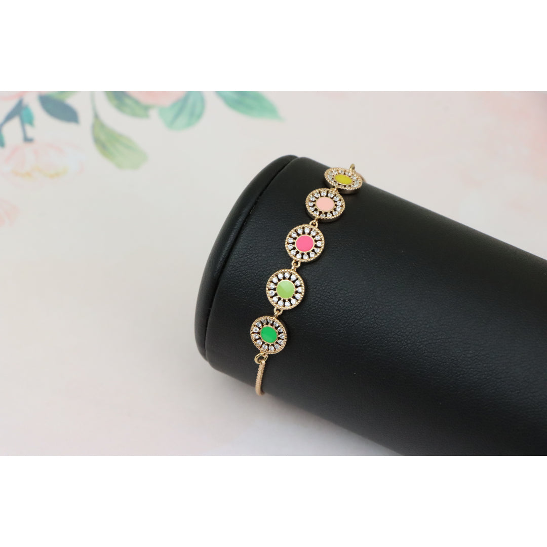 Elegant and eye-catching, this Rose Gold A-Bracelet is crafted with gold-plated high-quality brass, featuring vibrant colorful discs surrounded by sparkling stones. Perfect for adding a pop of color to any outfit.