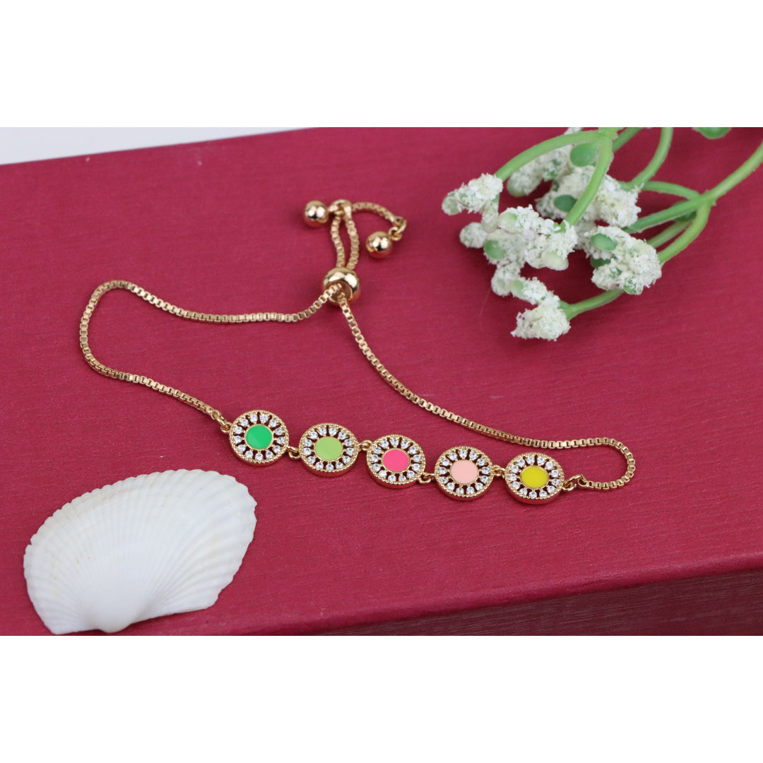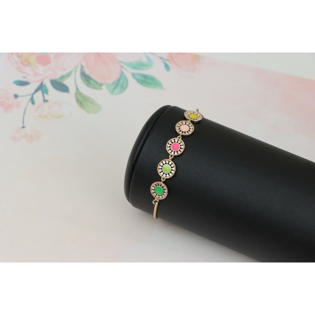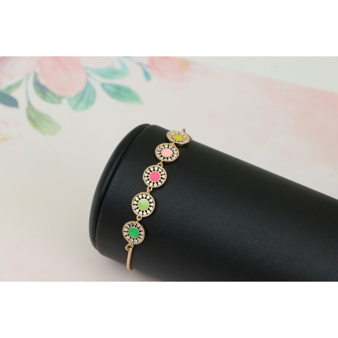 Elegant and eye-catching, this Rose Gold A-Bracelet is crafted with gold-plated high-quality brass, featuring vibrant colorful discs surrounded by sparkling stones. Perfect for adding a pop of color to any outfit.