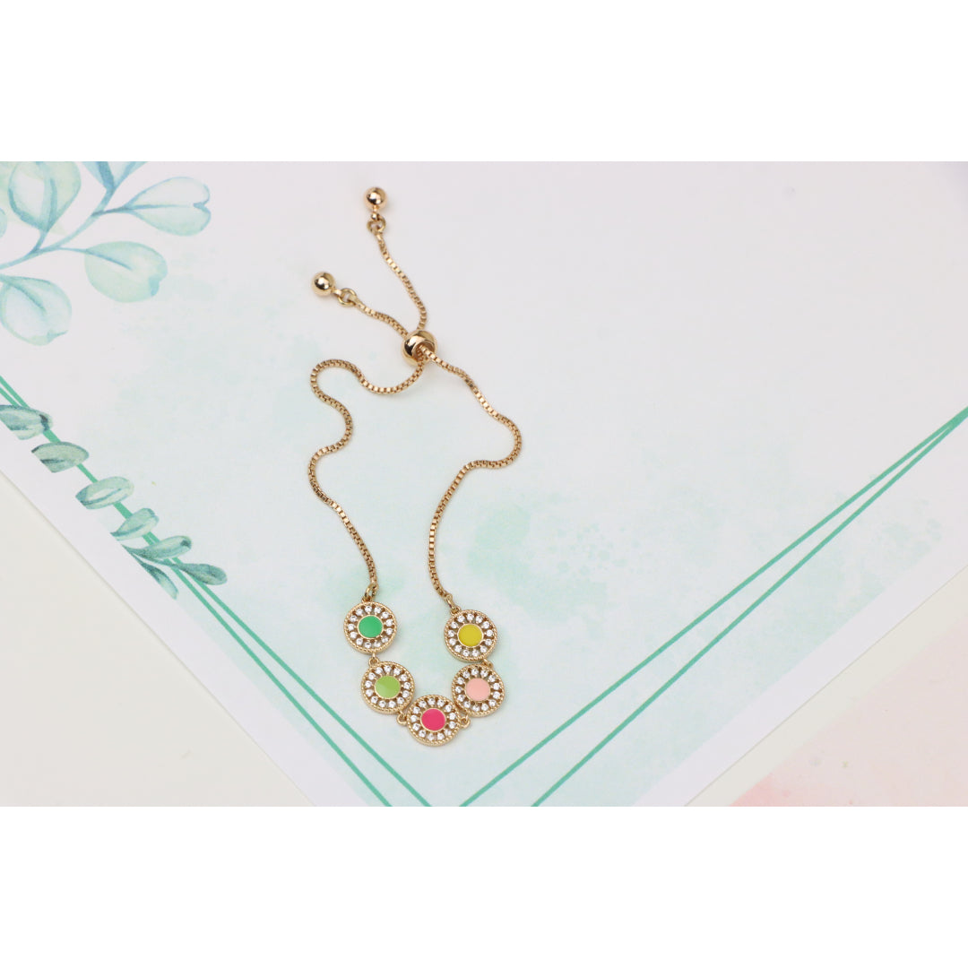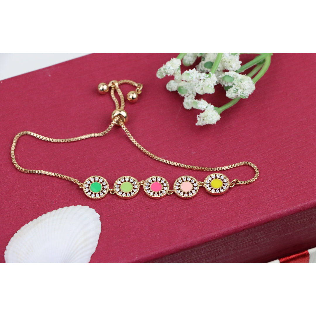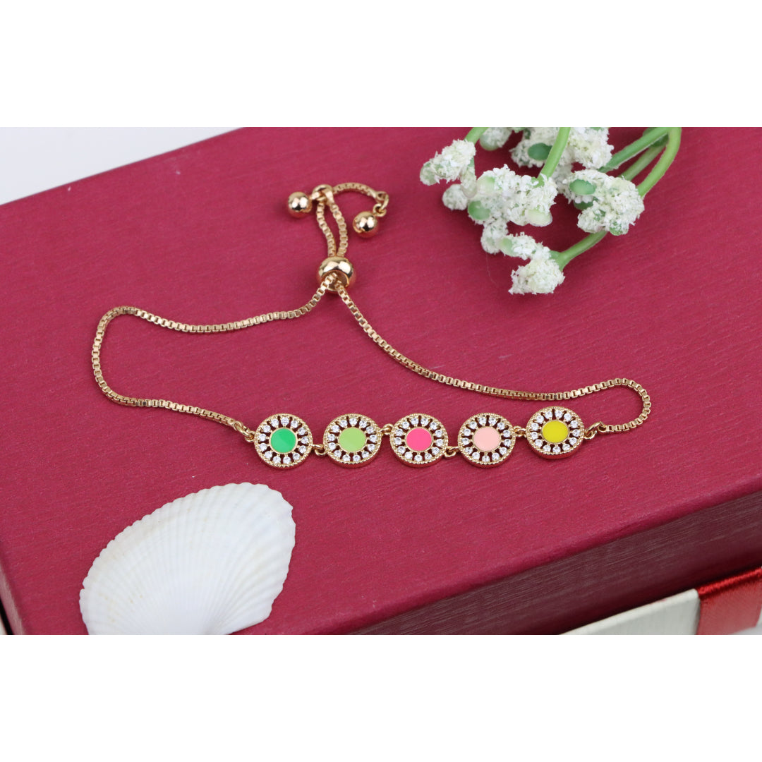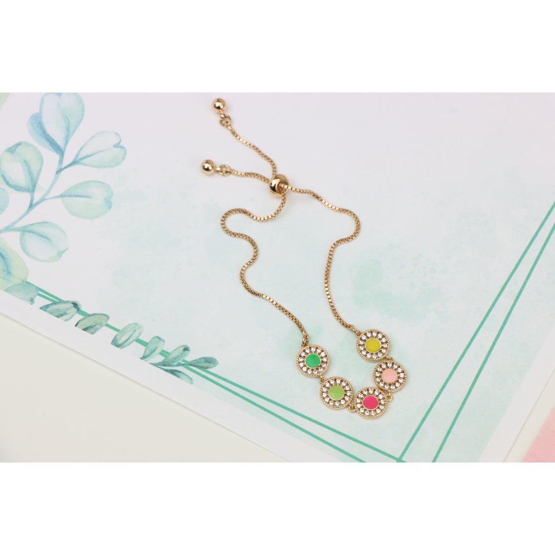 Elegant and eye-catching, this Rose Gold A-Bracelet is crafted with gold-plated high-quality brass, featuring vibrant colorful discs surrounded by sparkling stones. Perfect for adding a pop of color to any outfit.