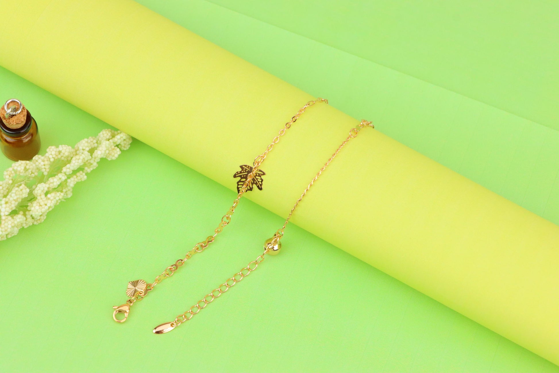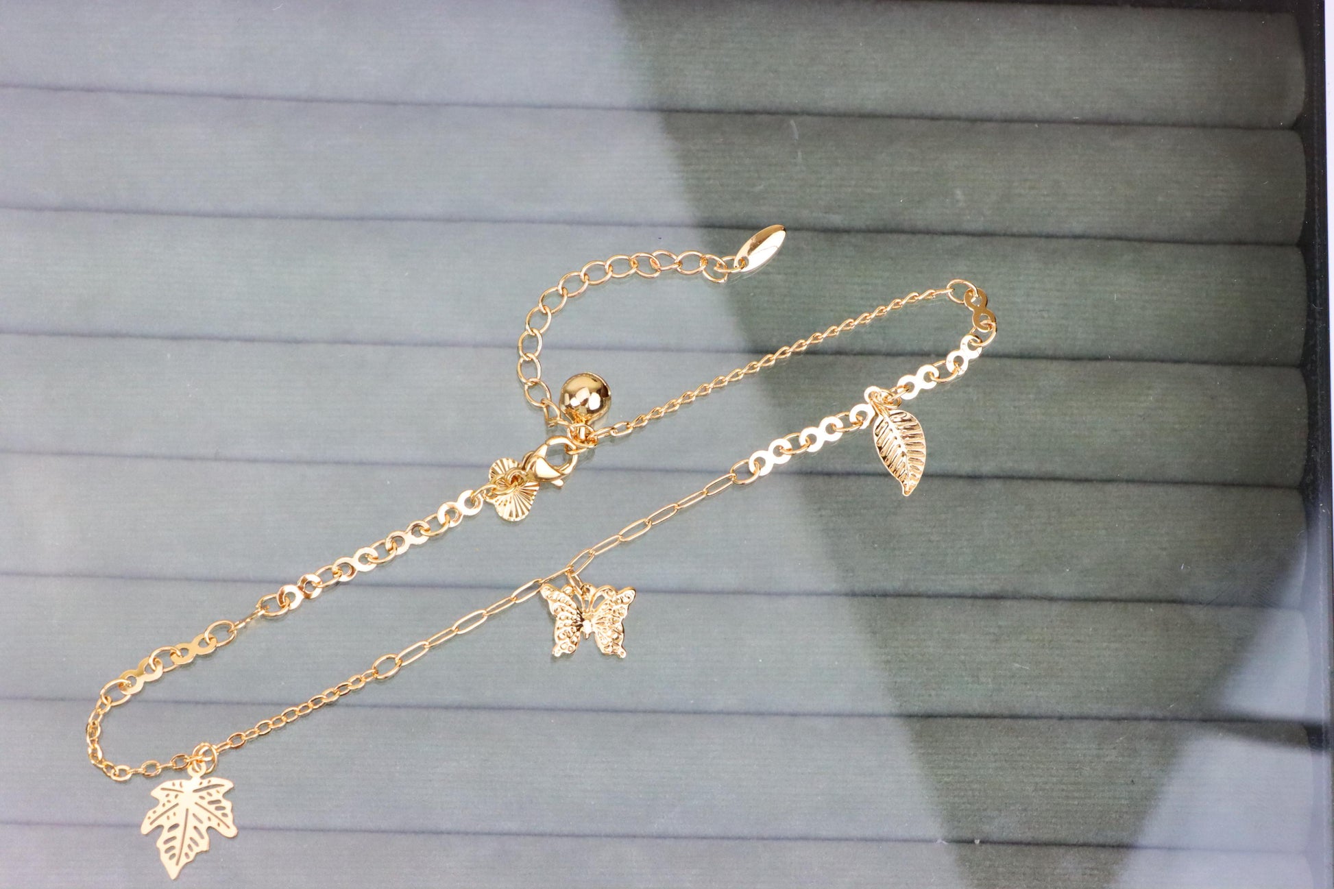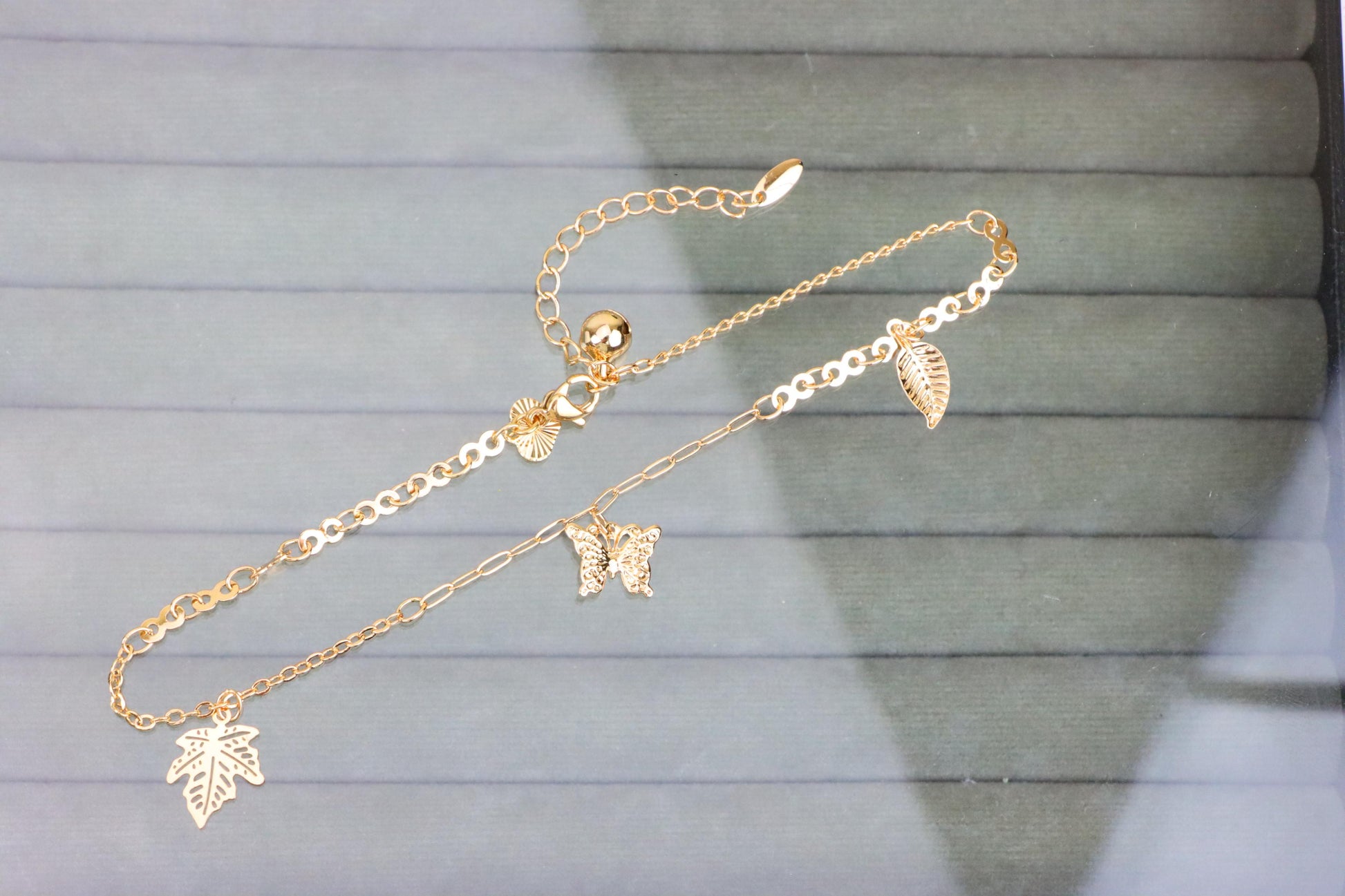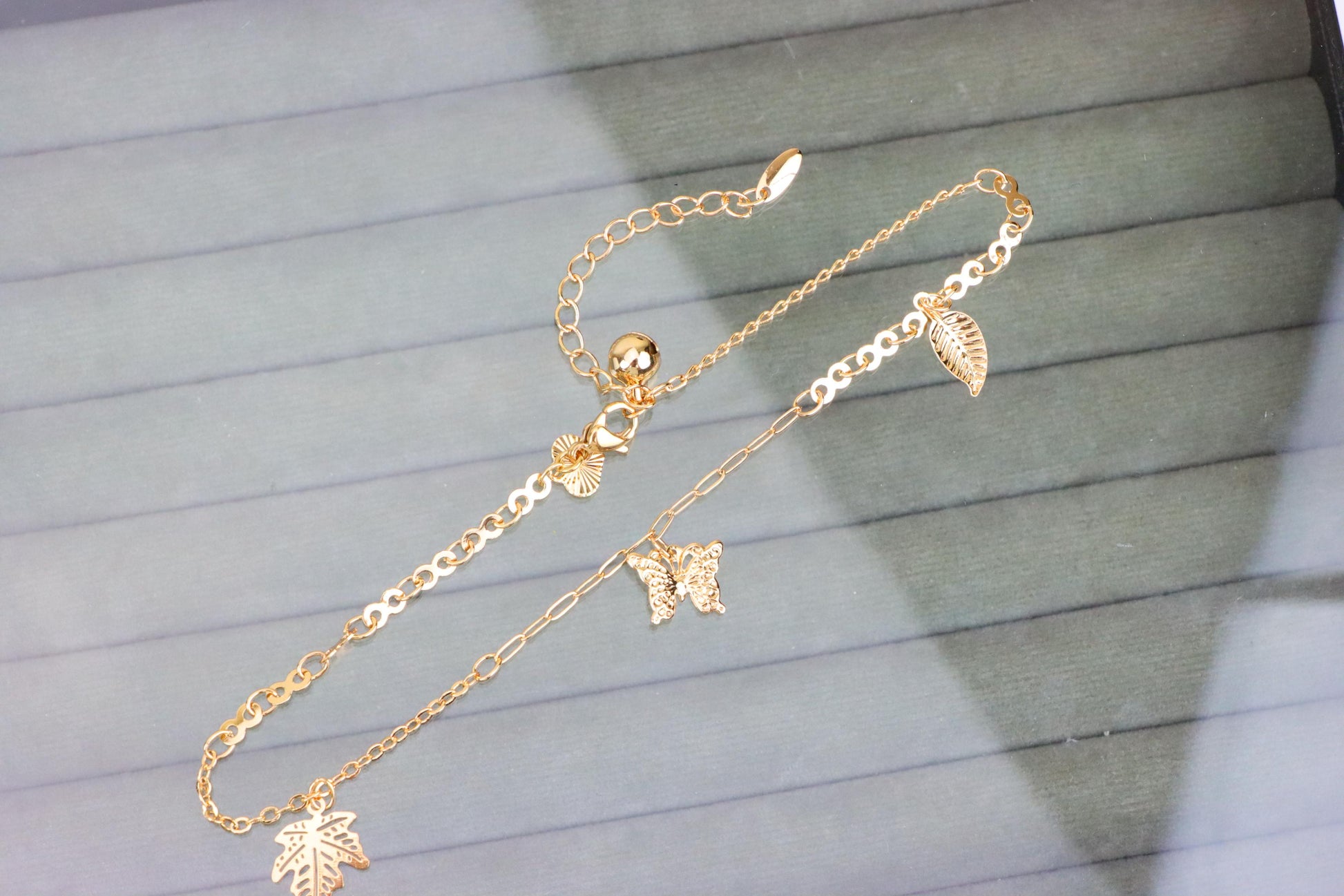Grace your ankle with this stylish rose gold anklet featuring delicate leaf and butterfly charms for a nature-inspired finish.