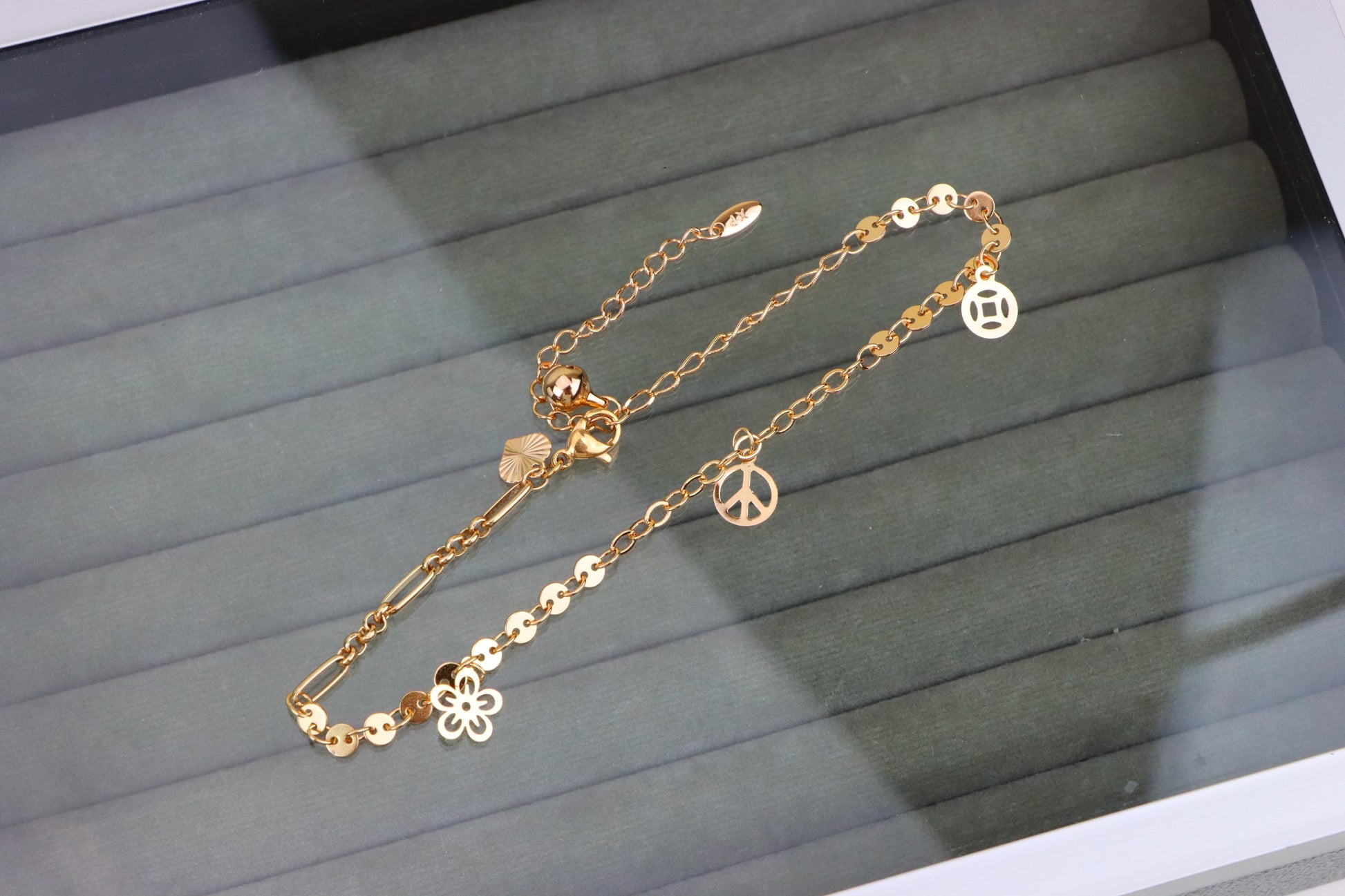 Chic and symbolic, this rose gold anklet blends floral beauty with peace-inspired charm details for a stylish, meaningful accessory.