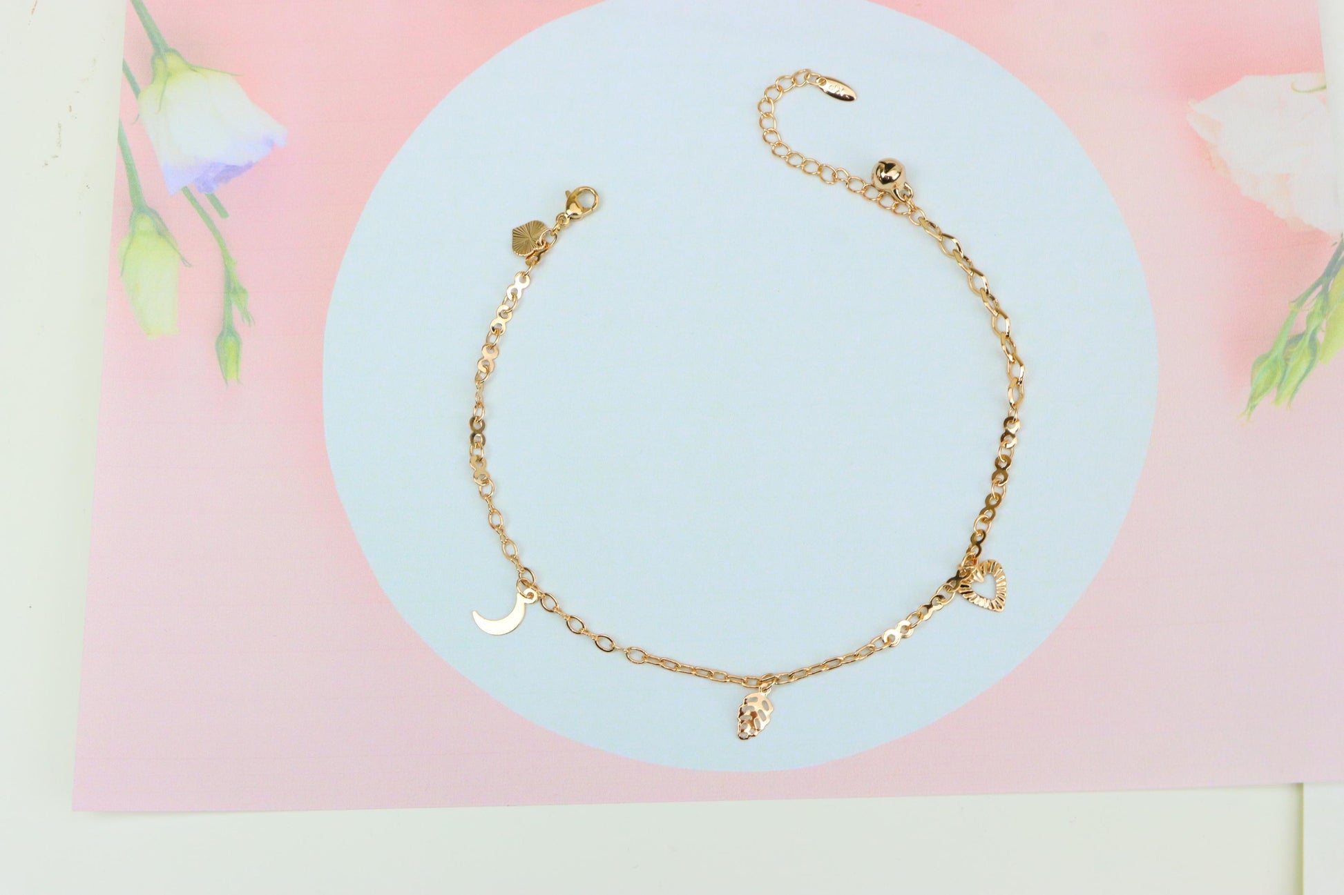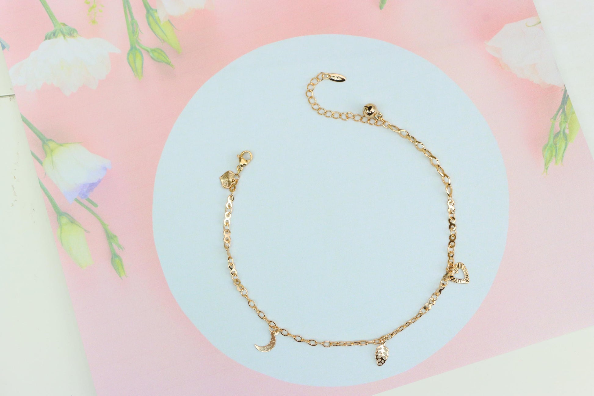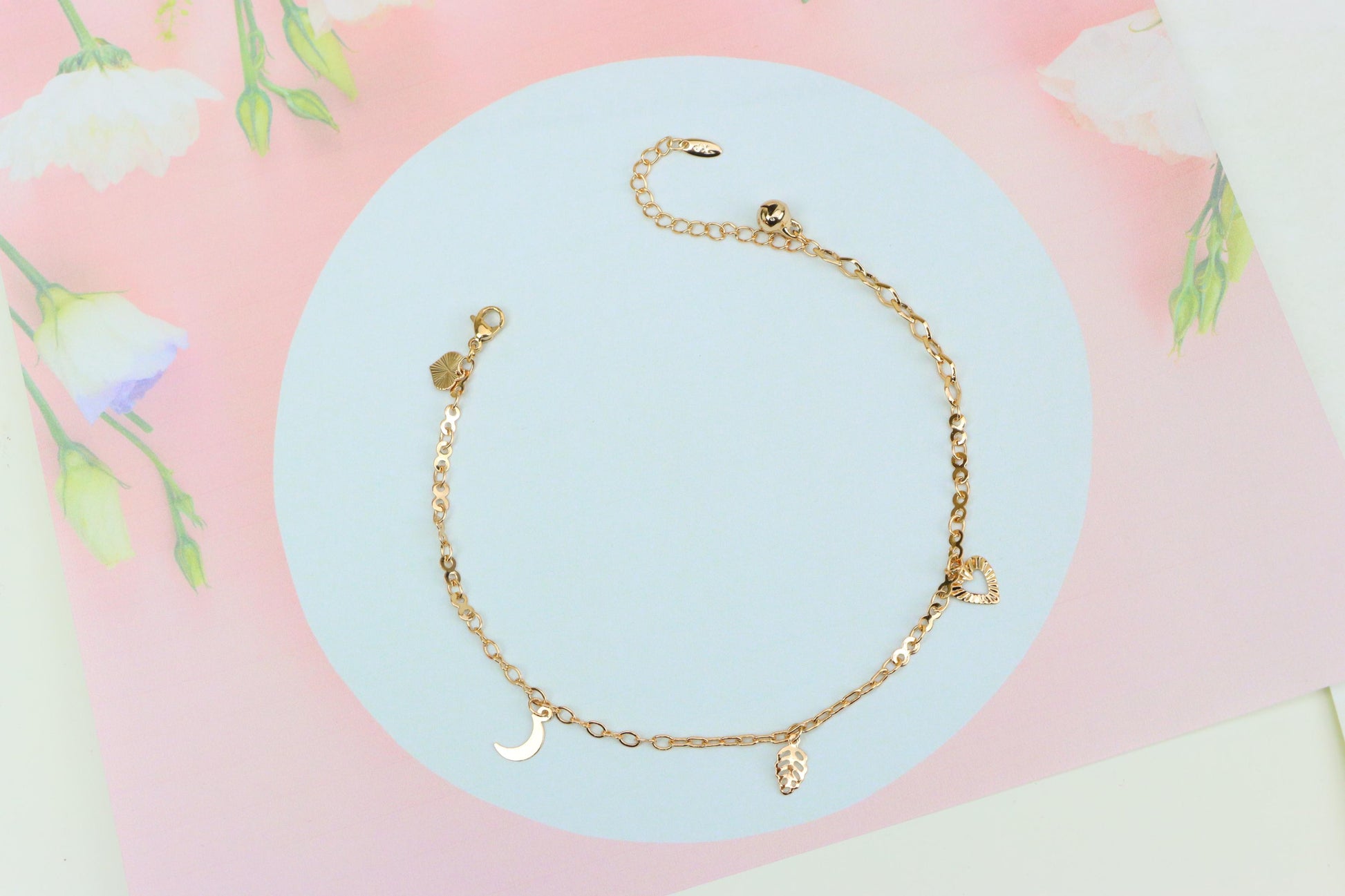 Rose Gold Anklet with Heart, Leaf & Moon Charms, XPAL1046
