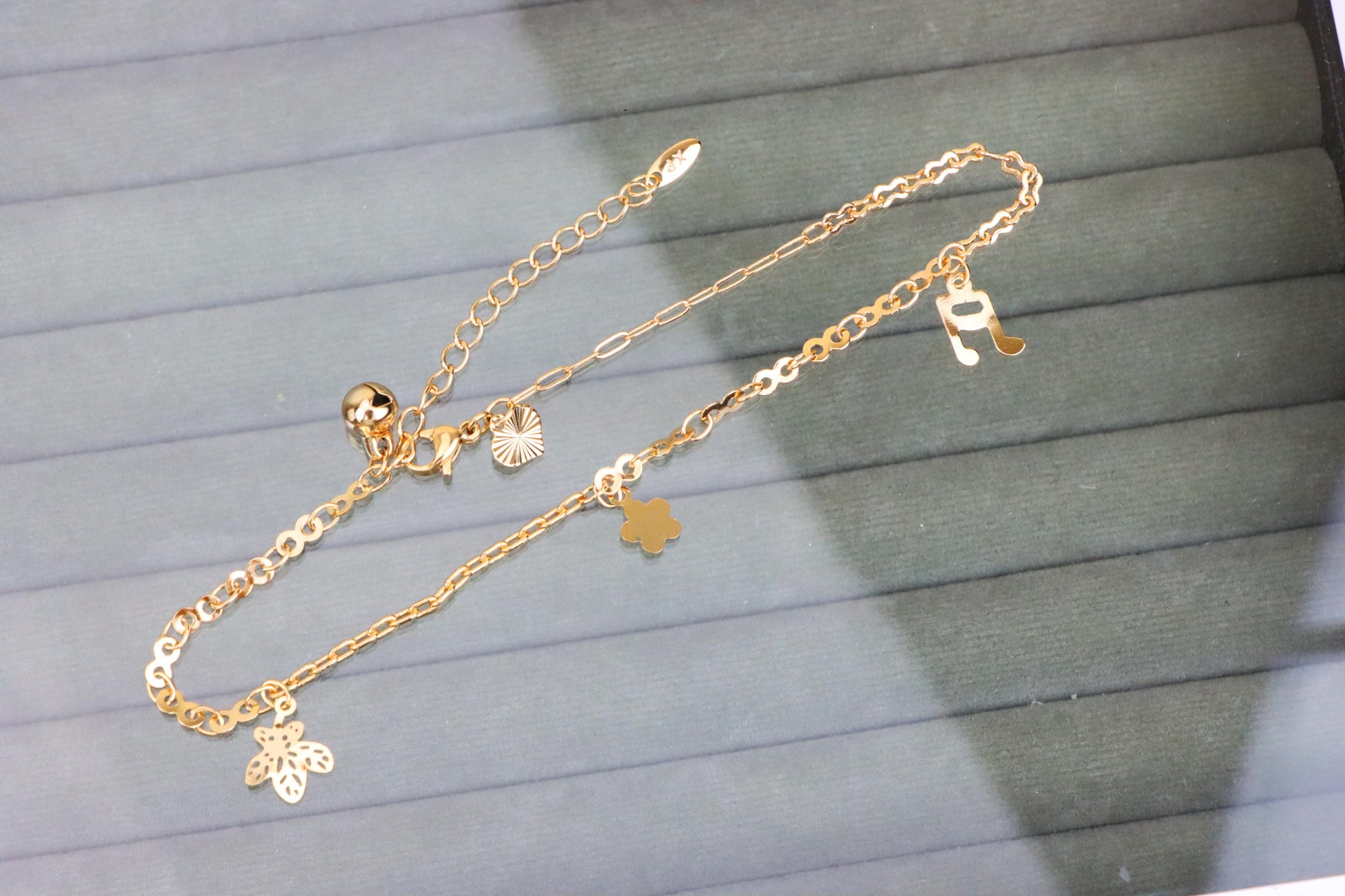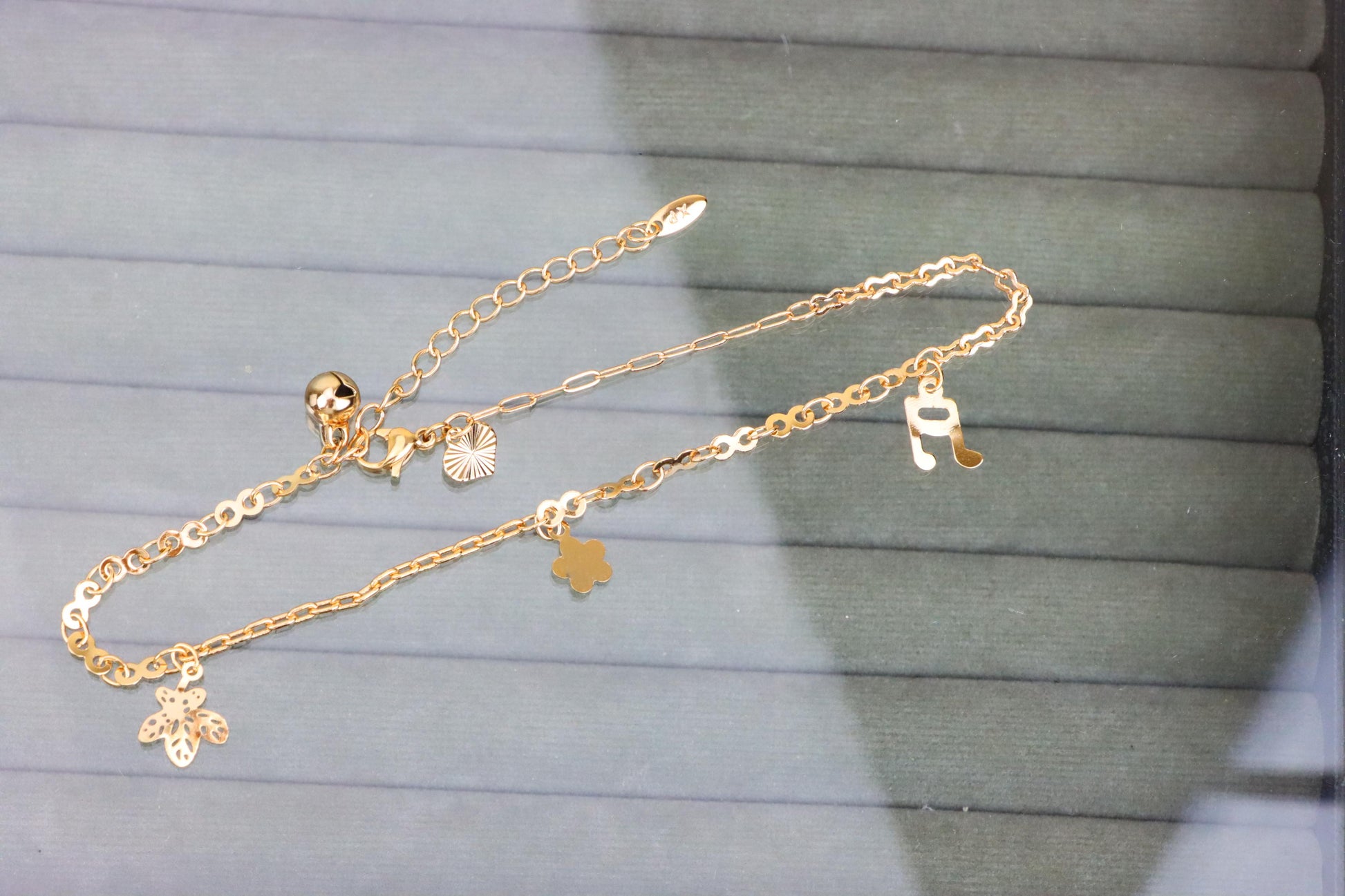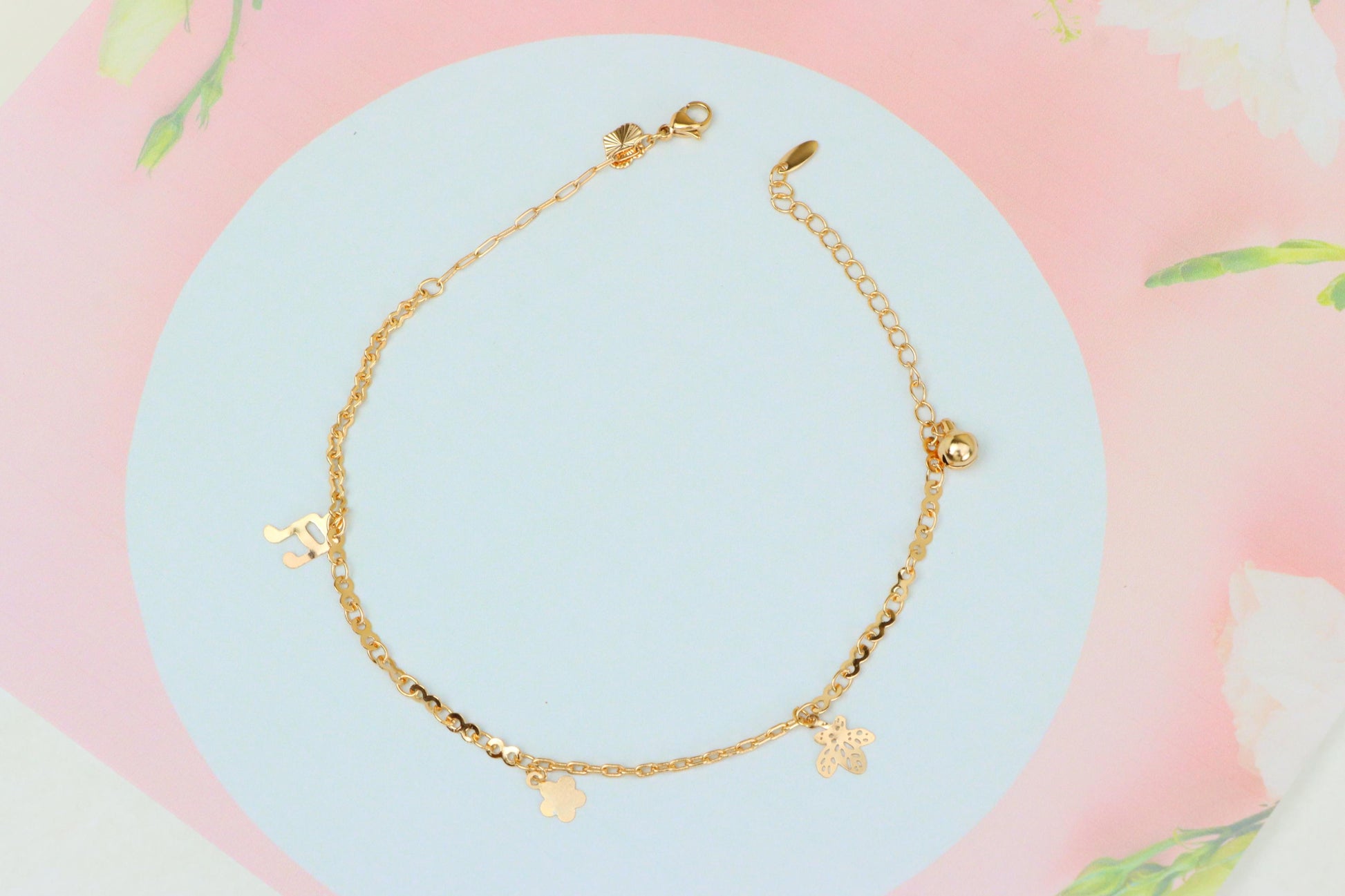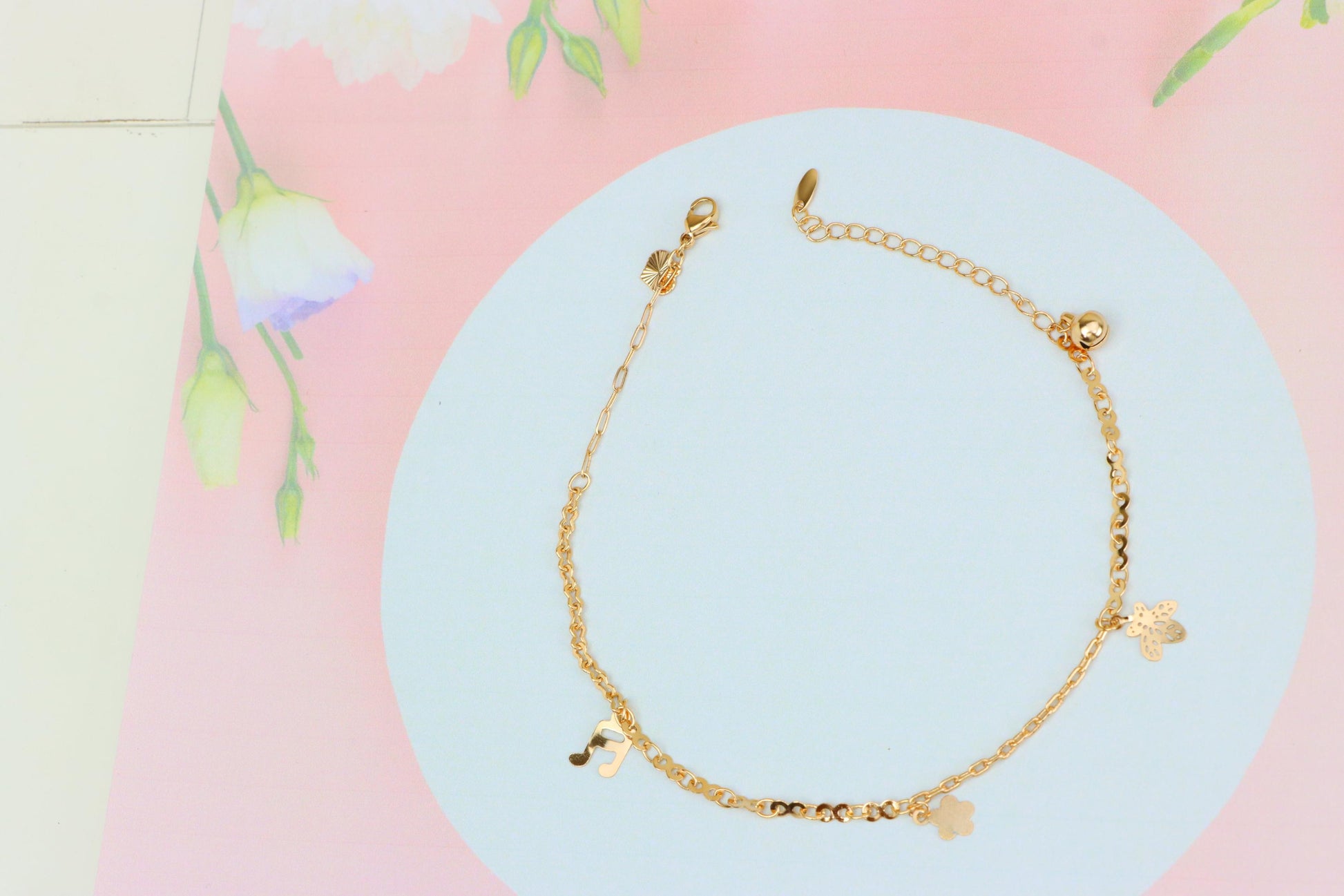 Elegant rose gold anklet featuring charming accents including a music note, floral, and butterfly motifs. Crafted in high quality brass with gold plating and a glossy finish.