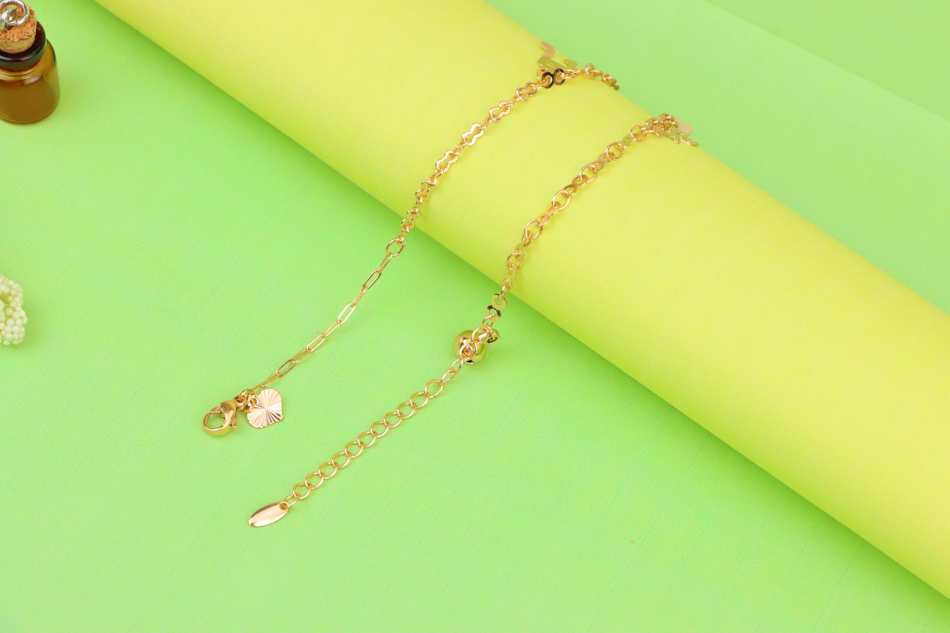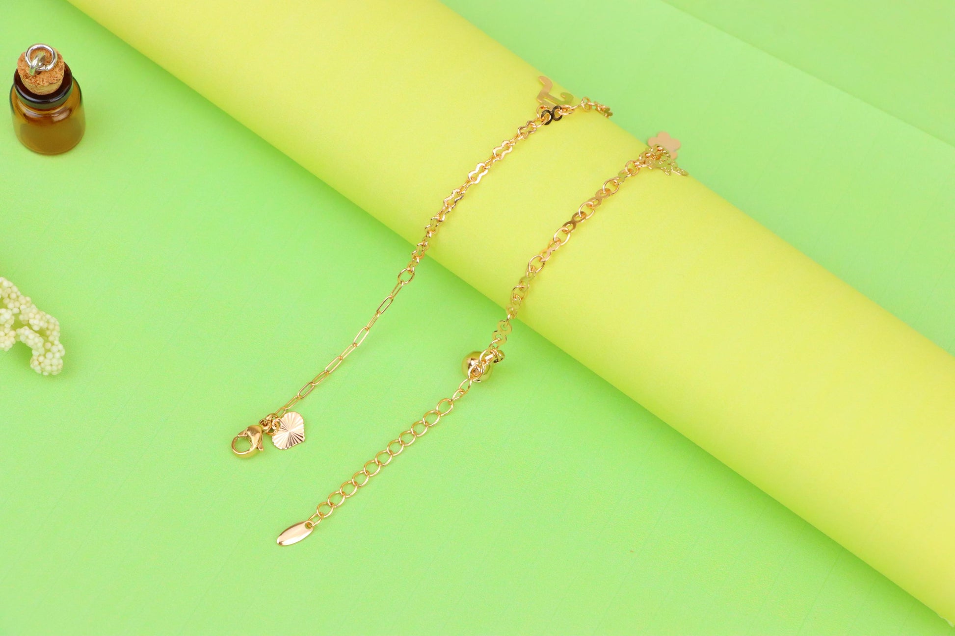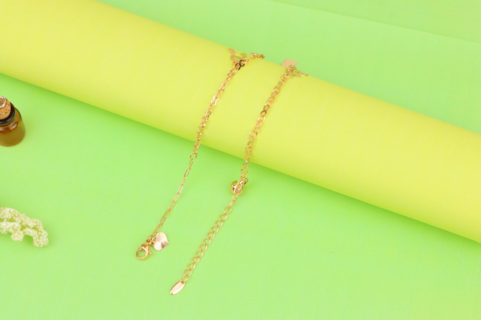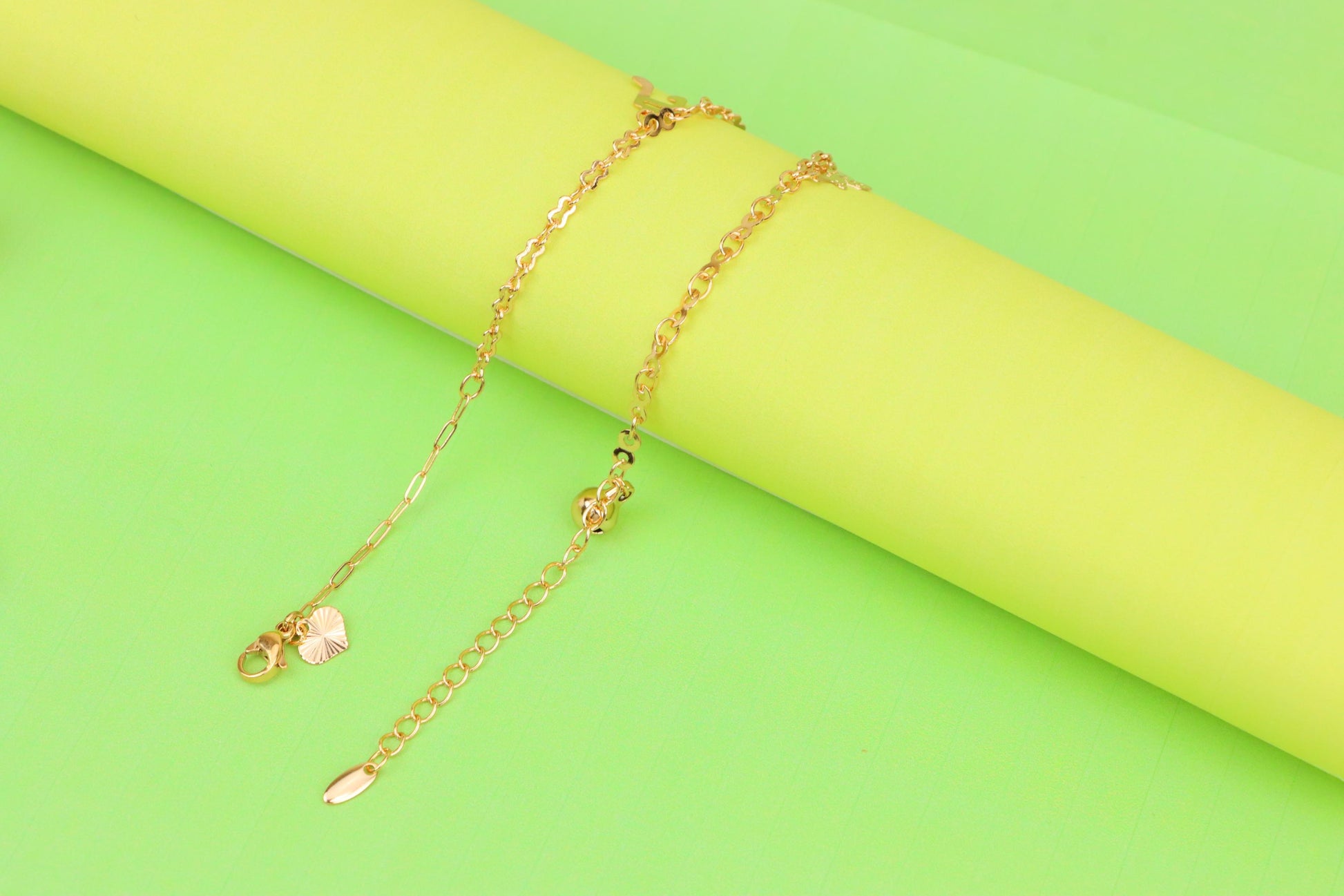 Elegant rose gold anklet featuring charming accents including a music note, floral, and butterfly motifs. Crafted in high quality brass with gold plating and a glossy finish.