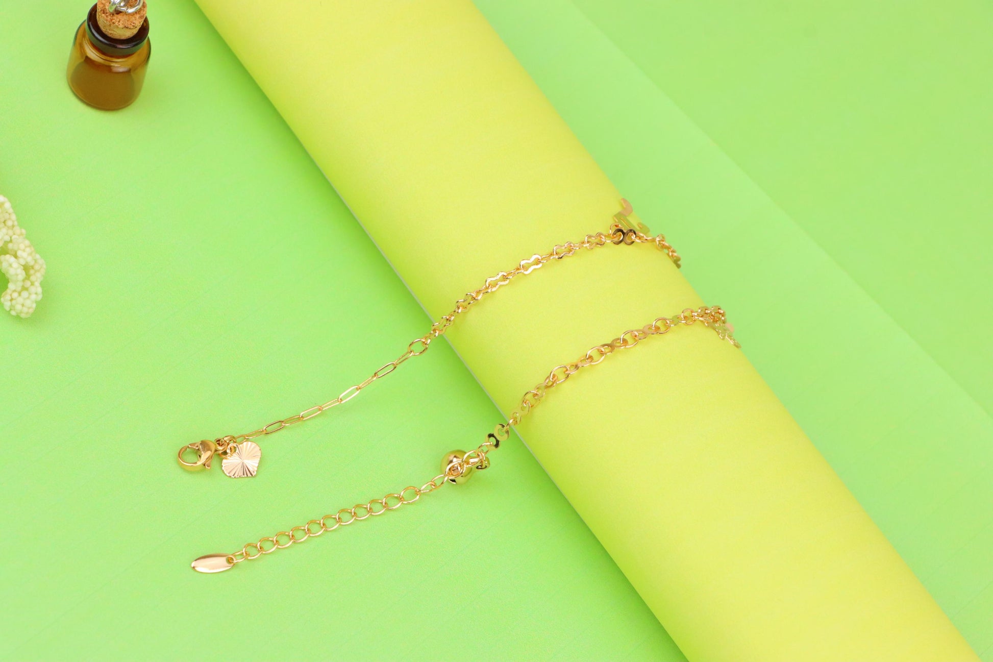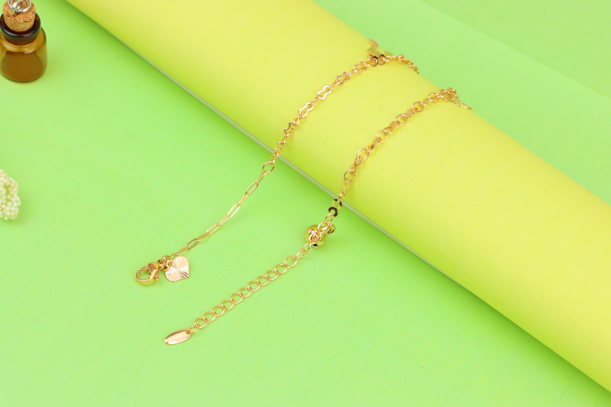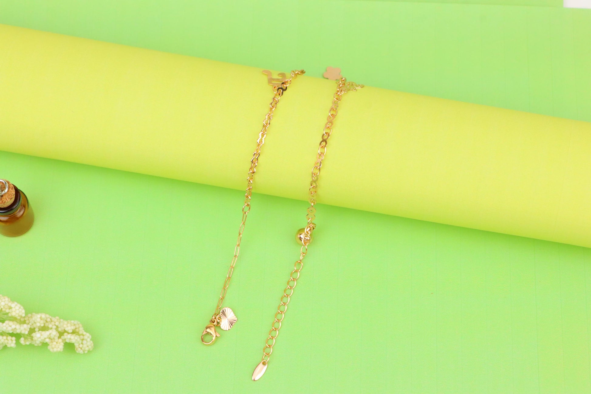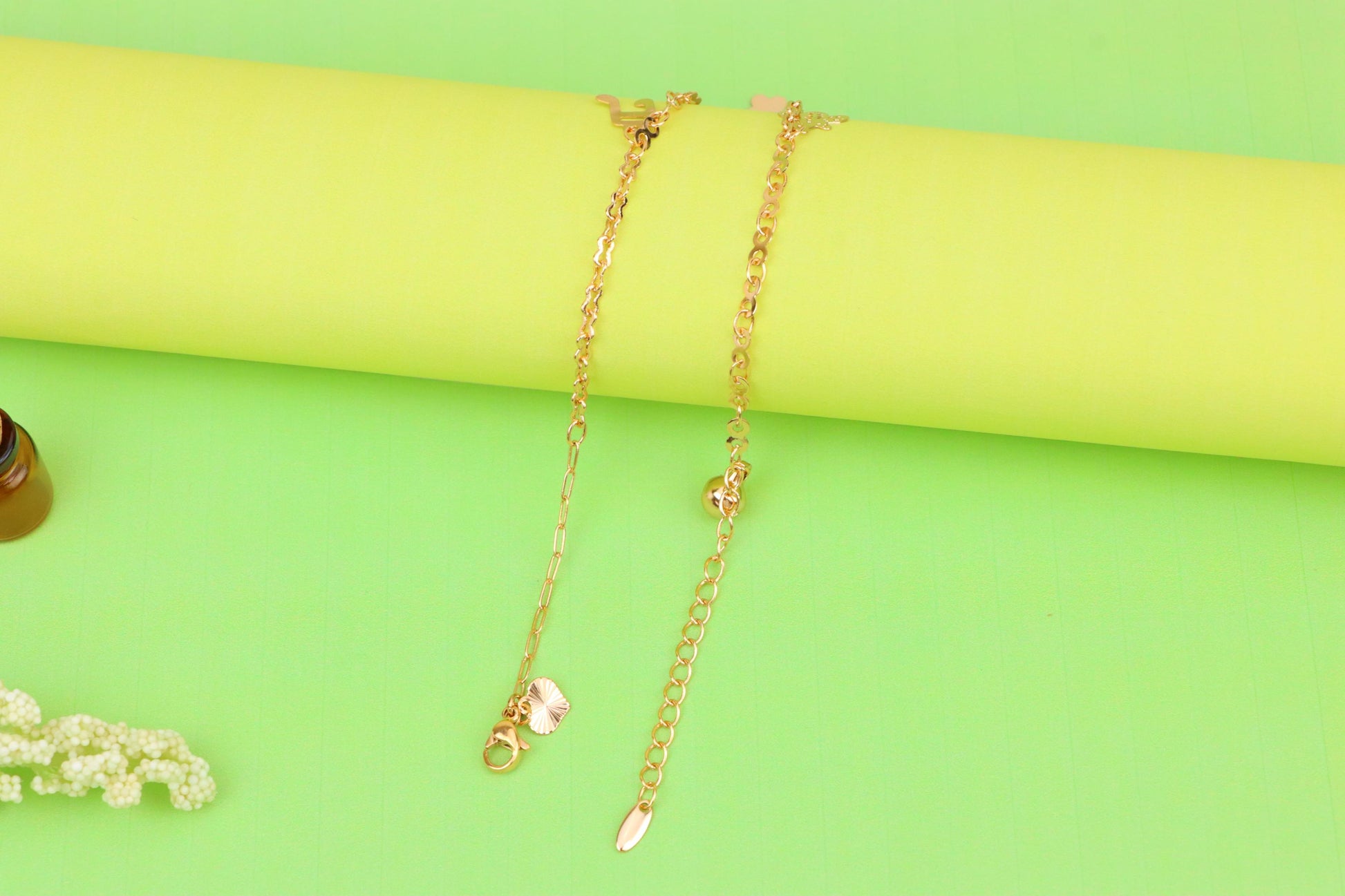 Elegant rose gold anklet featuring charming accents including a music note, floral, and butterfly motifs. Crafted in high quality brass with gold plating and a glossy finish.