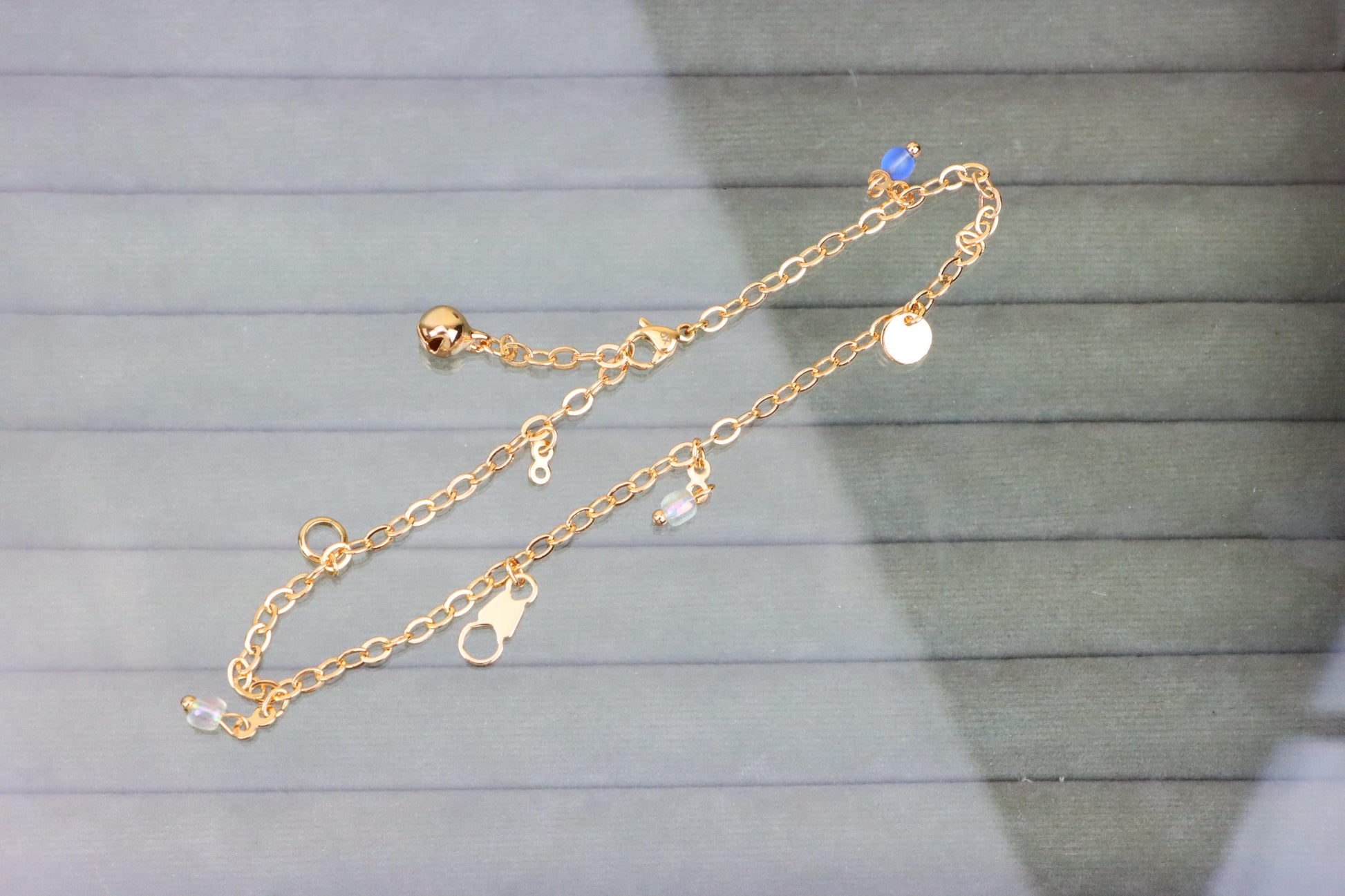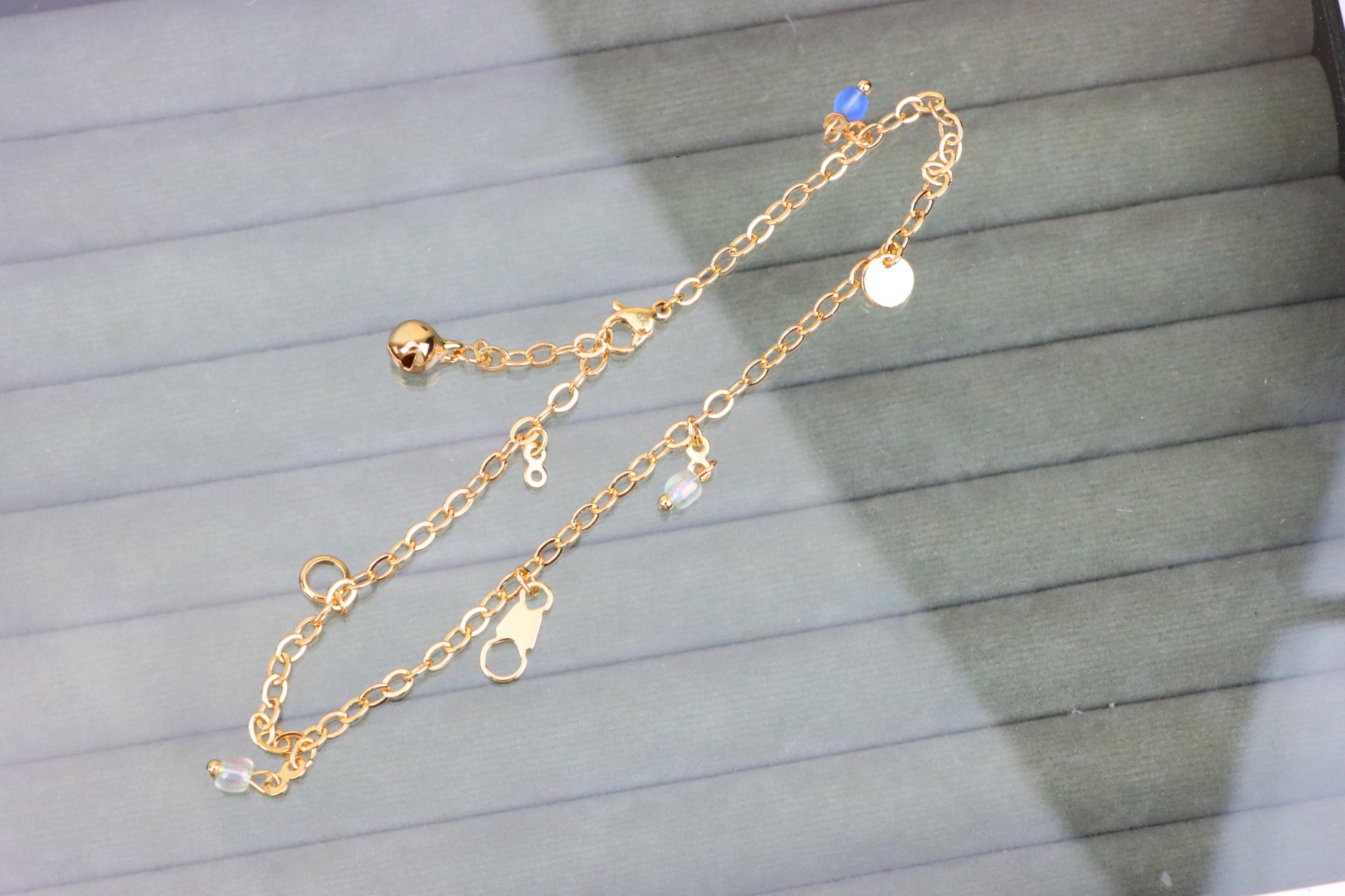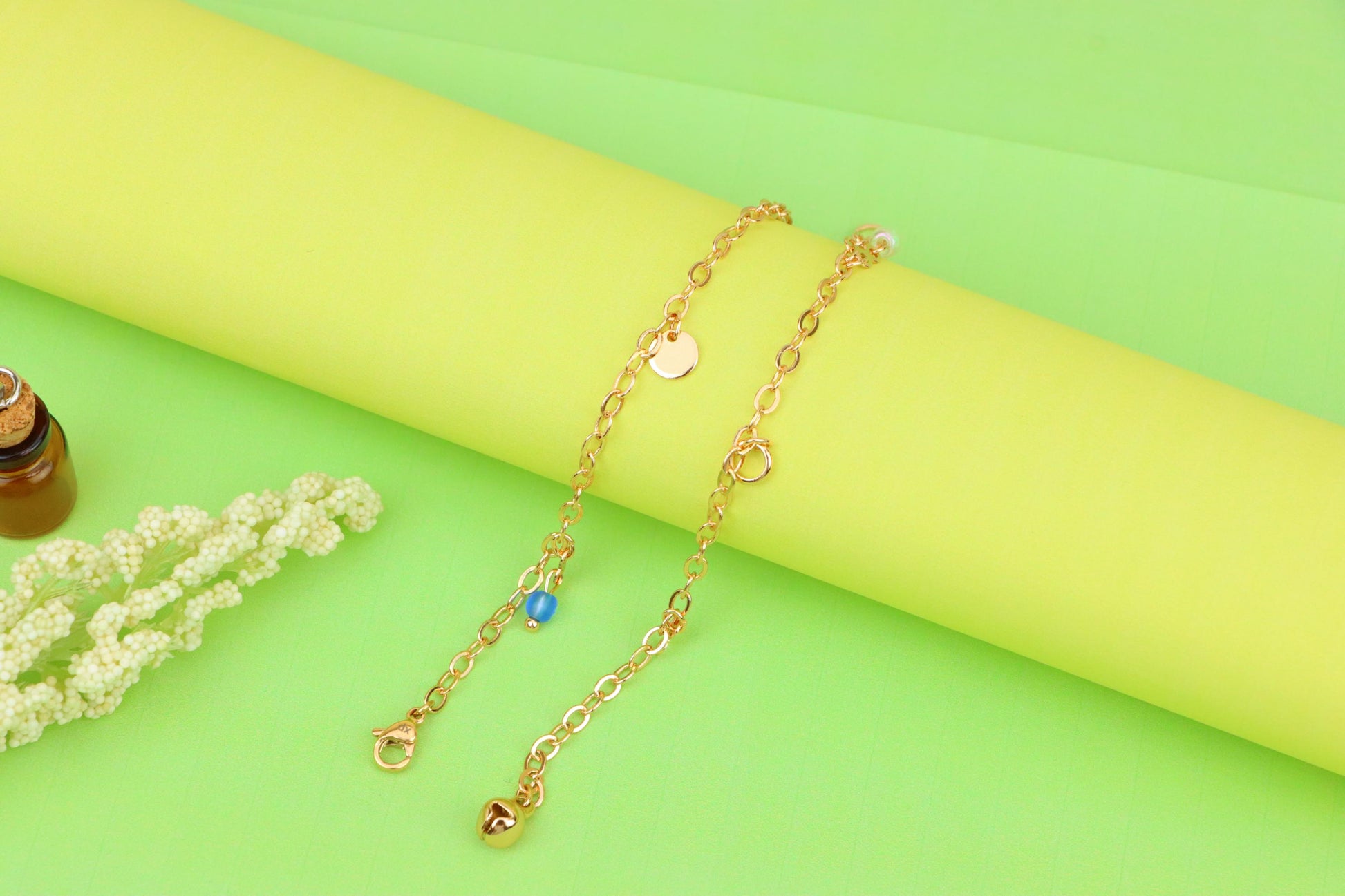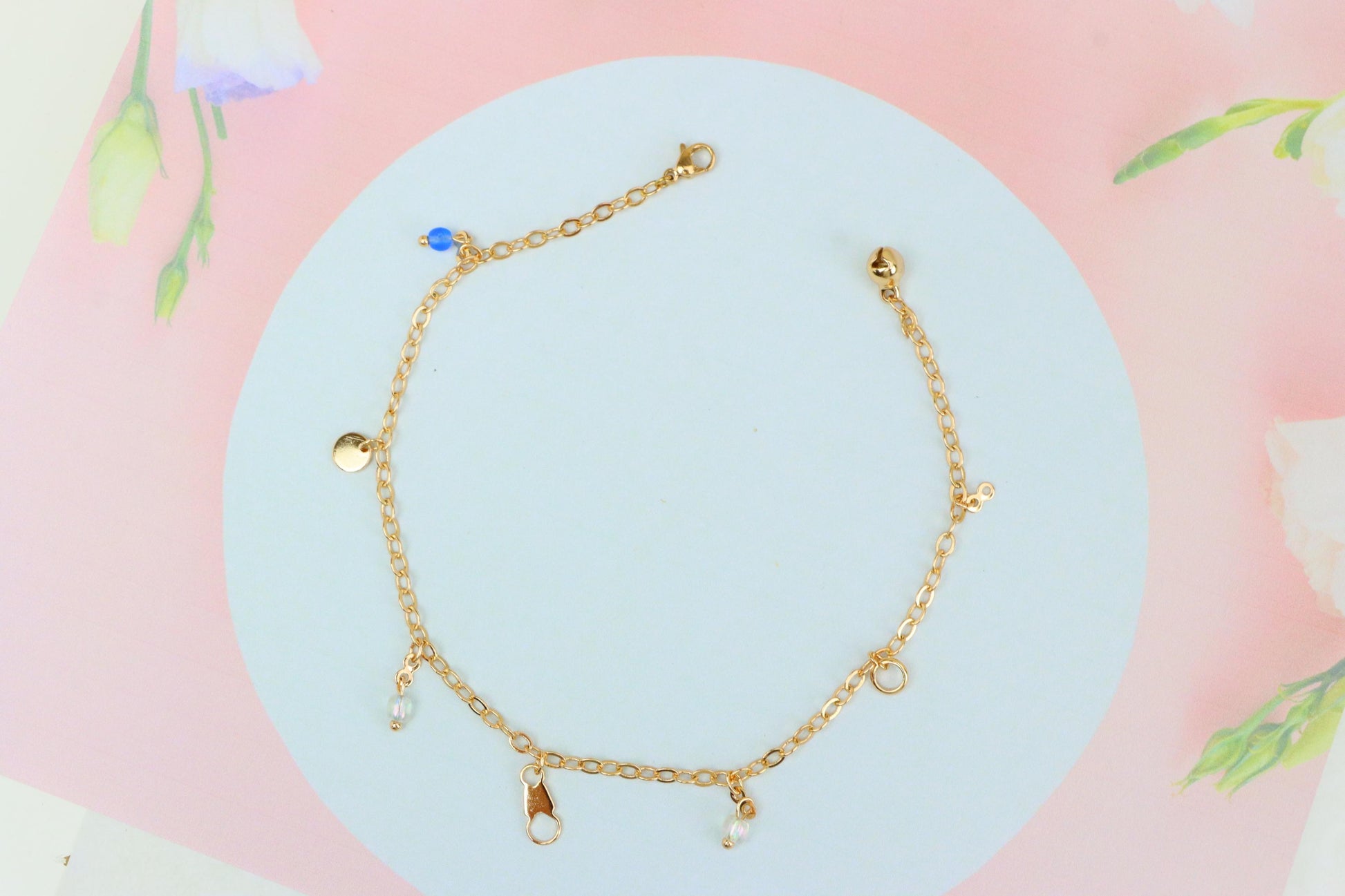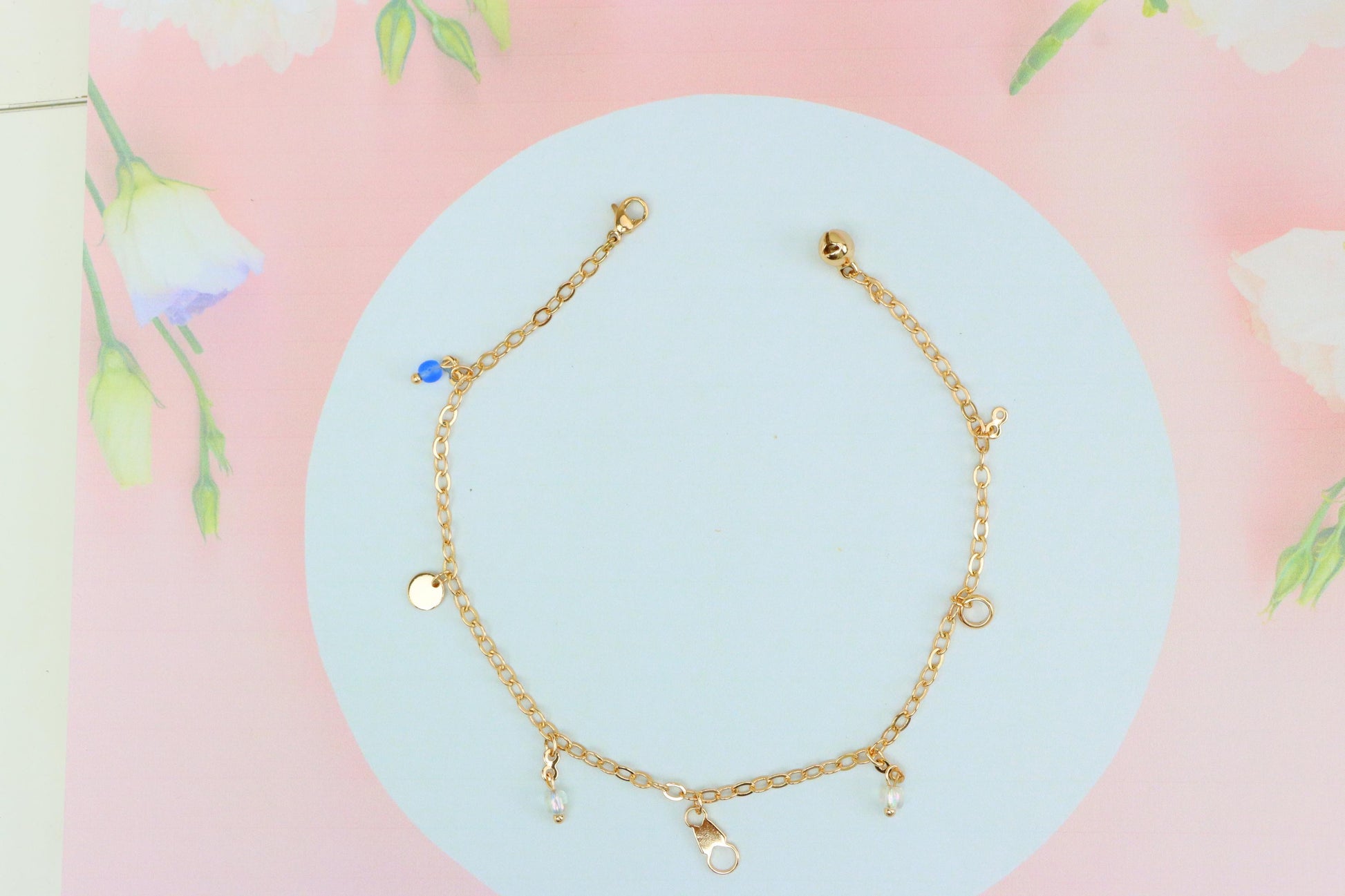 A playful yet elegant rose gold anklet featuring dainty pearl drops, a blue bead, and charming disc details for a trendy finish.