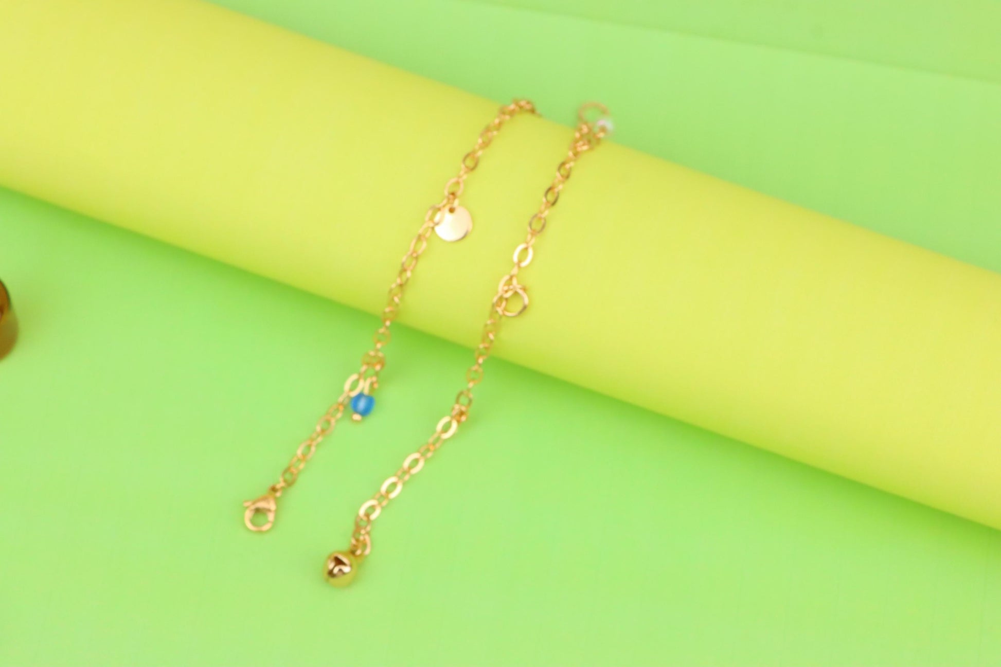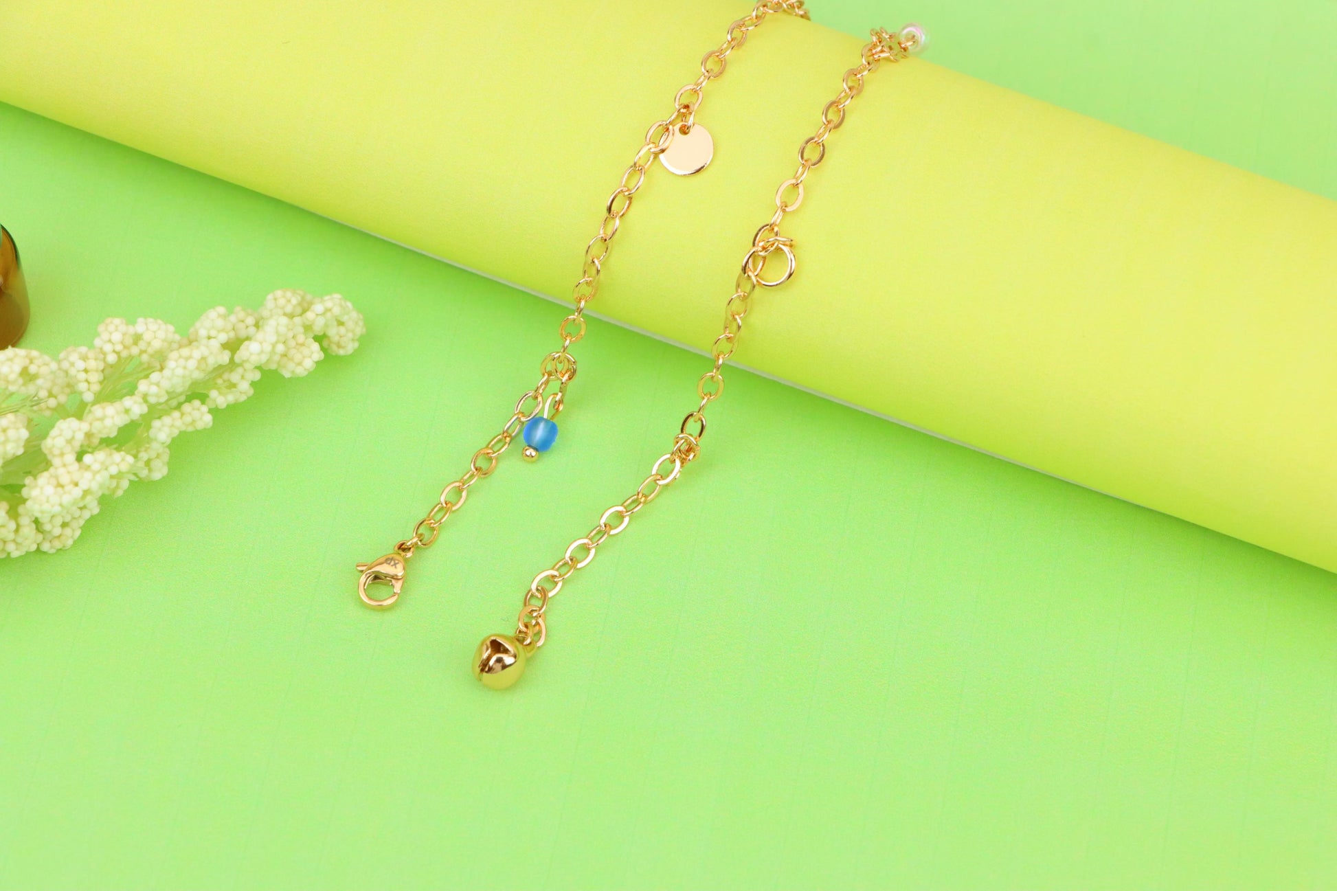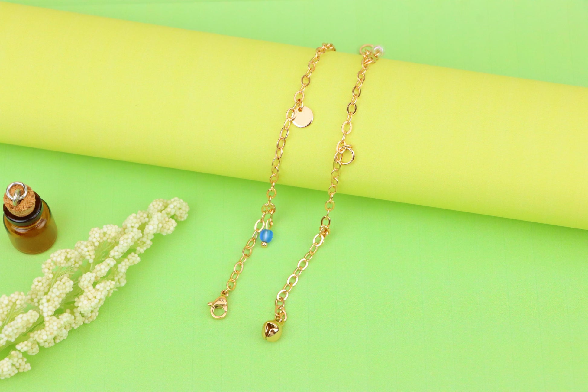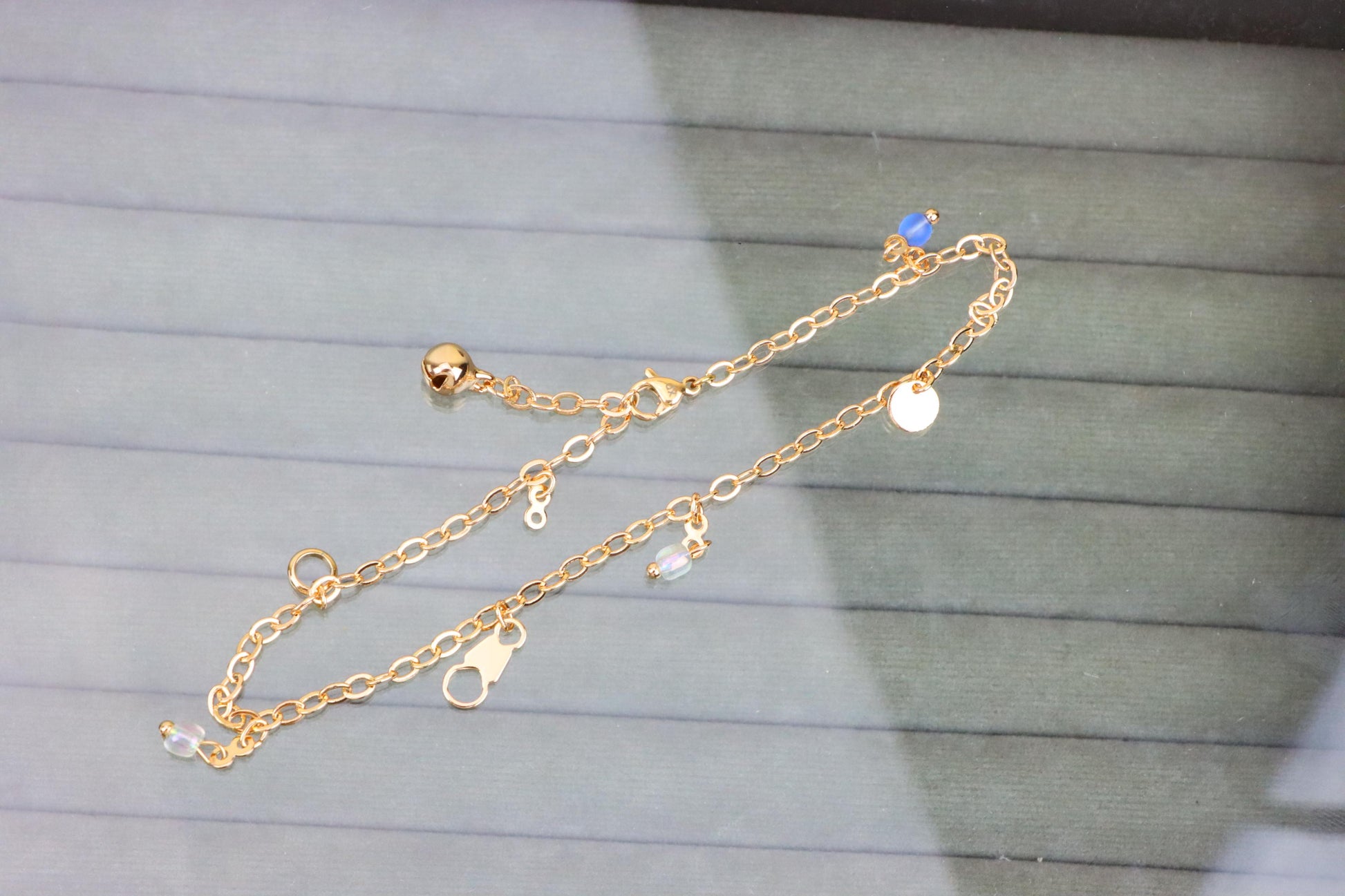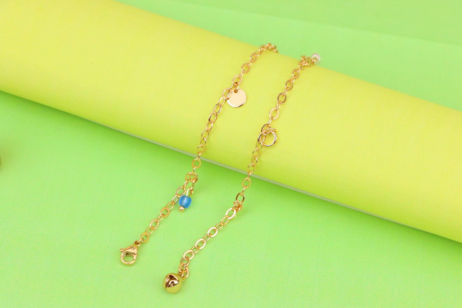 A playful yet elegant rose gold anklet featuring dainty pearl drops, a blue bead, and charming disc details for a trendy finish.