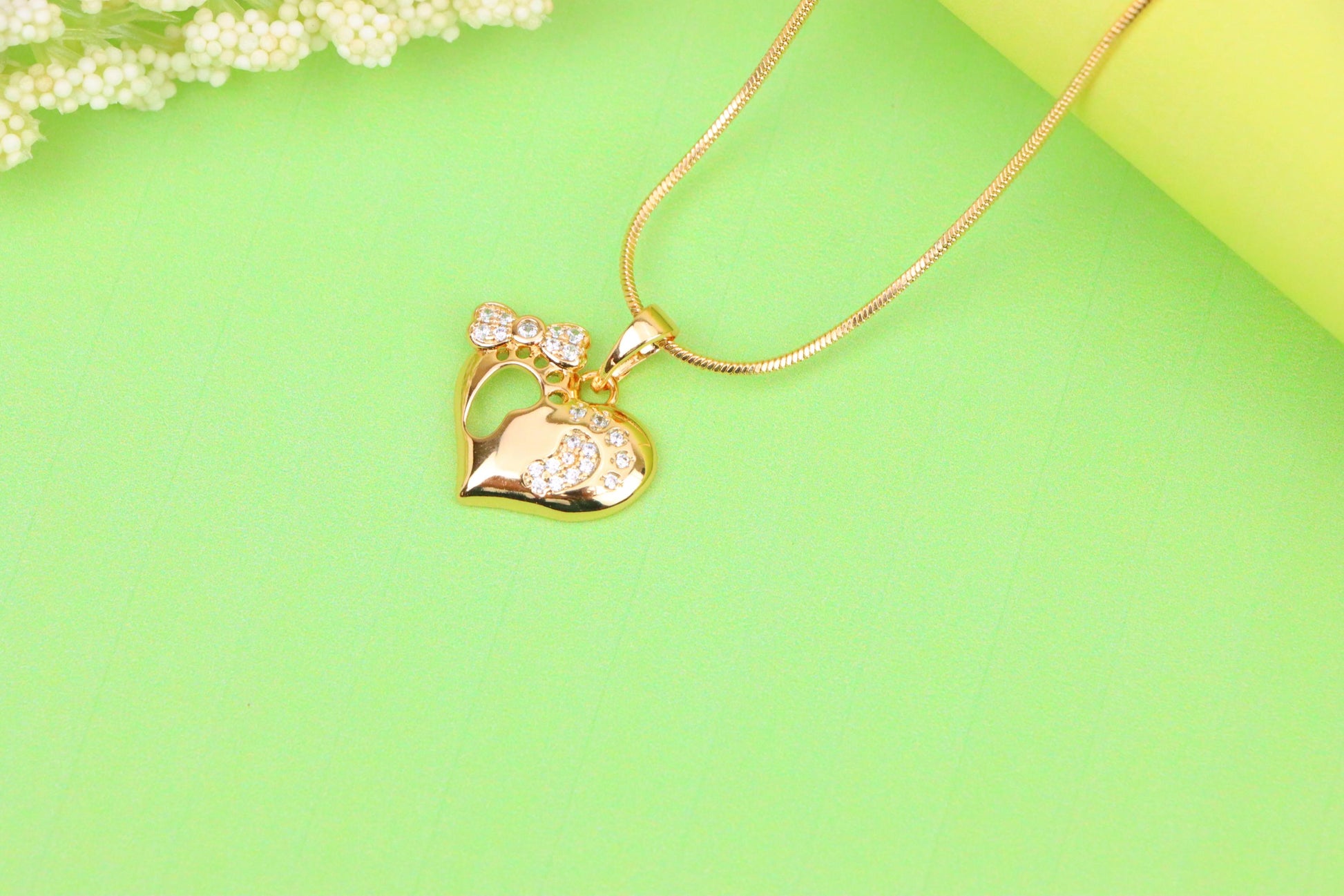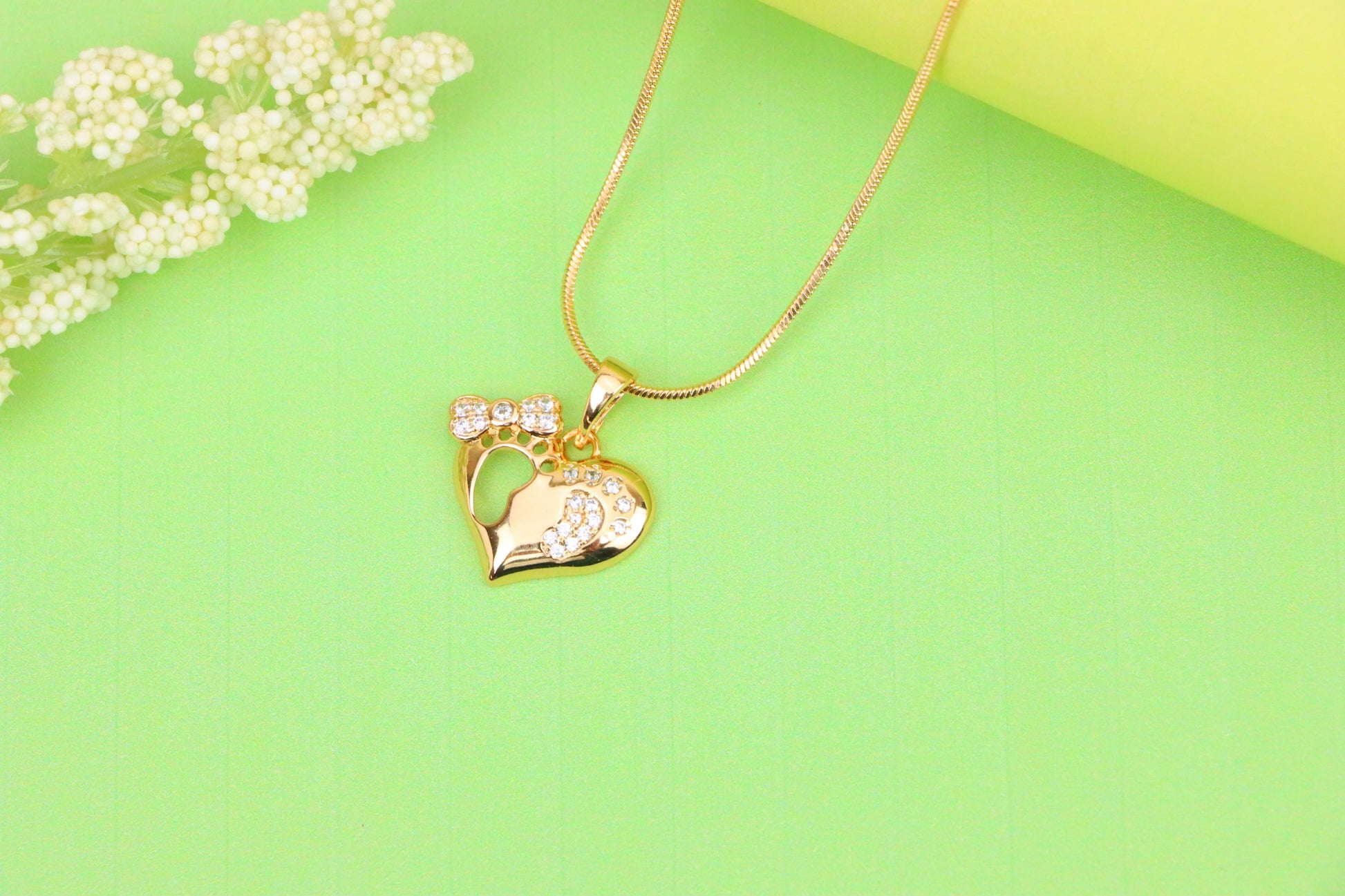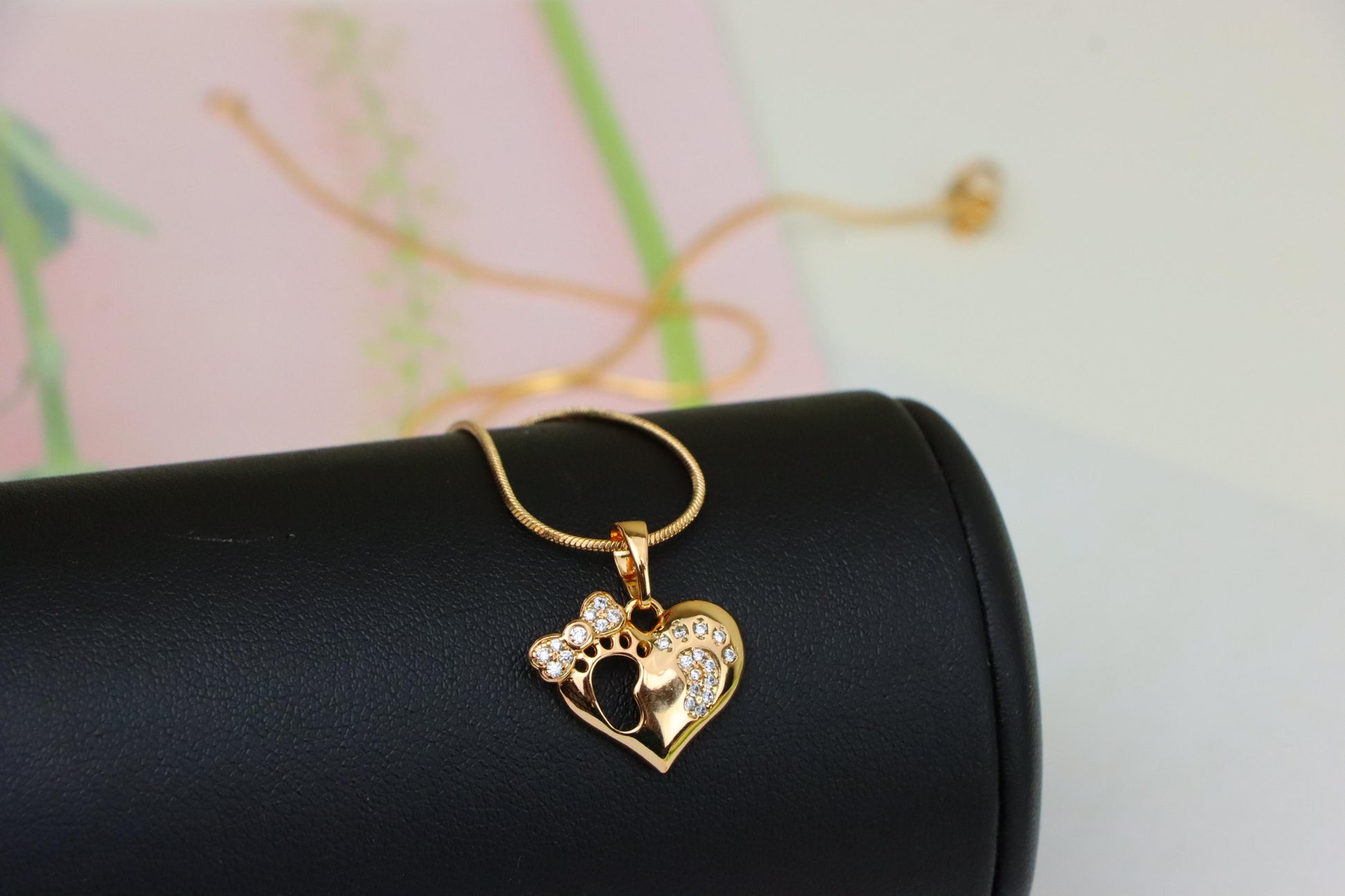 A sweet heart-shaped pendant featuring baby footprints and stones.