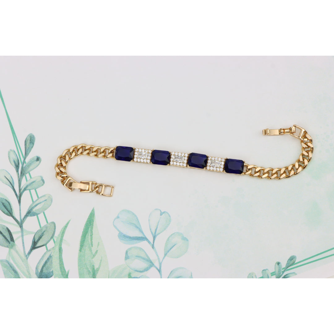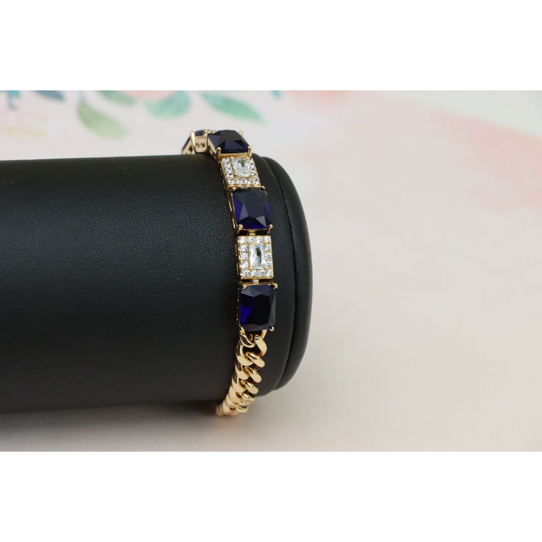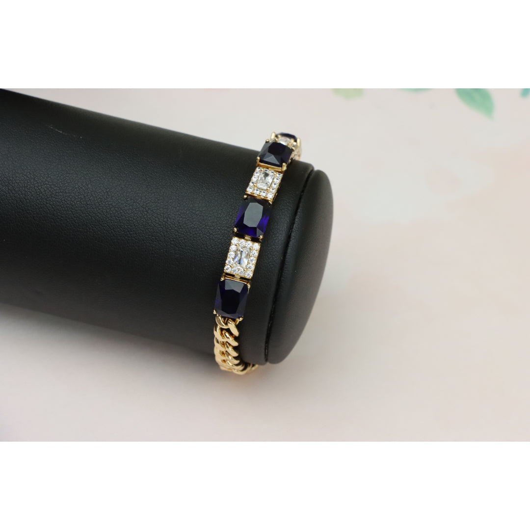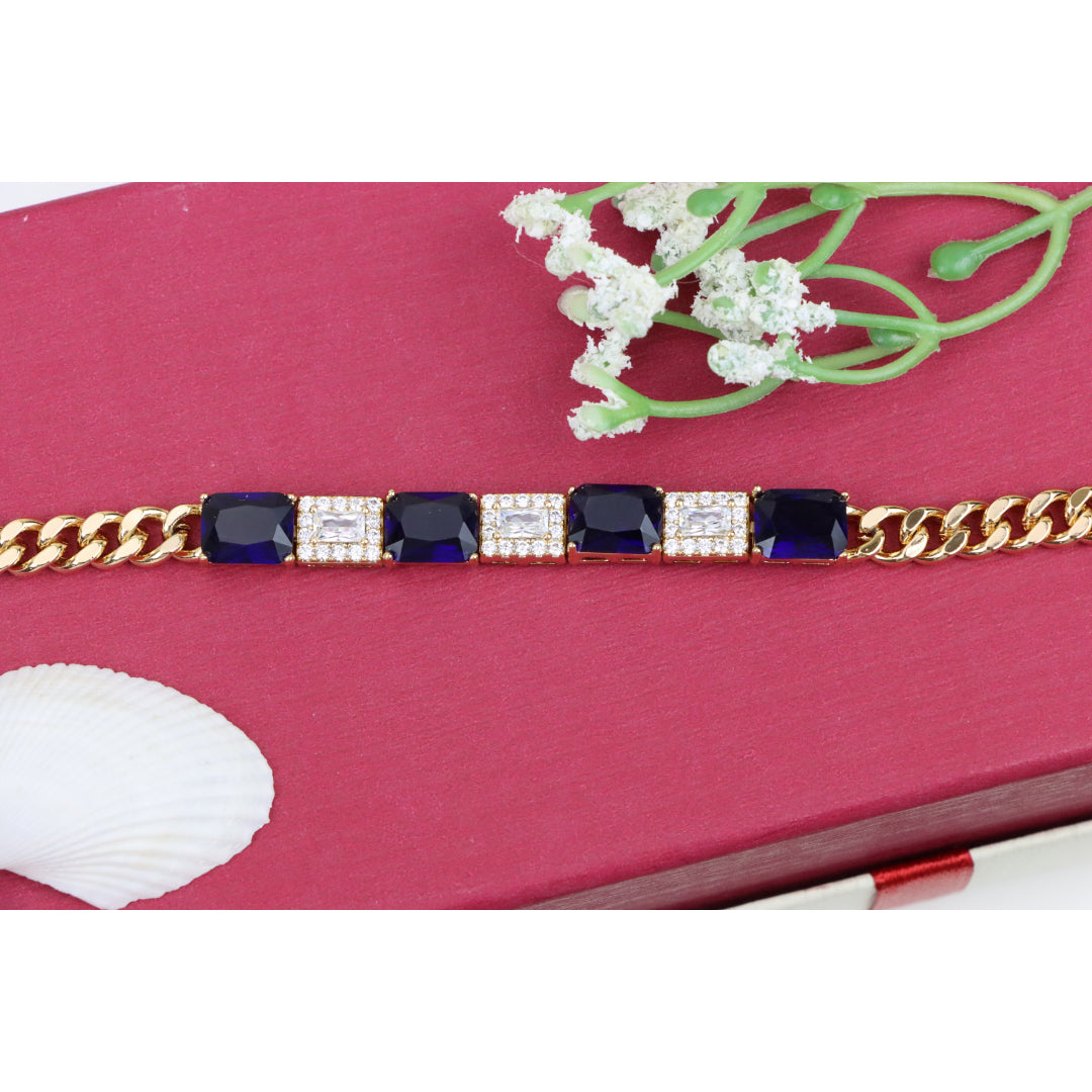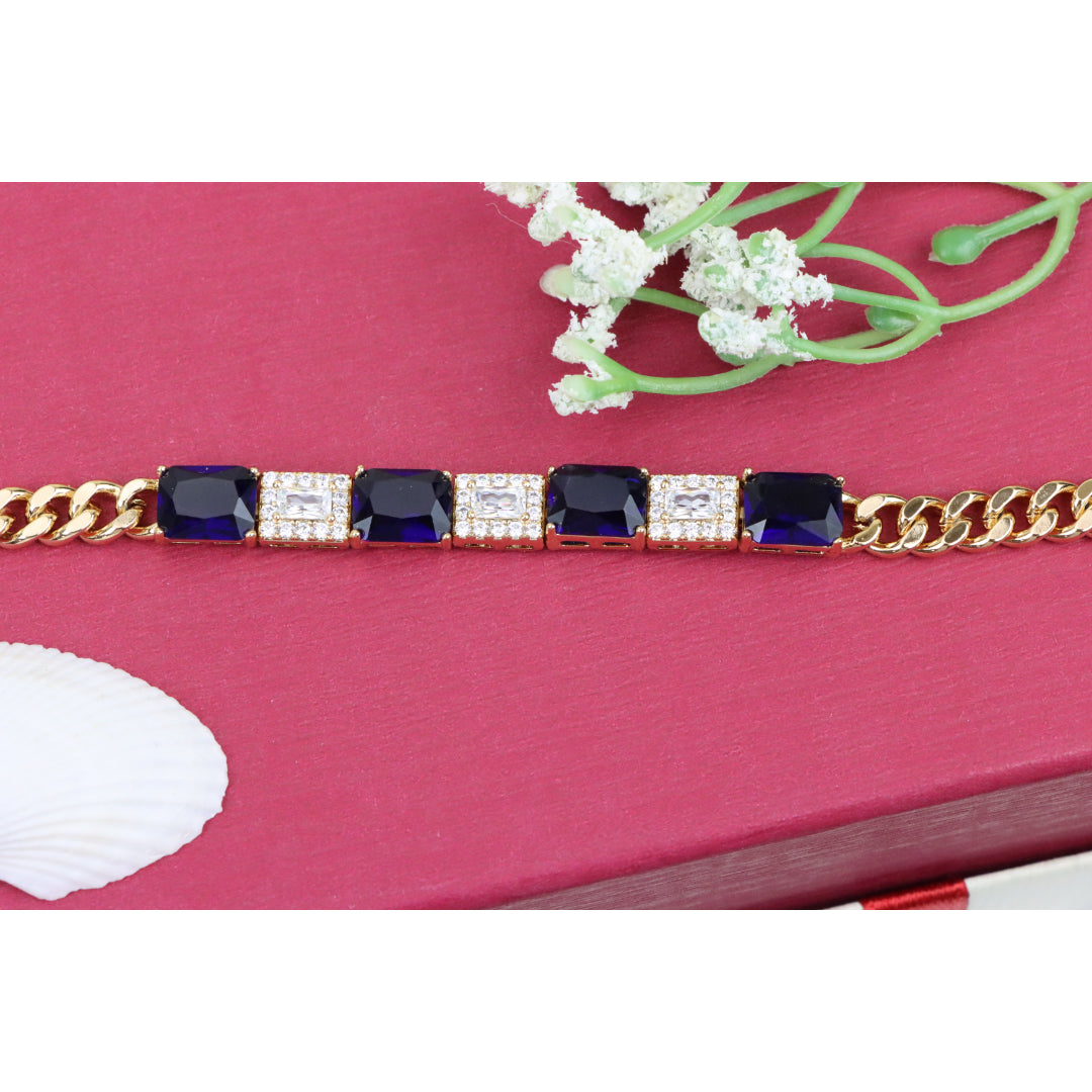 This elegant bracelet pairs rich sapphire-toned stones with sparkling white crystals, set in a sleek rose gold finish for a luxurious touch.