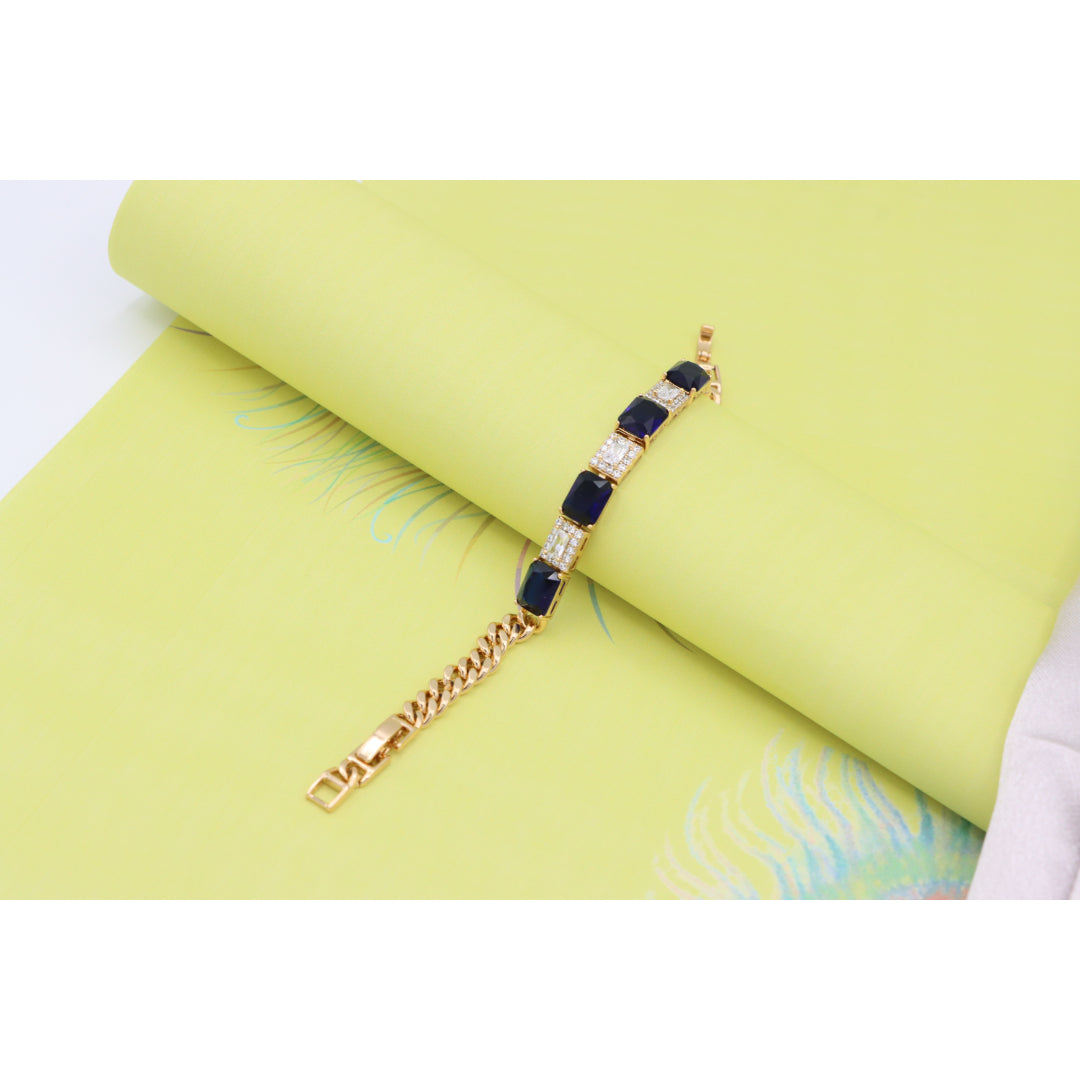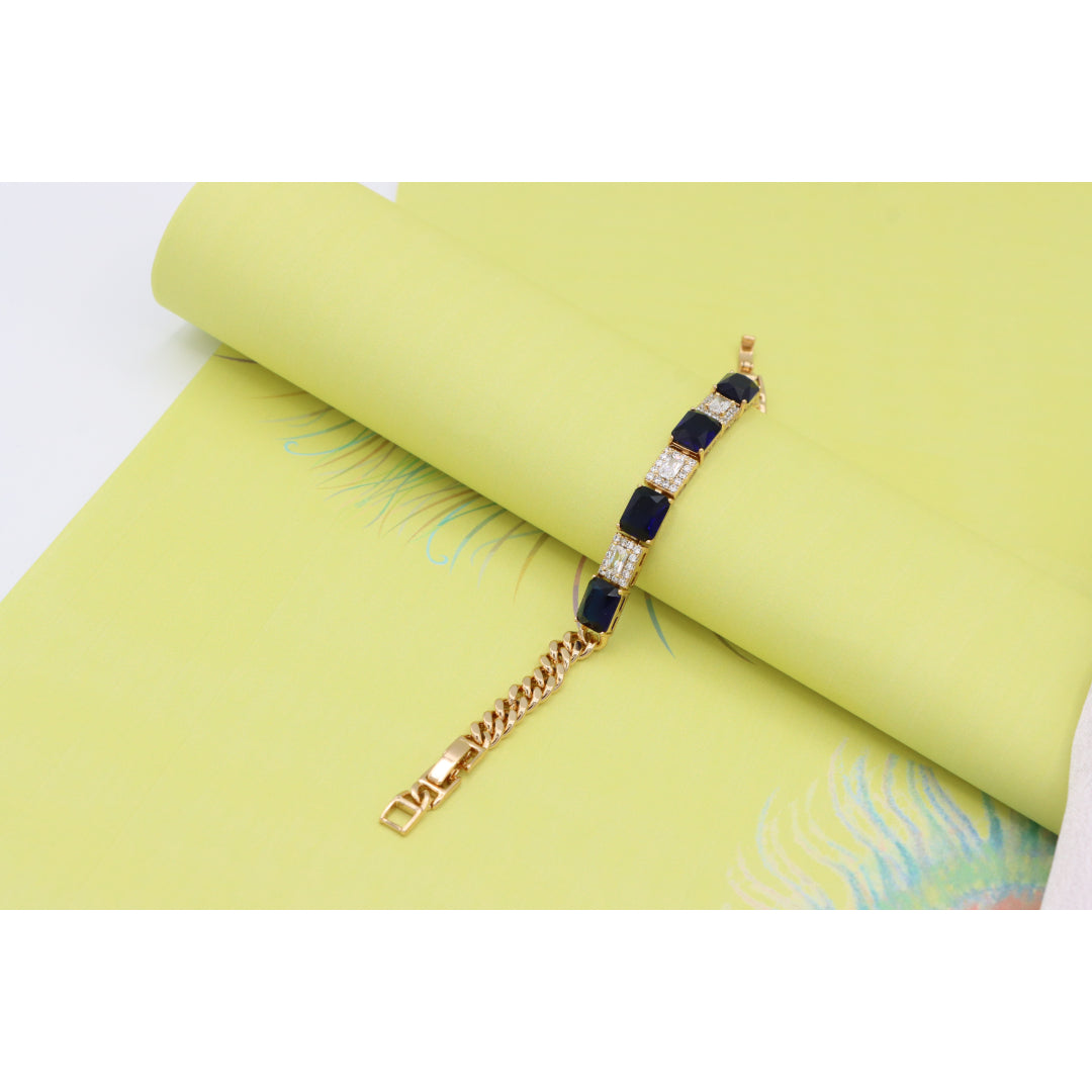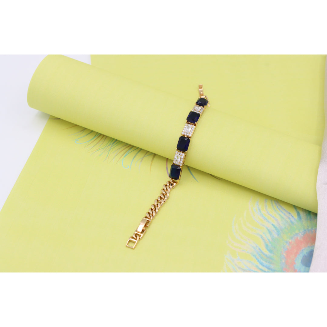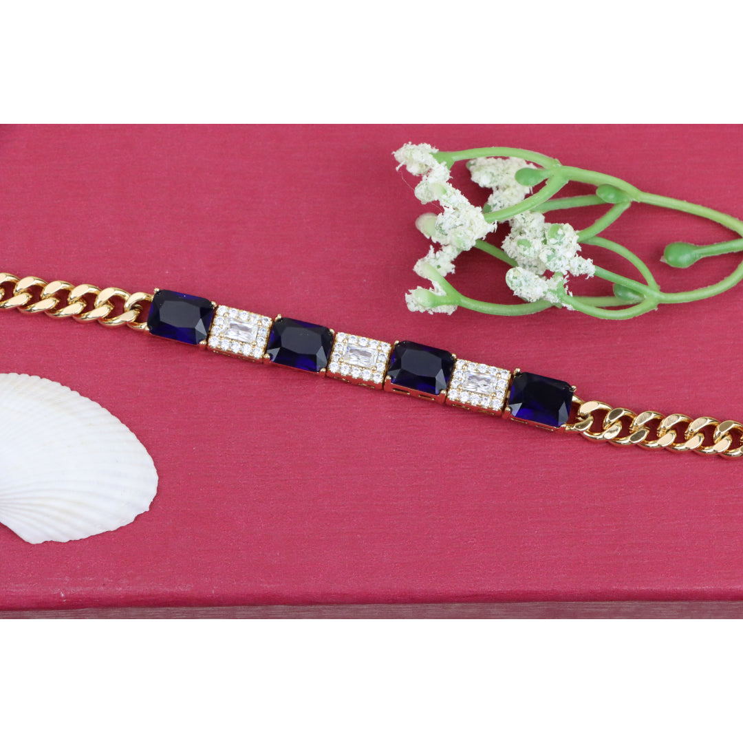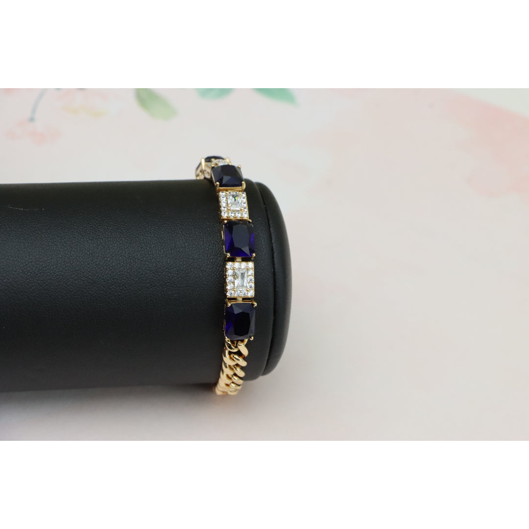 This elegant bracelet pairs rich sapphire-toned stones with sparkling white crystals, set in a sleek rose gold finish for a luxurious touch.