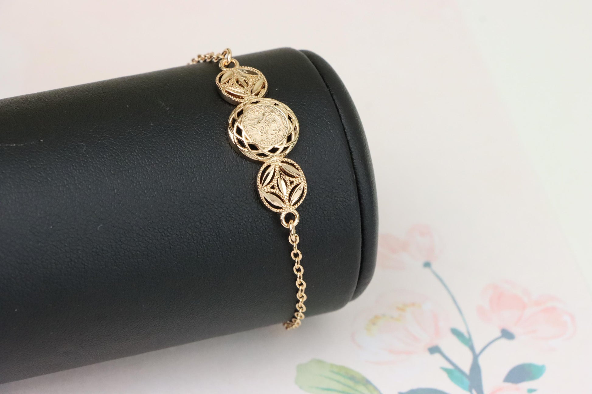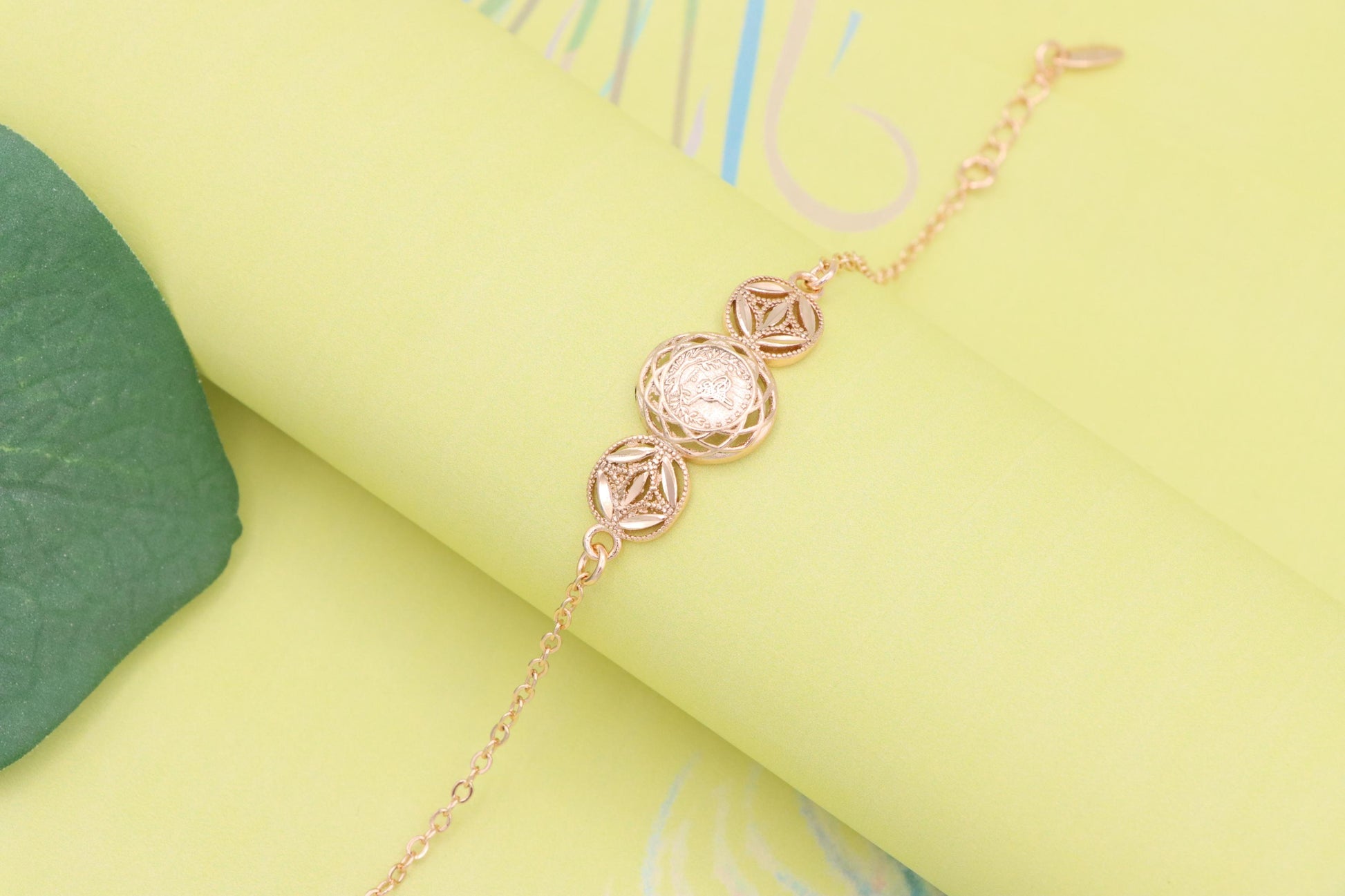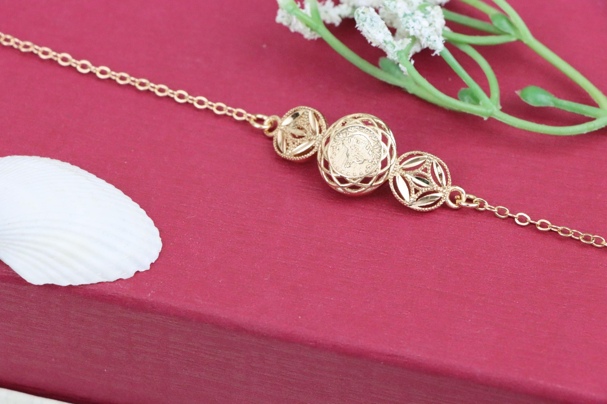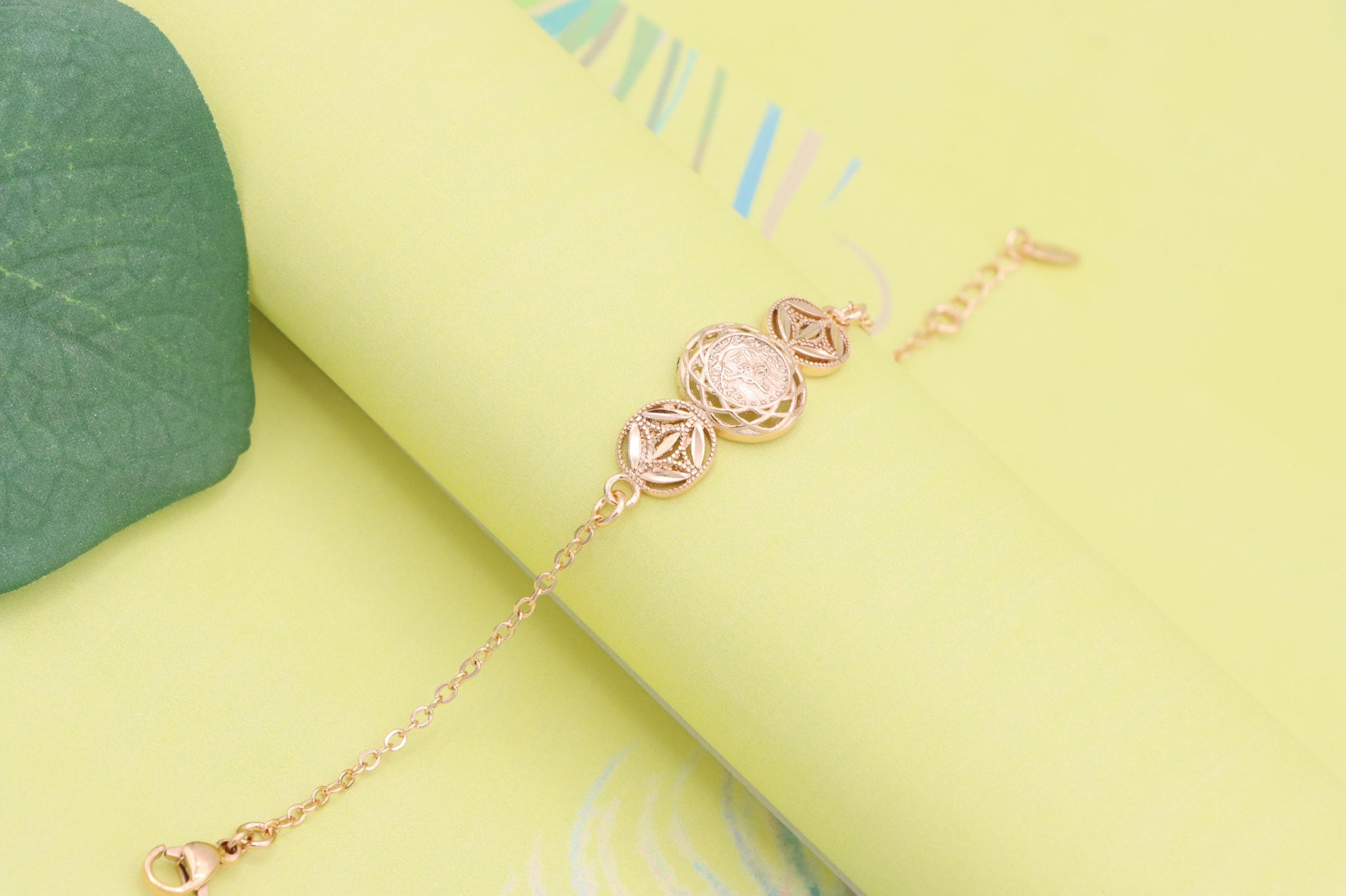 Elegant rose gold bracelet featuring a blend of intricate coin and leaf motifs, perfect for everyday glam or festive occasions.