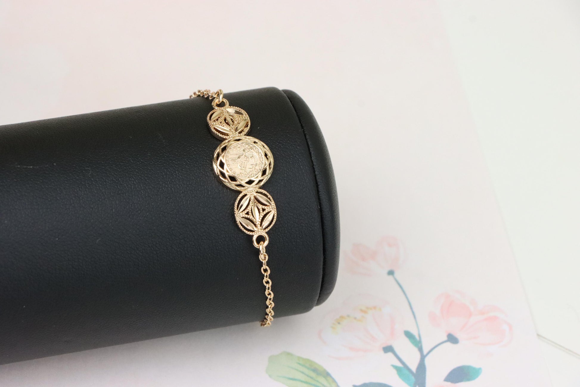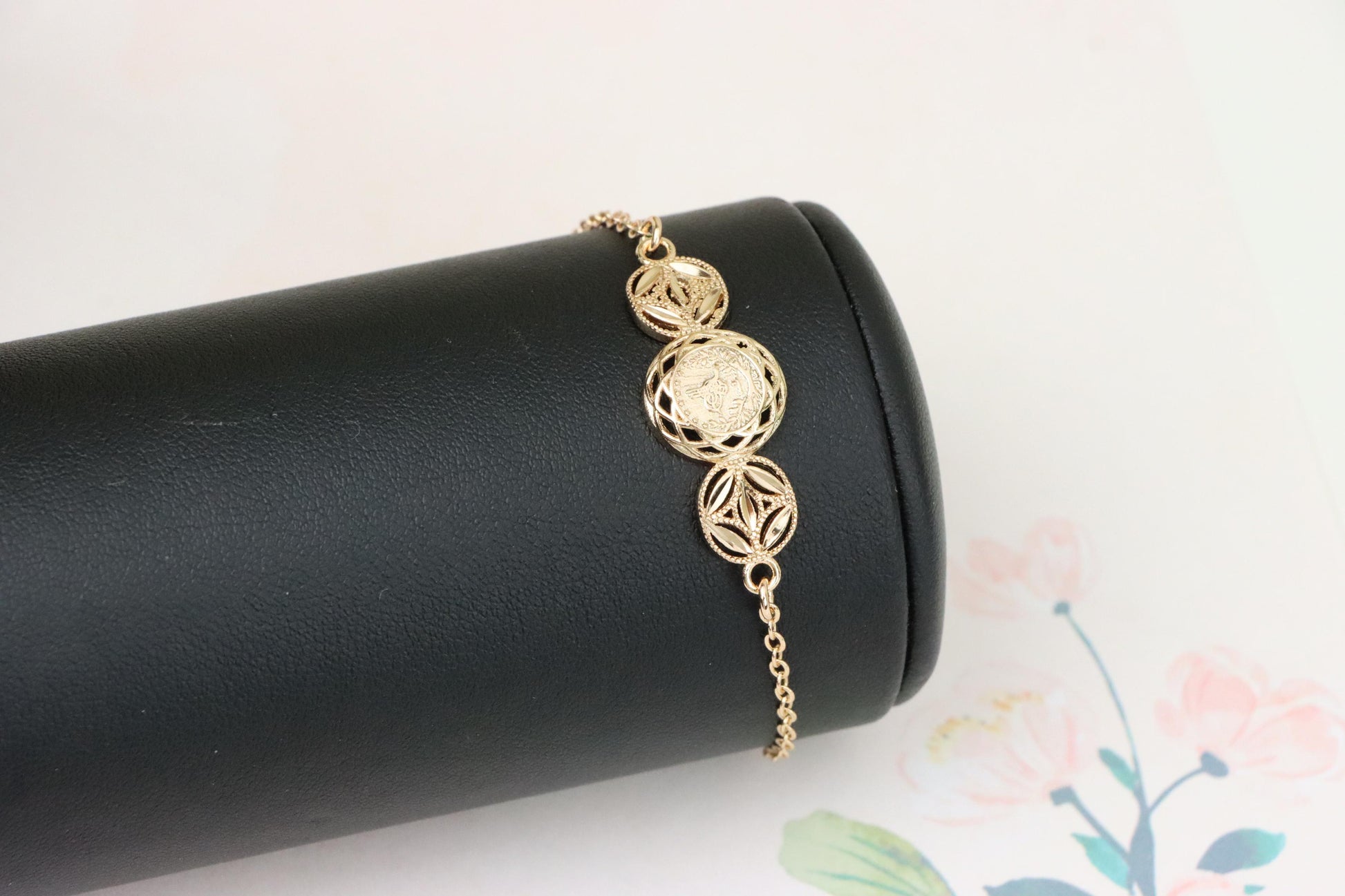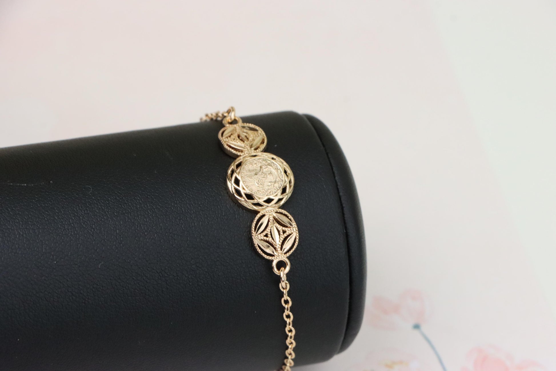 Elegant rose gold bracelet featuring a blend of intricate coin and leaf motifs, perfect for everyday glam or festive occasions.
