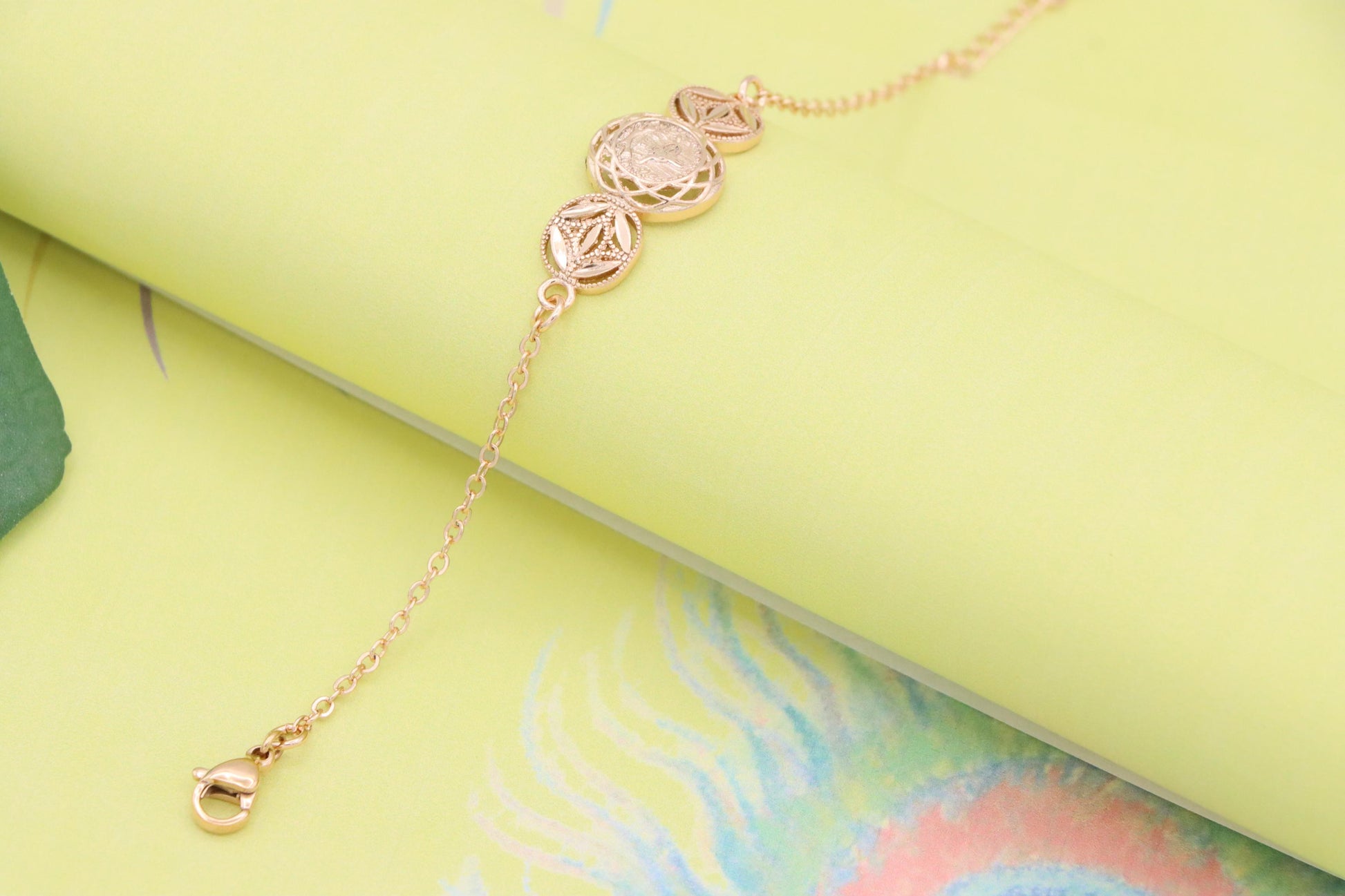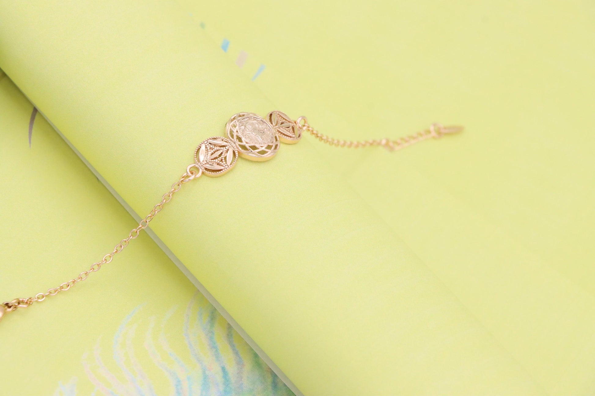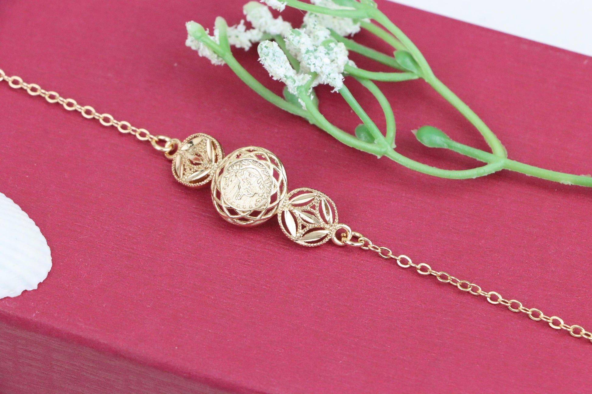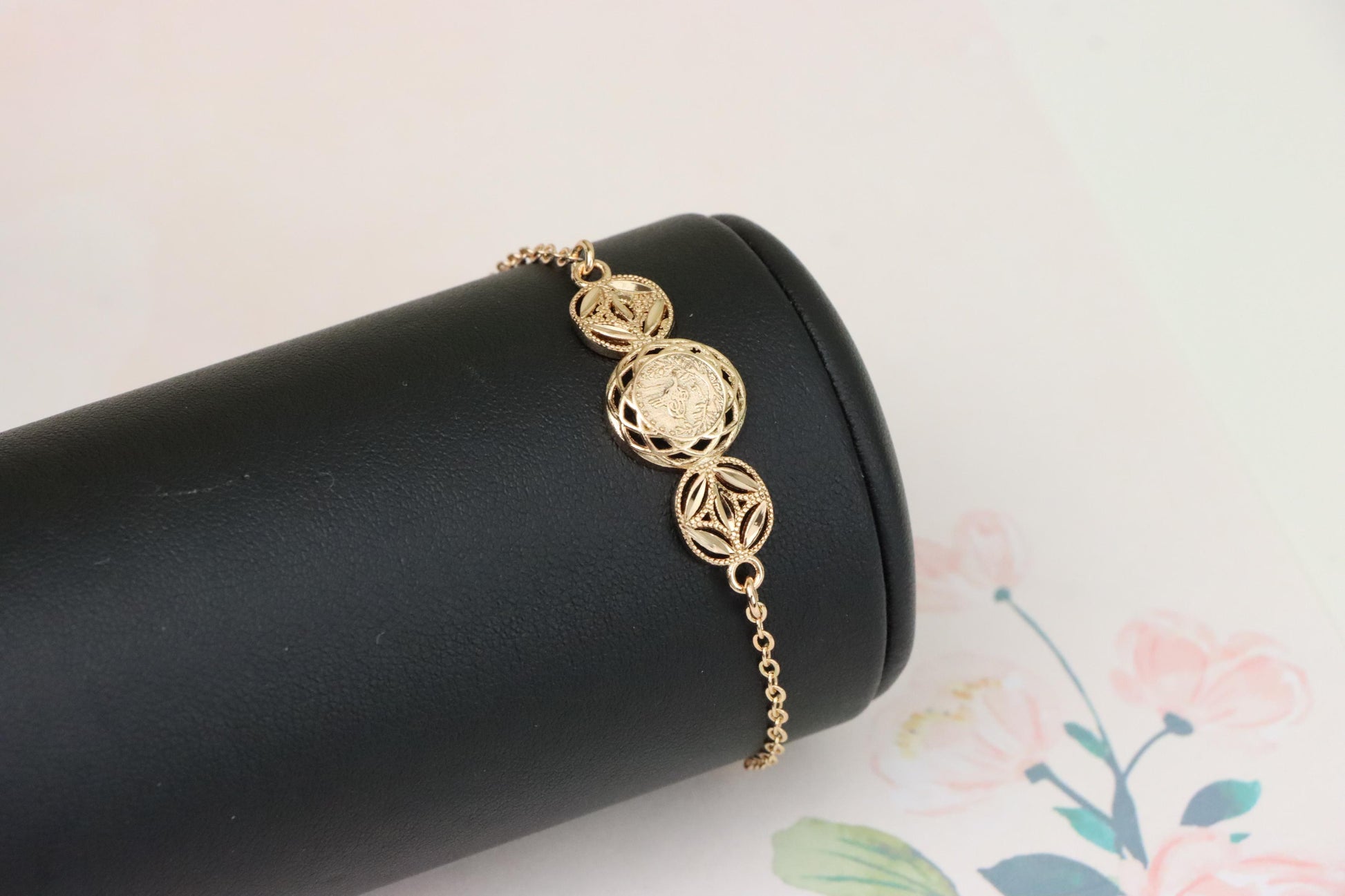 Elegant rose gold bracelet featuring a blend of intricate coin and leaf motifs, perfect for everyday glam or festive occasions.