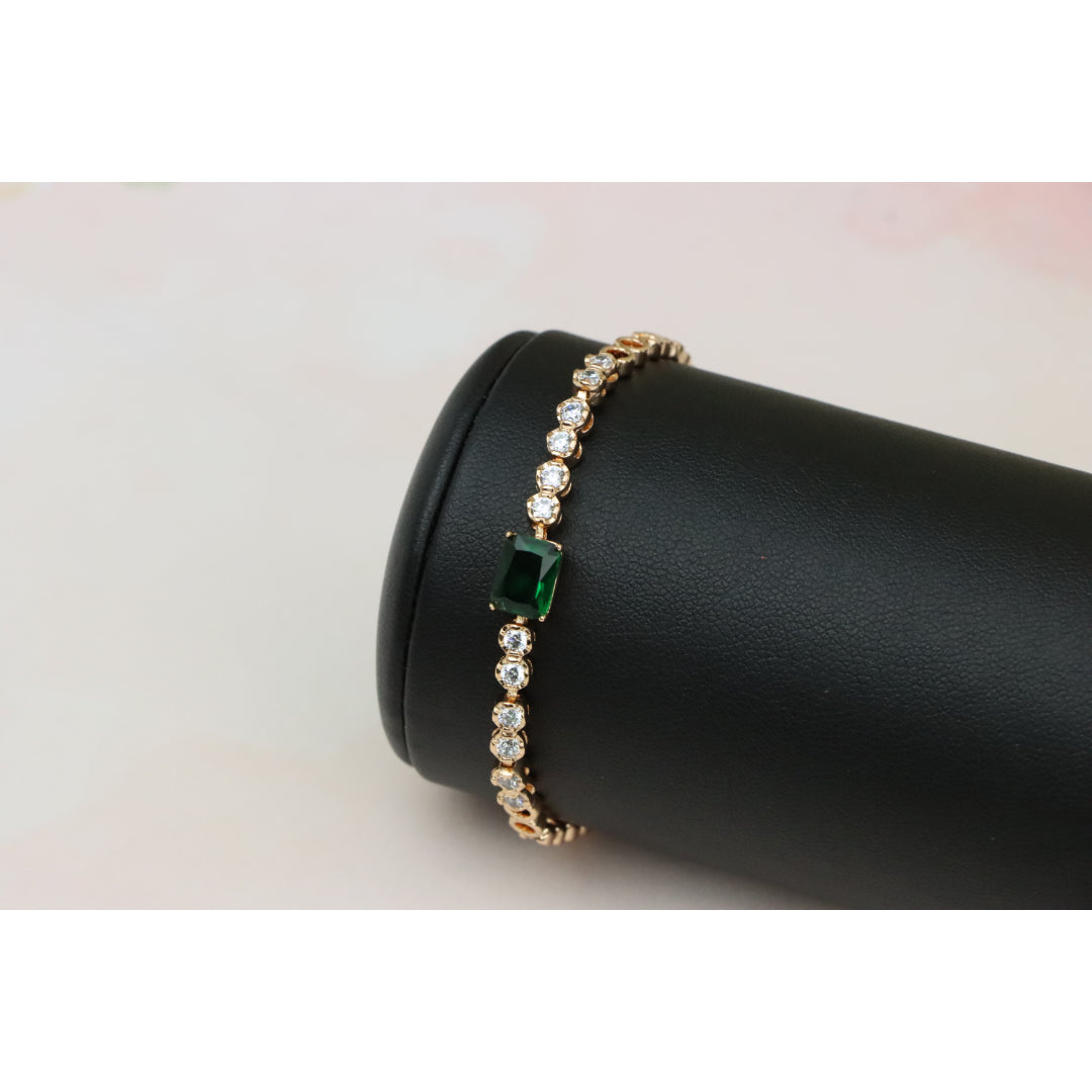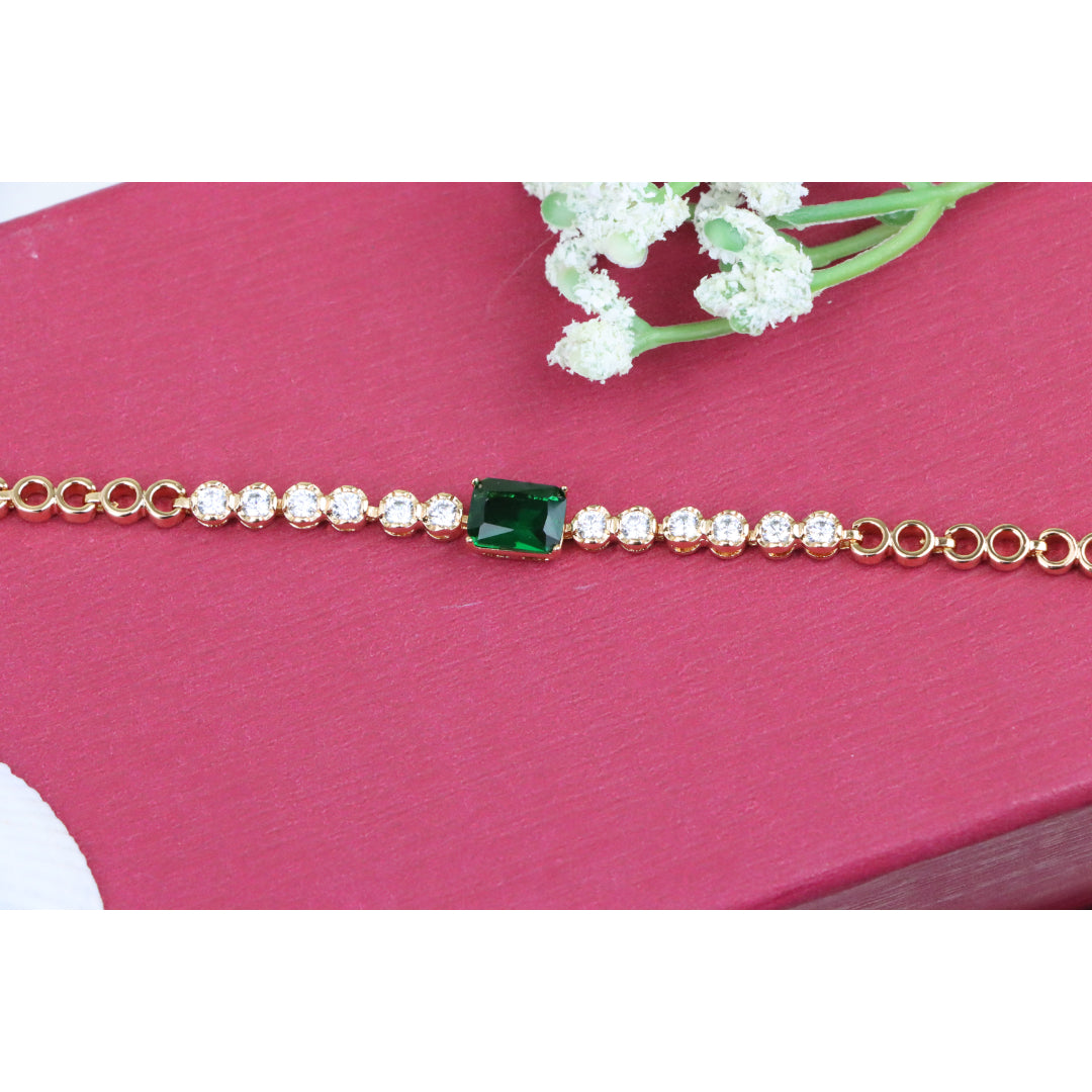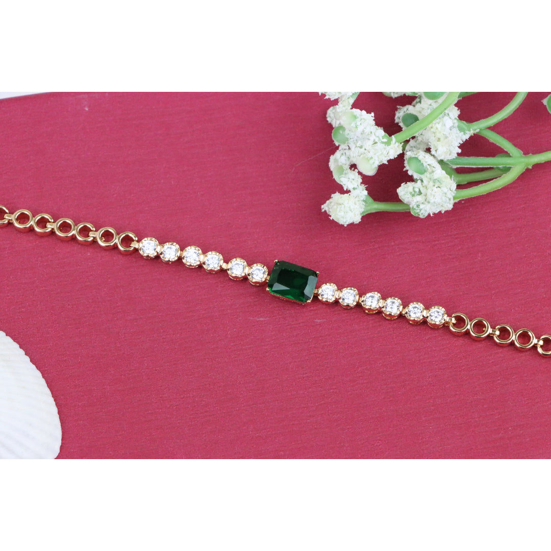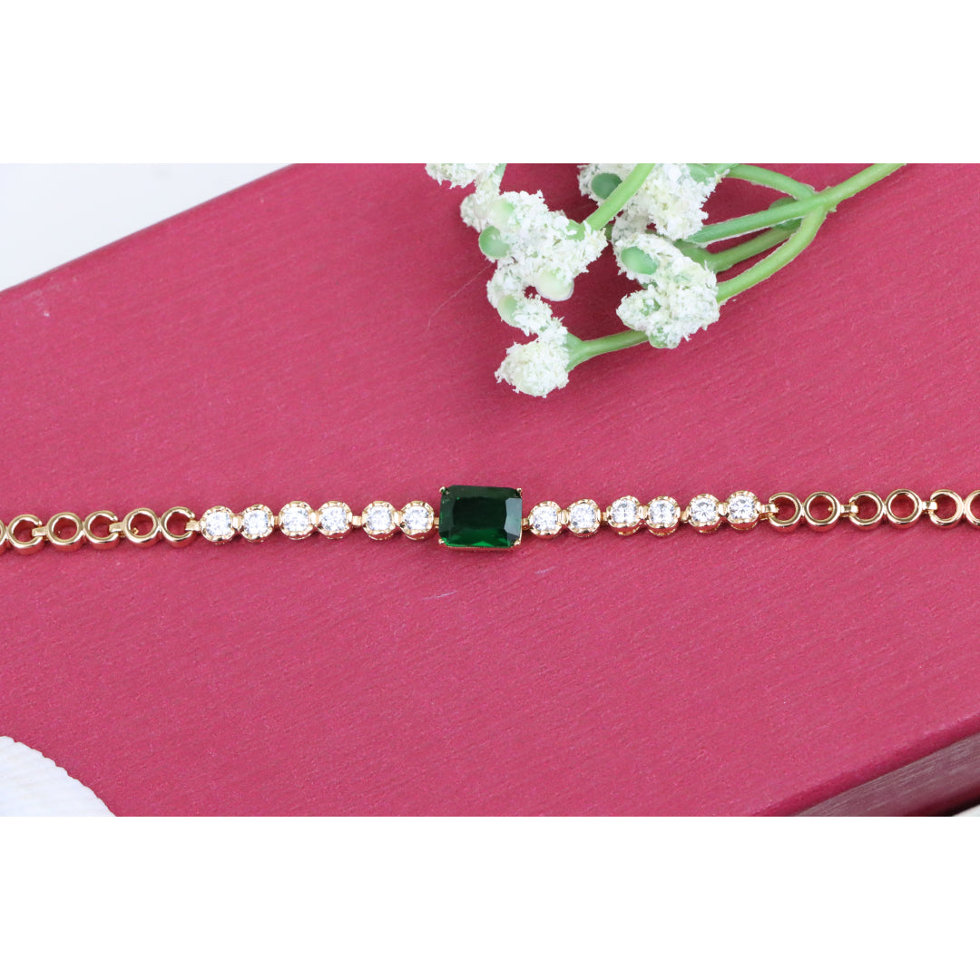 Elegant rose gold bracelet featuring a striking emerald green centerpiece and clear round crystals.