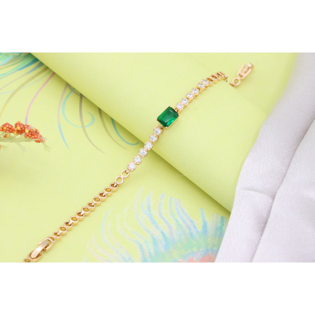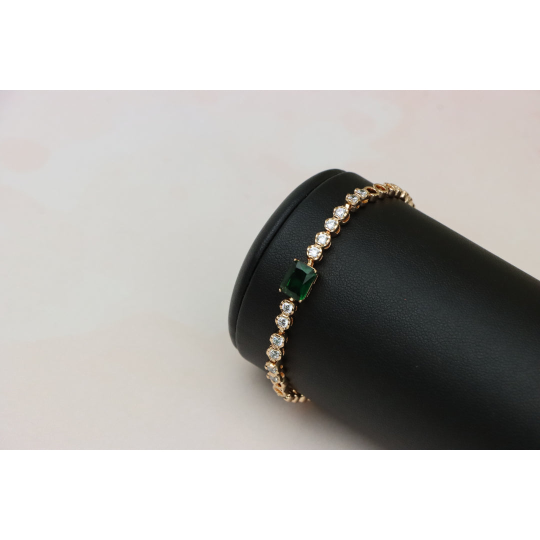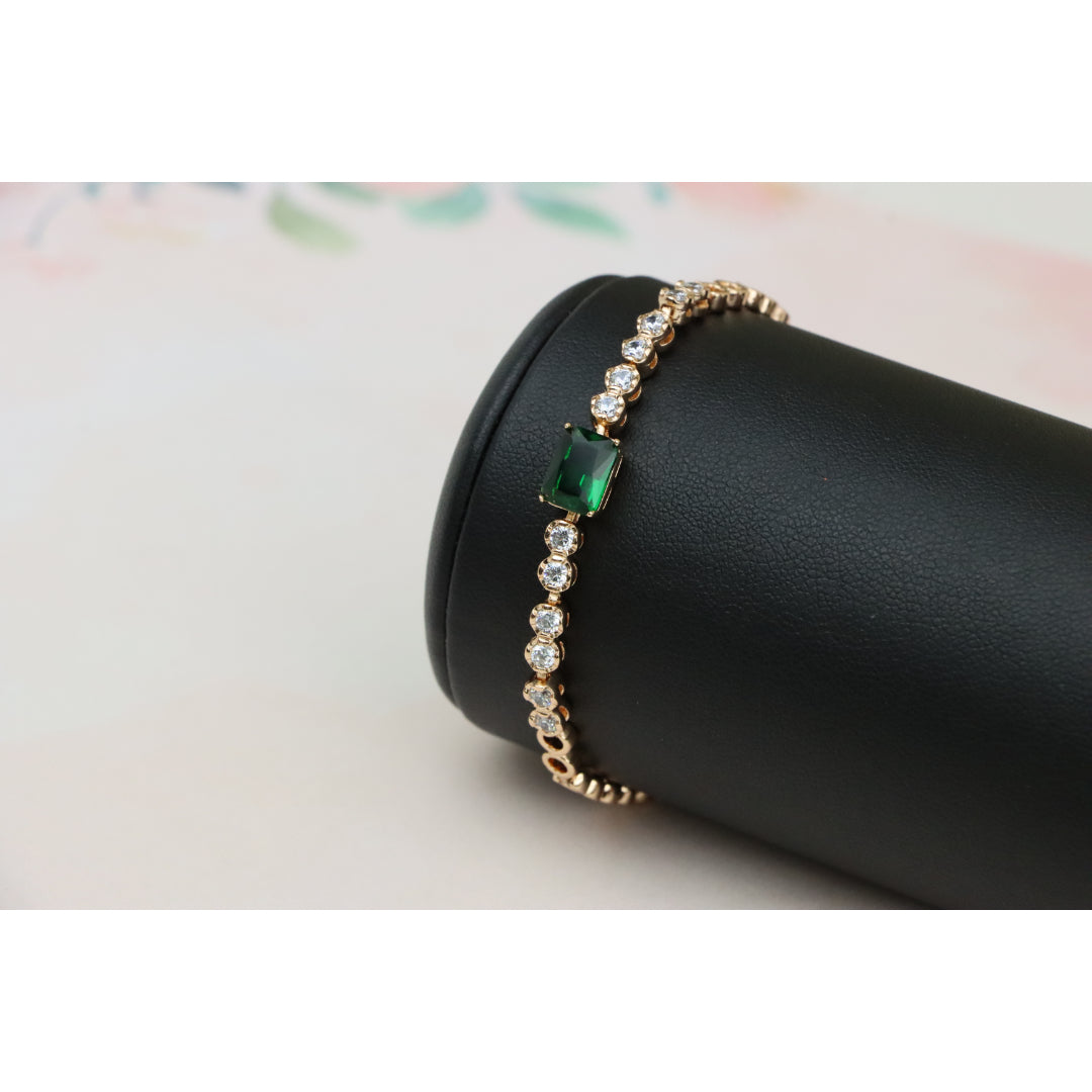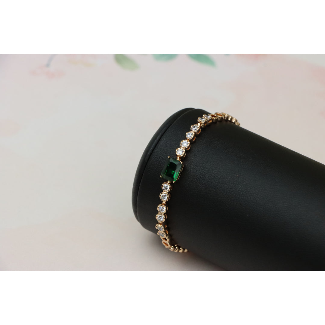 Elegant rose gold bracelet featuring a striking emerald green centerpiece and clear round crystals.