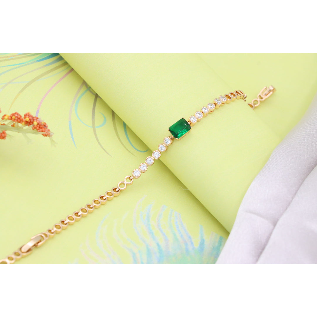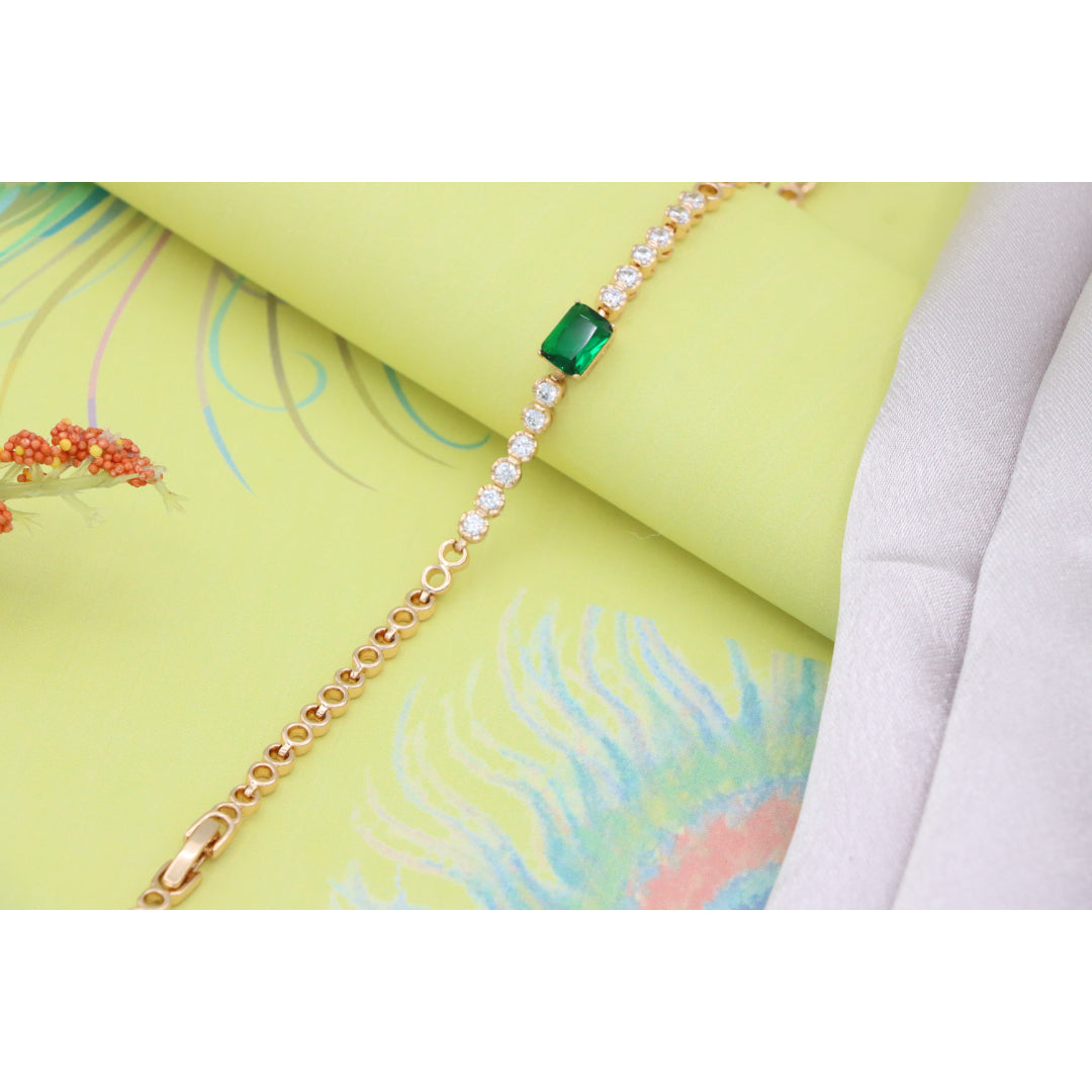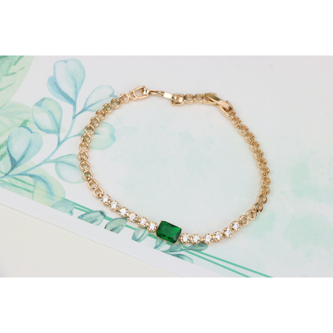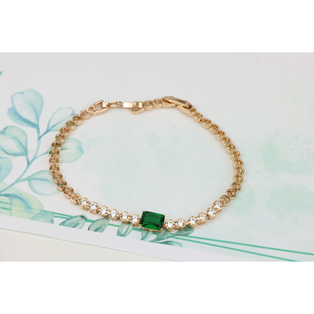 Elegant rose gold bracelet featuring a striking emerald green centerpiece and clear round crystals.