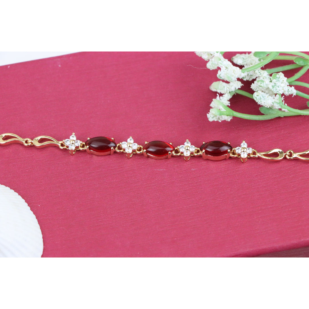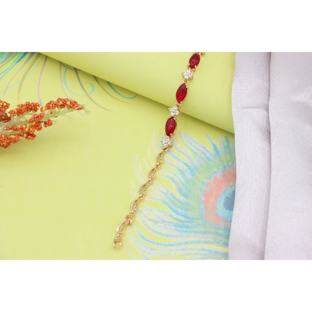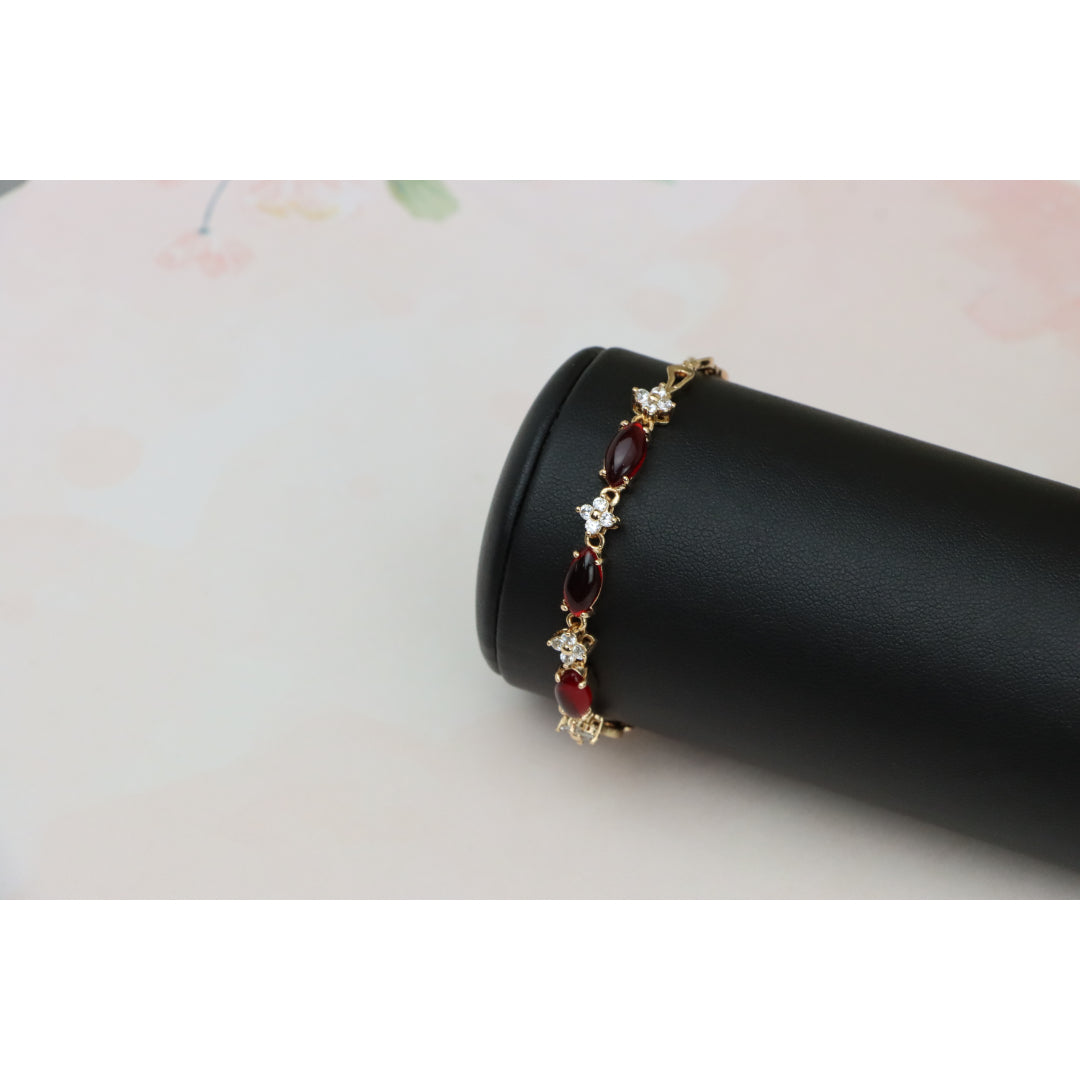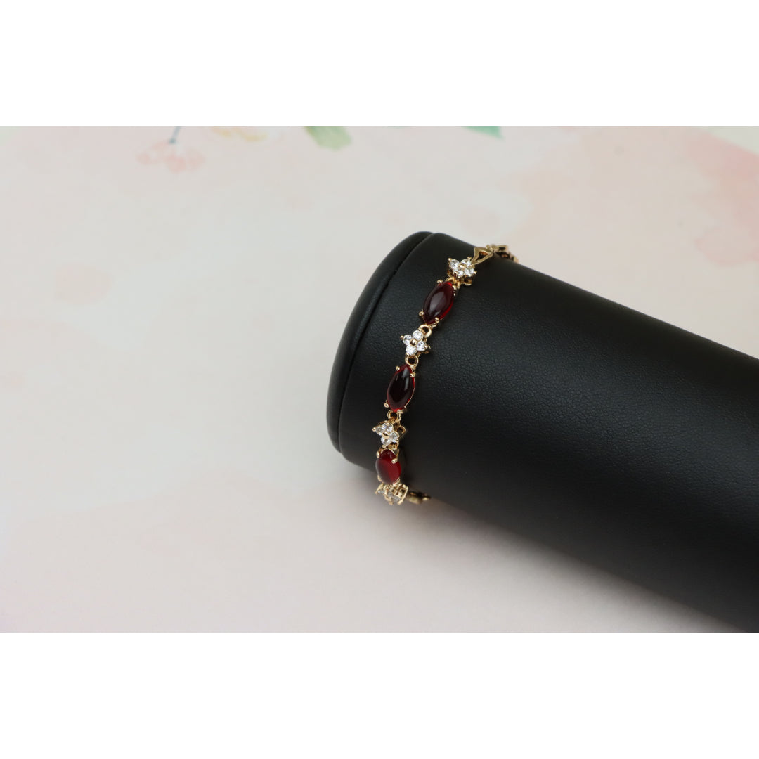 Grace your wrist with this stunning rose gold bracelet, highlighted by deep red stones and sparkling white accents for a timeless, elegant look.