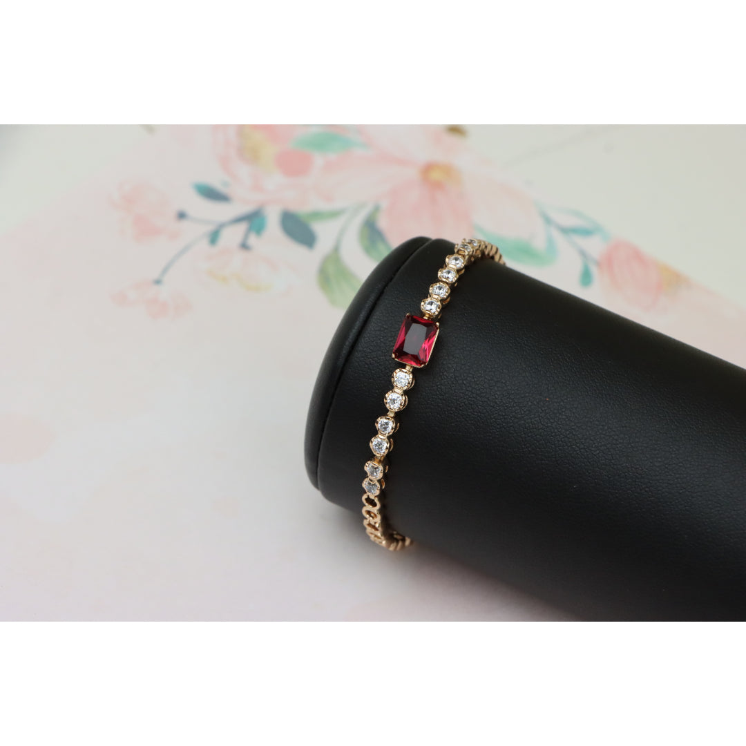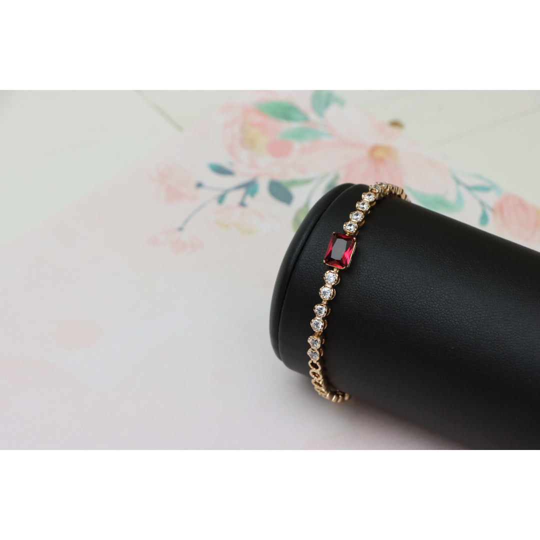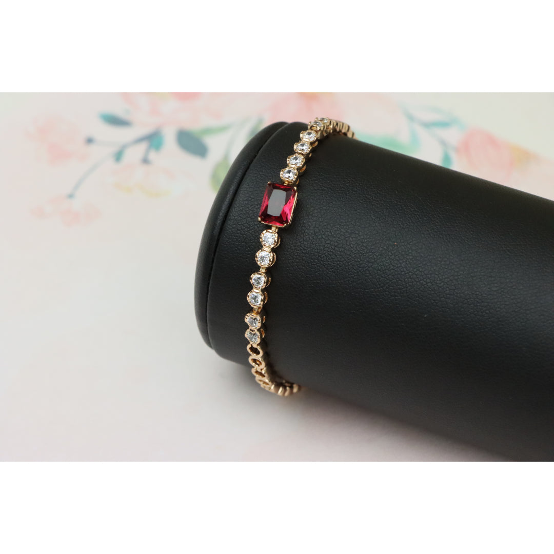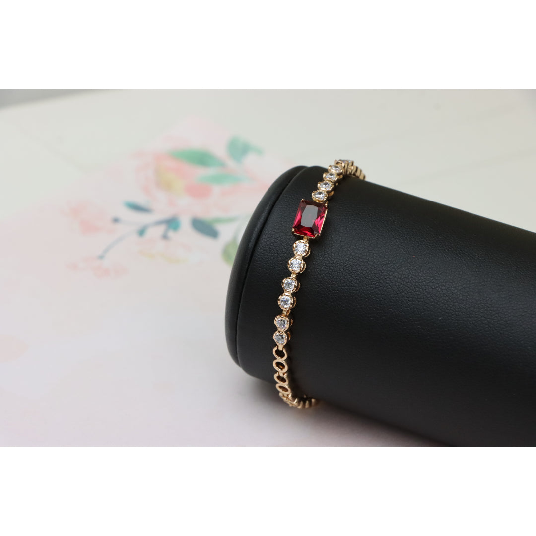 Stylish rose gold bracelet showcasing a deep ruby red stone and brilliant crystals.