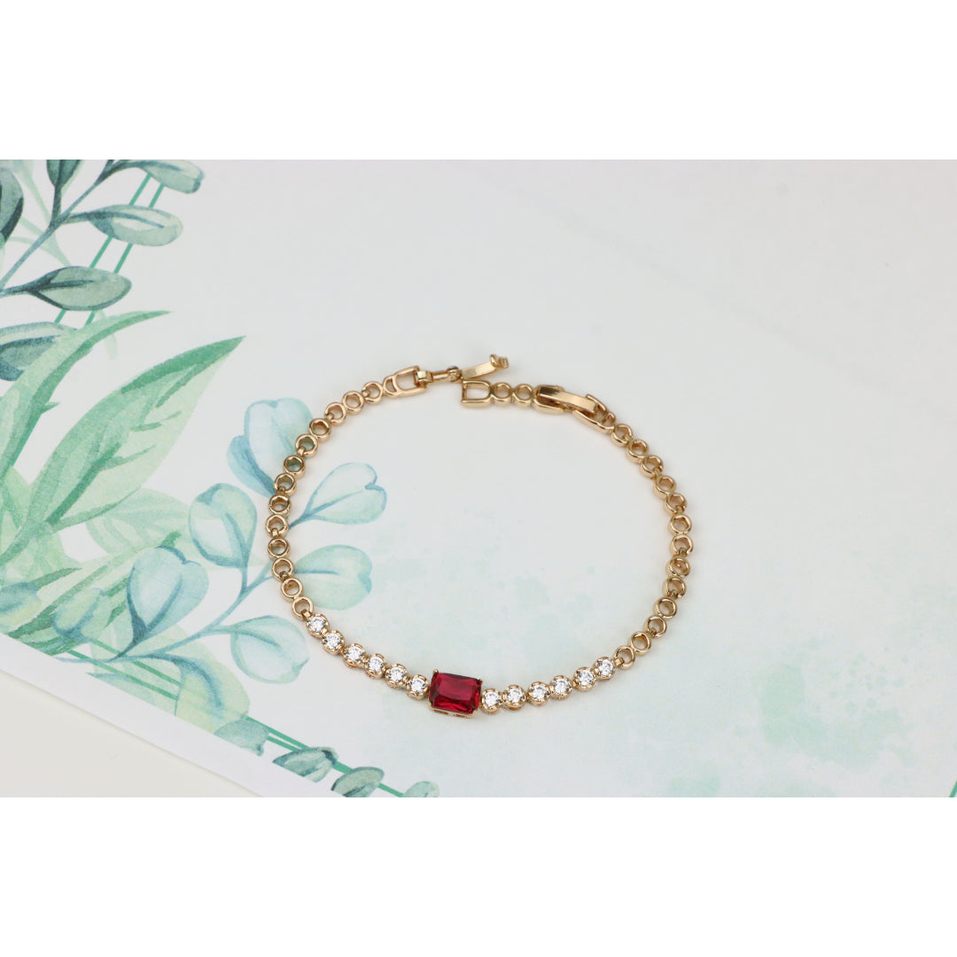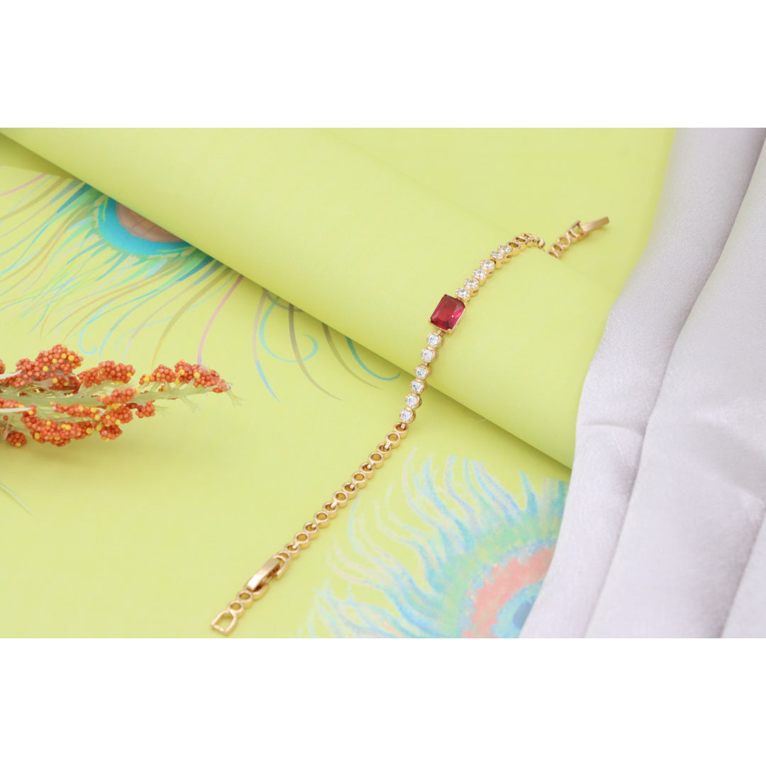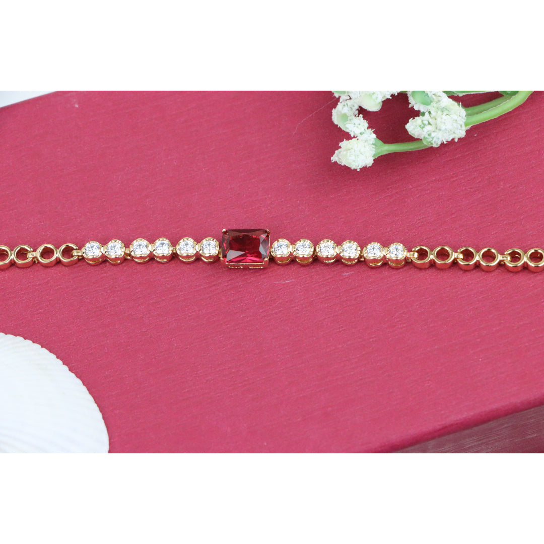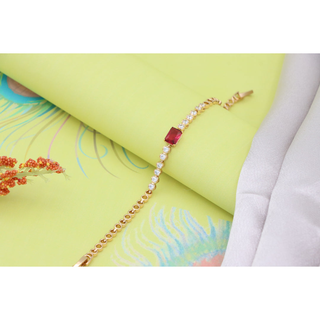 Stylish rose gold bracelet showcasing a deep ruby red stone and brilliant crystals.