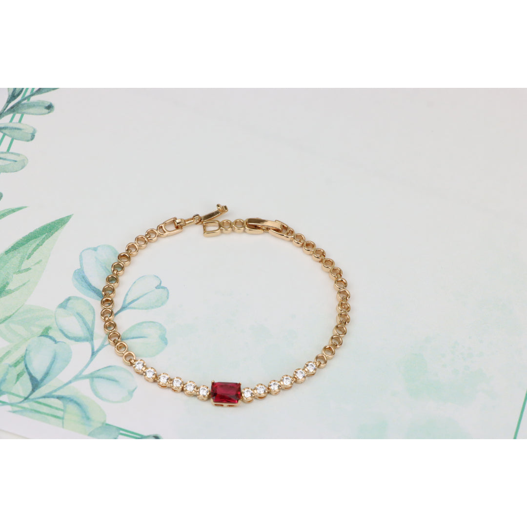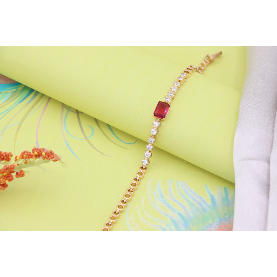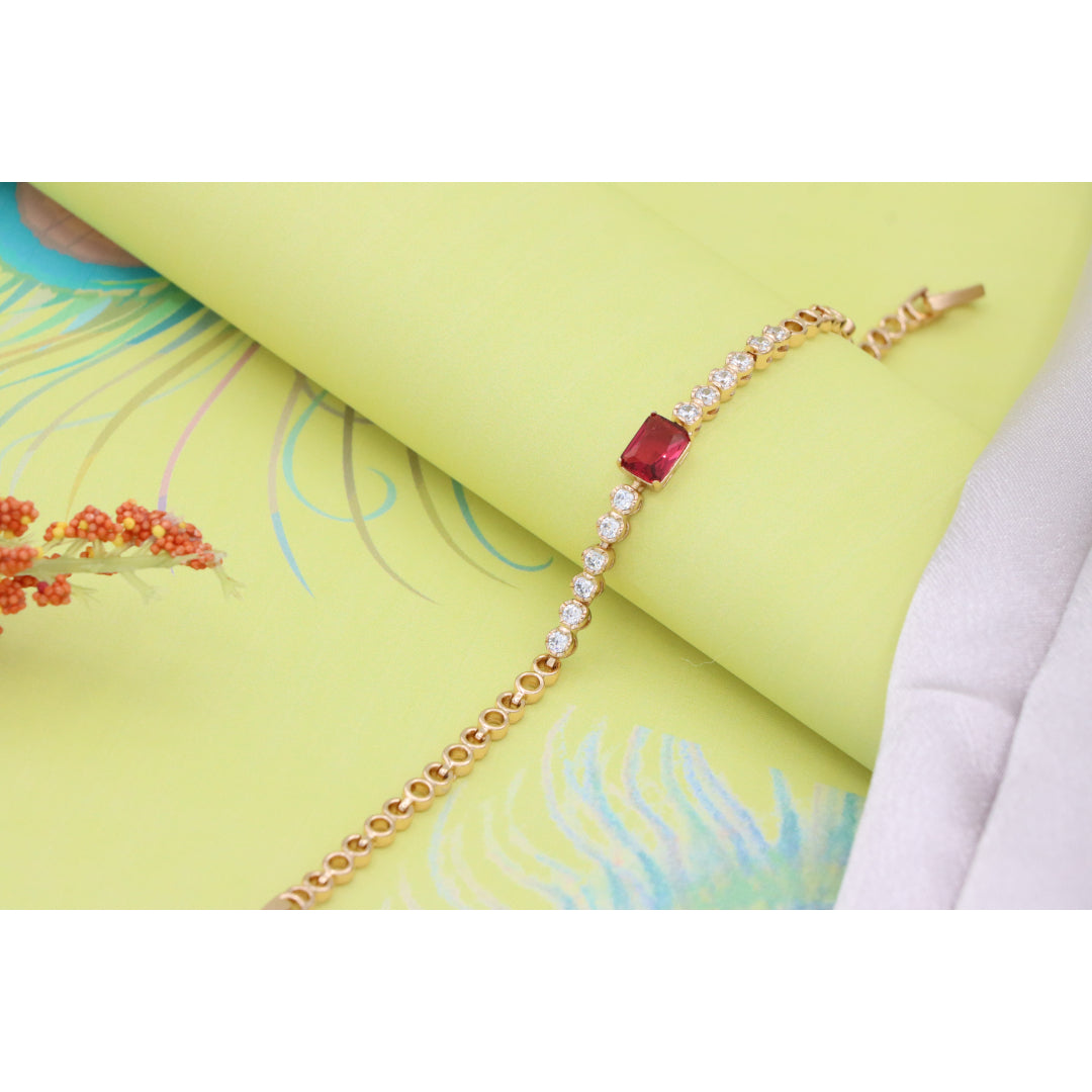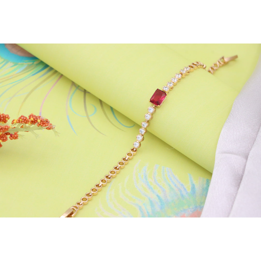 Stylish rose gold bracelet showcasing a deep ruby red stone and brilliant crystals.